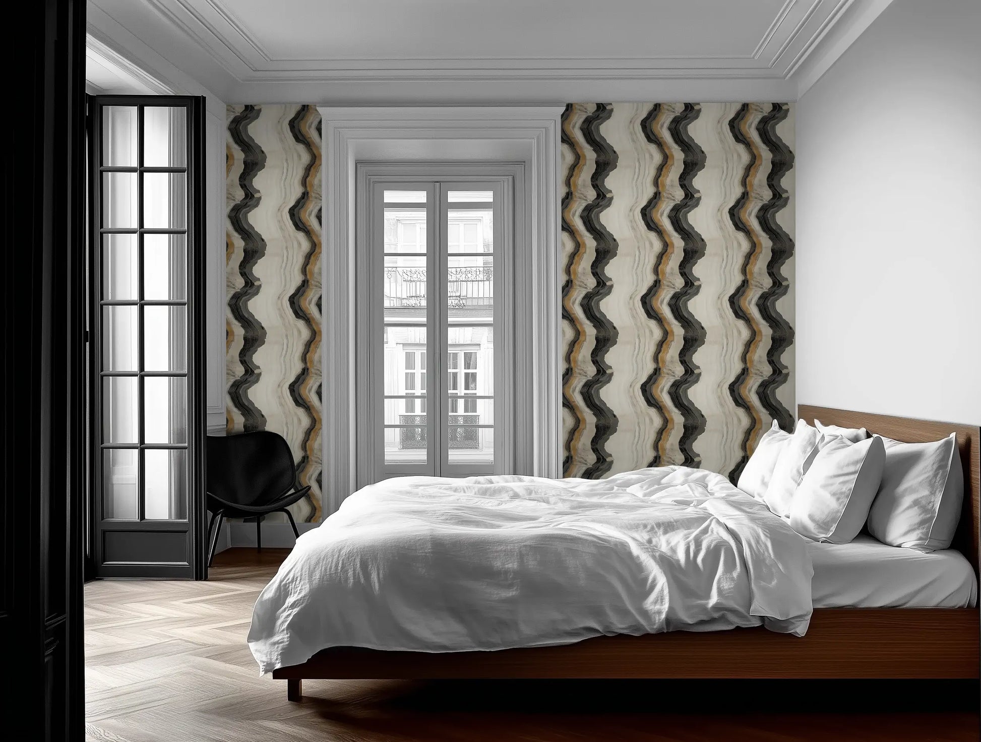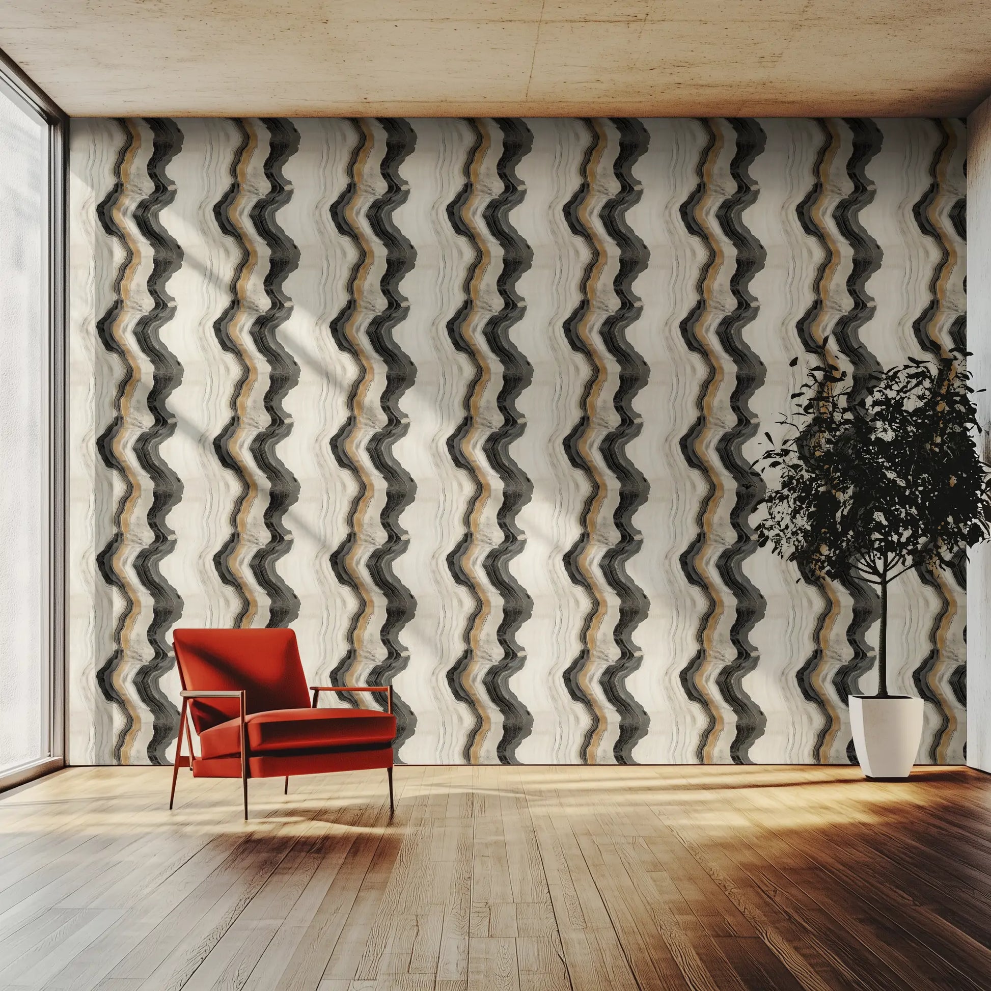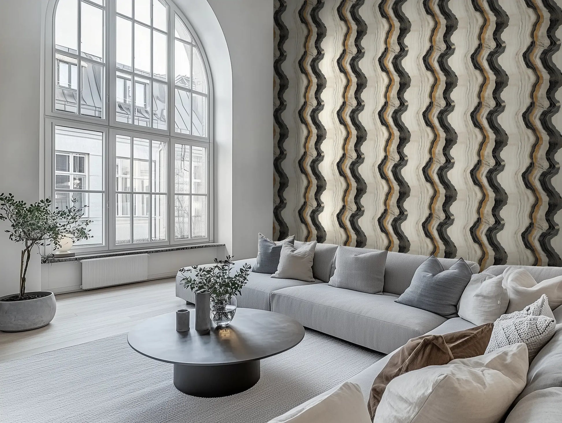 Nature is the ultimate sculptor, and Stratified Echo captures the fluid, organic movement of limestone cliffs eroded by time. Black, gold, and ivory layers ripple like geological echoes, each stratum telling a story of millennia. This design brings the grandeur of natural rock formations into the home, grounding spaces in ancient strength and quiet elegance.