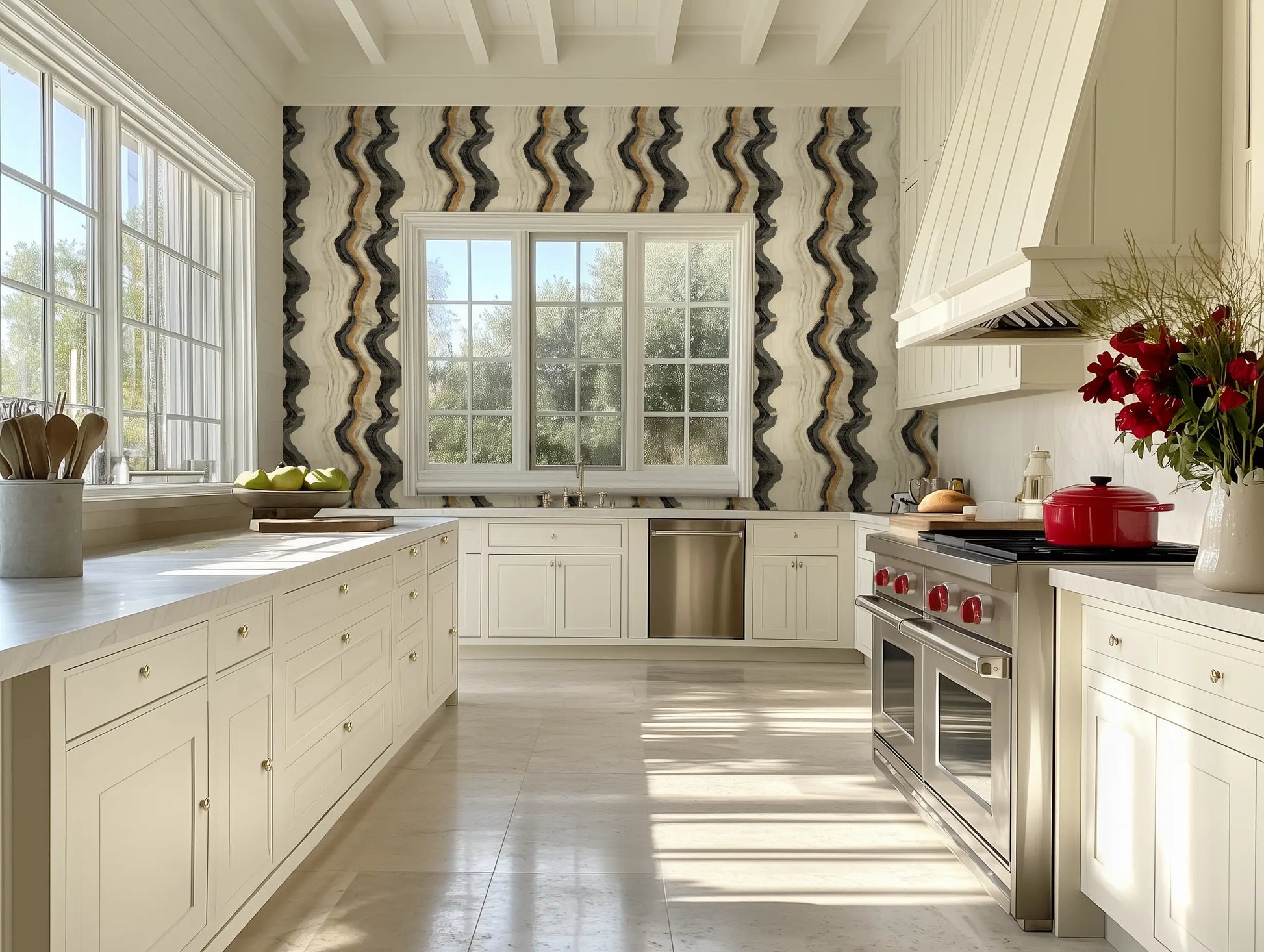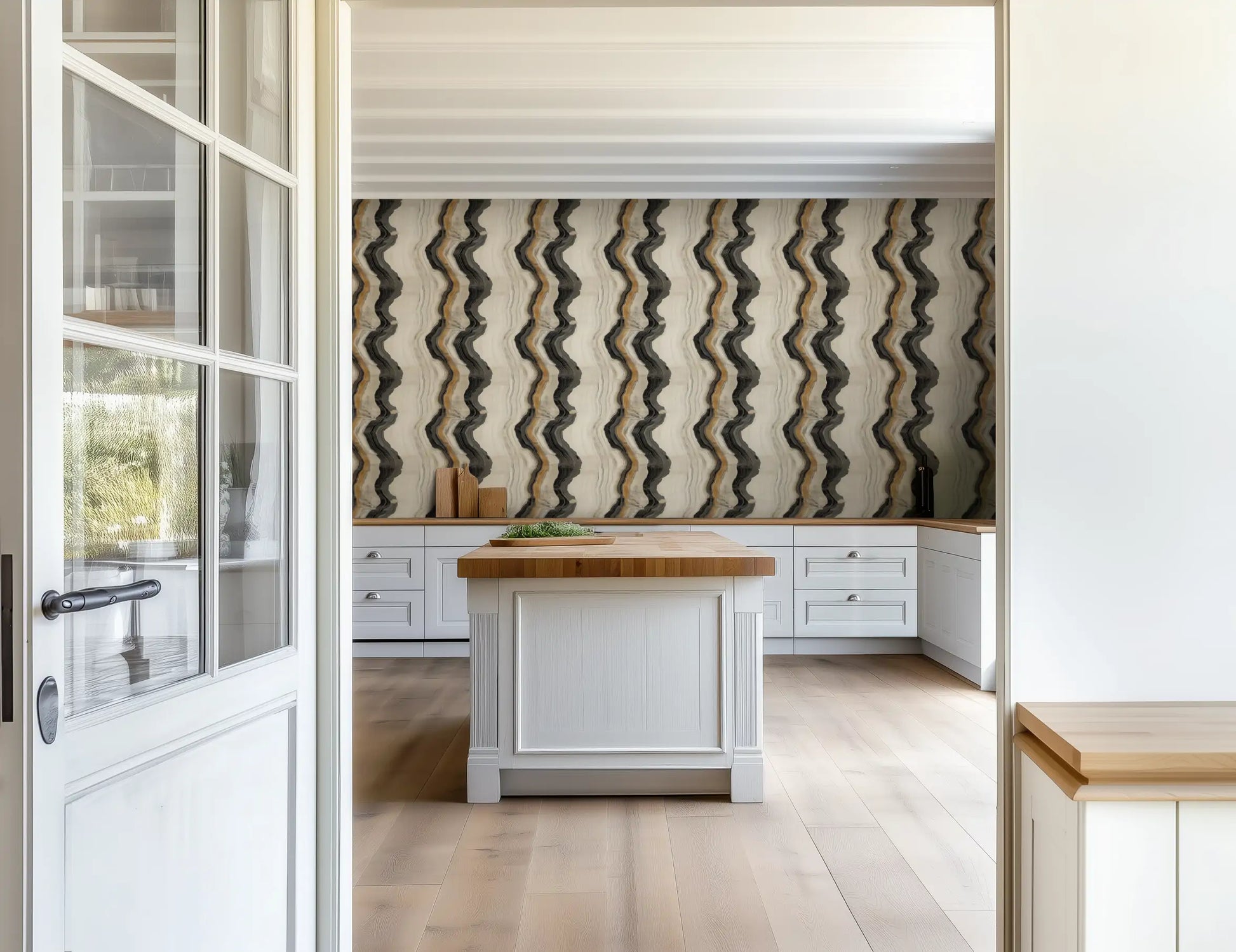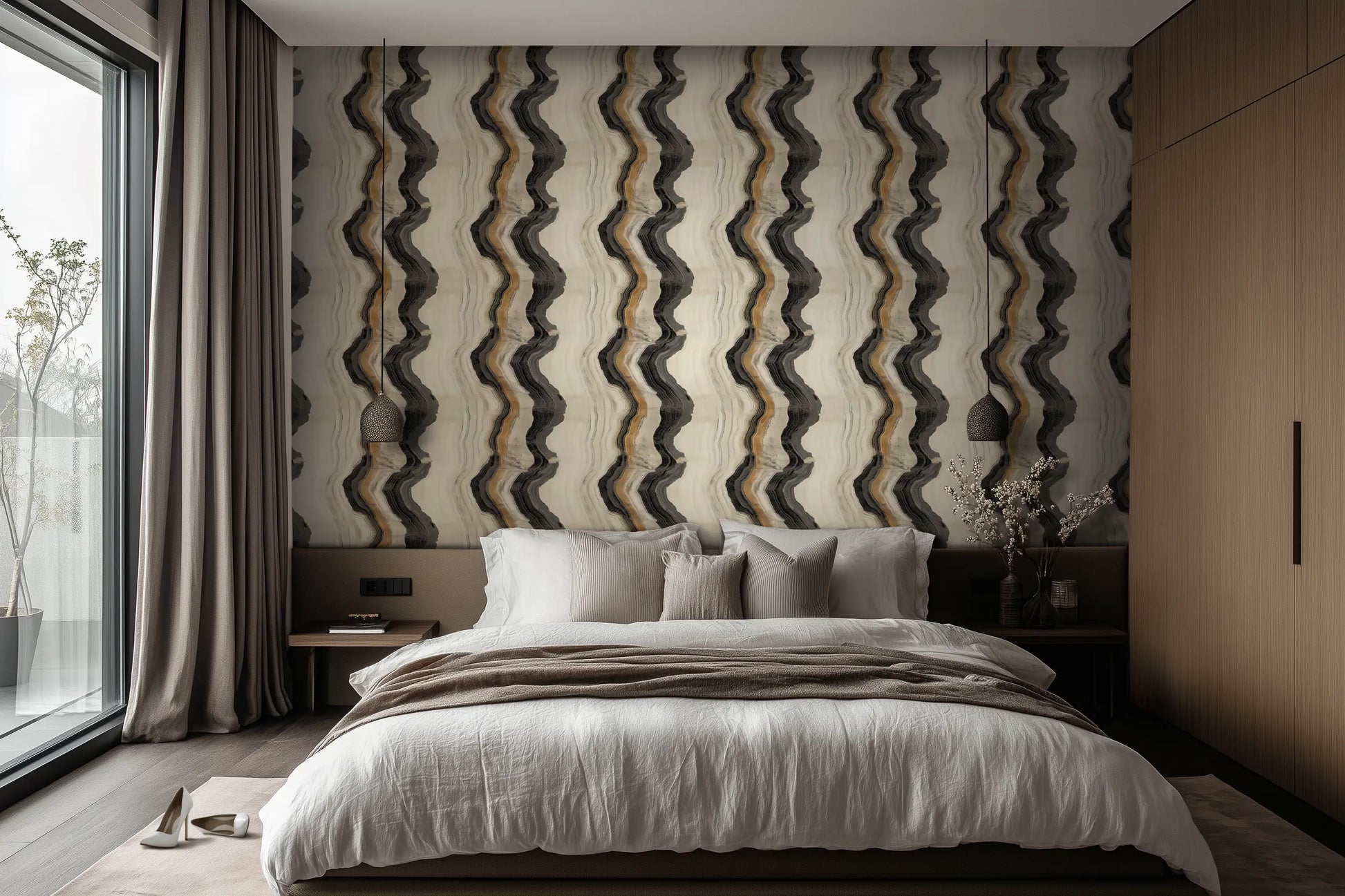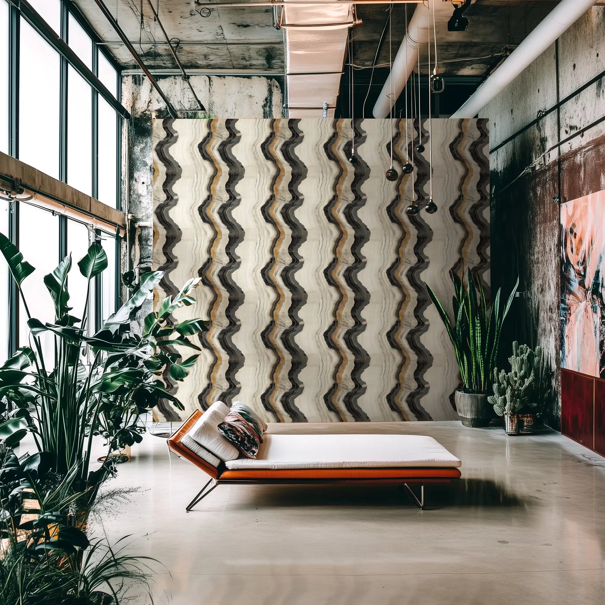 Nature is the ultimate sculptor, and Stratified Echo captures the fluid, organic movement of limestone cliffs eroded by time. Black, gold, and ivory layers ripple like geological echoes, each stratum telling a story of millennia. This design brings the grandeur of natural rock formations into the home, grounding spaces in ancient strength and quiet elegance.