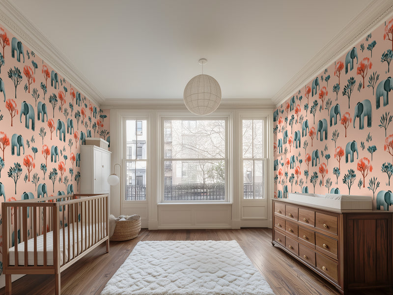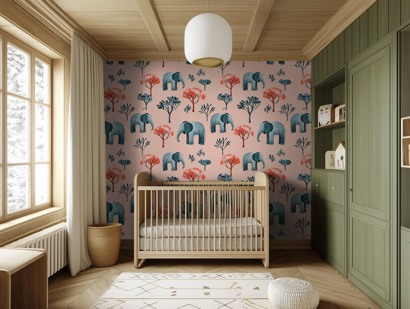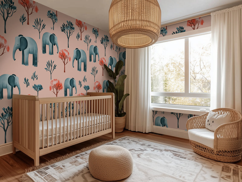 The blush background brings warmth without being overly feminine, while the blue elephants offer bold contrast and balance. It’s playful but polished—ideal for modern kids’ spaces.