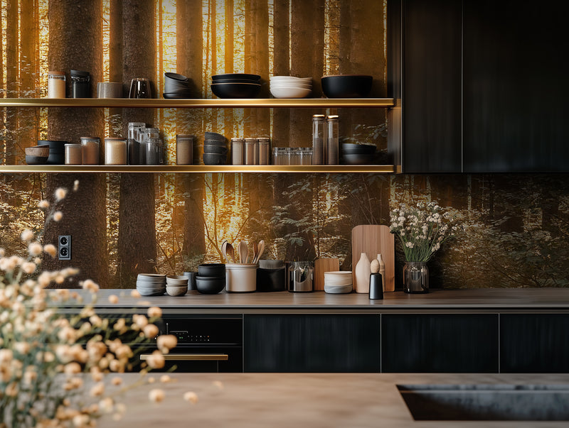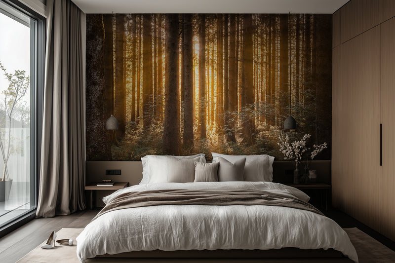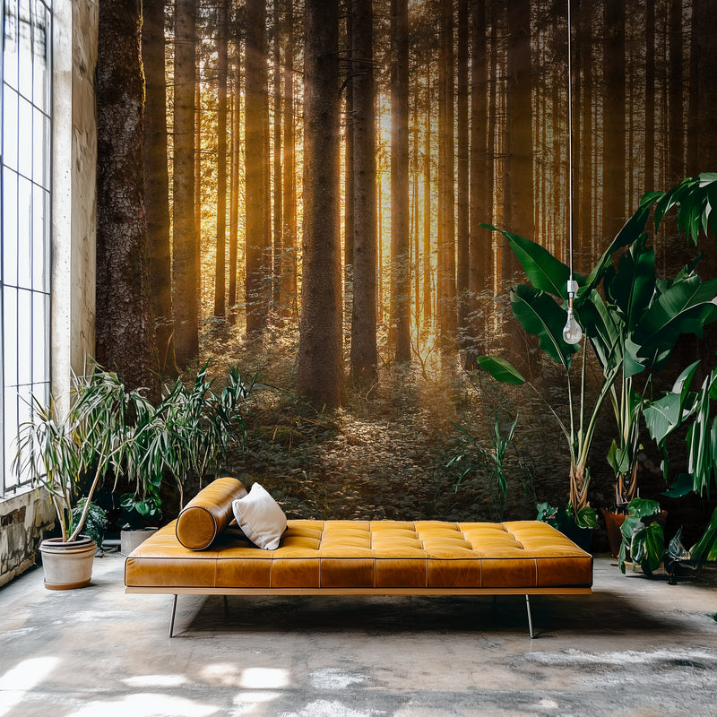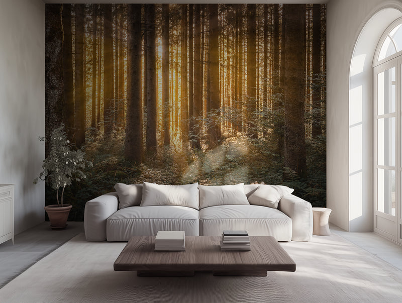 Sunlight glows between tall, golden trunks, turning the forest into something ethereal. Amberline is warmth in vertical form—a place where the light lingers a little longer. This golden forest wallpaper fills your space with that slow, golden energy that feels like comfort you can see.