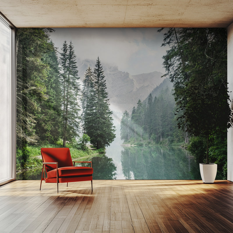 A still lake mirrors the pines perfectly, framed by mountains and light. Clearpine is all clarity and reflection—a place where the air feels cleaner and time stretches out. This peaceful lake and forest wallpaper brings that breath of fresh air indoors, making your space feel clear-minded, steady, and grounded in calm.