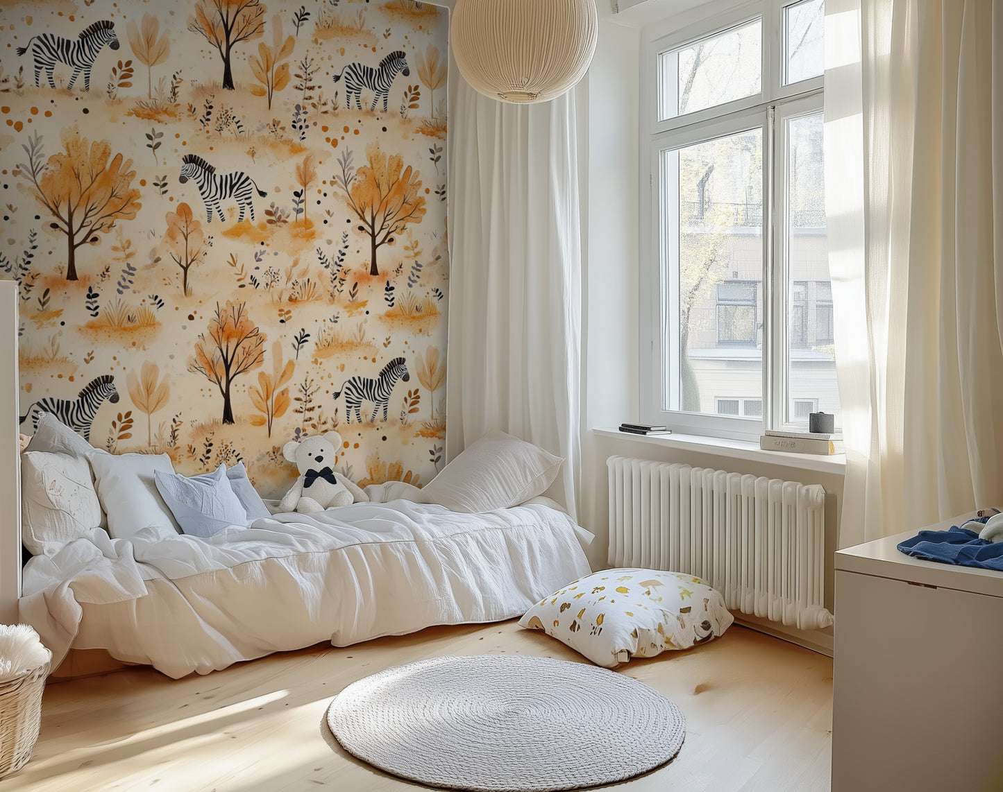 The same iconic stripes, now set in a fall-toned forest. Zebra Grove (Autumn) brings warmth and movement to the walls with a palette of ochres, rusts, and golden trees. It’s where the savanna meets storybook season.