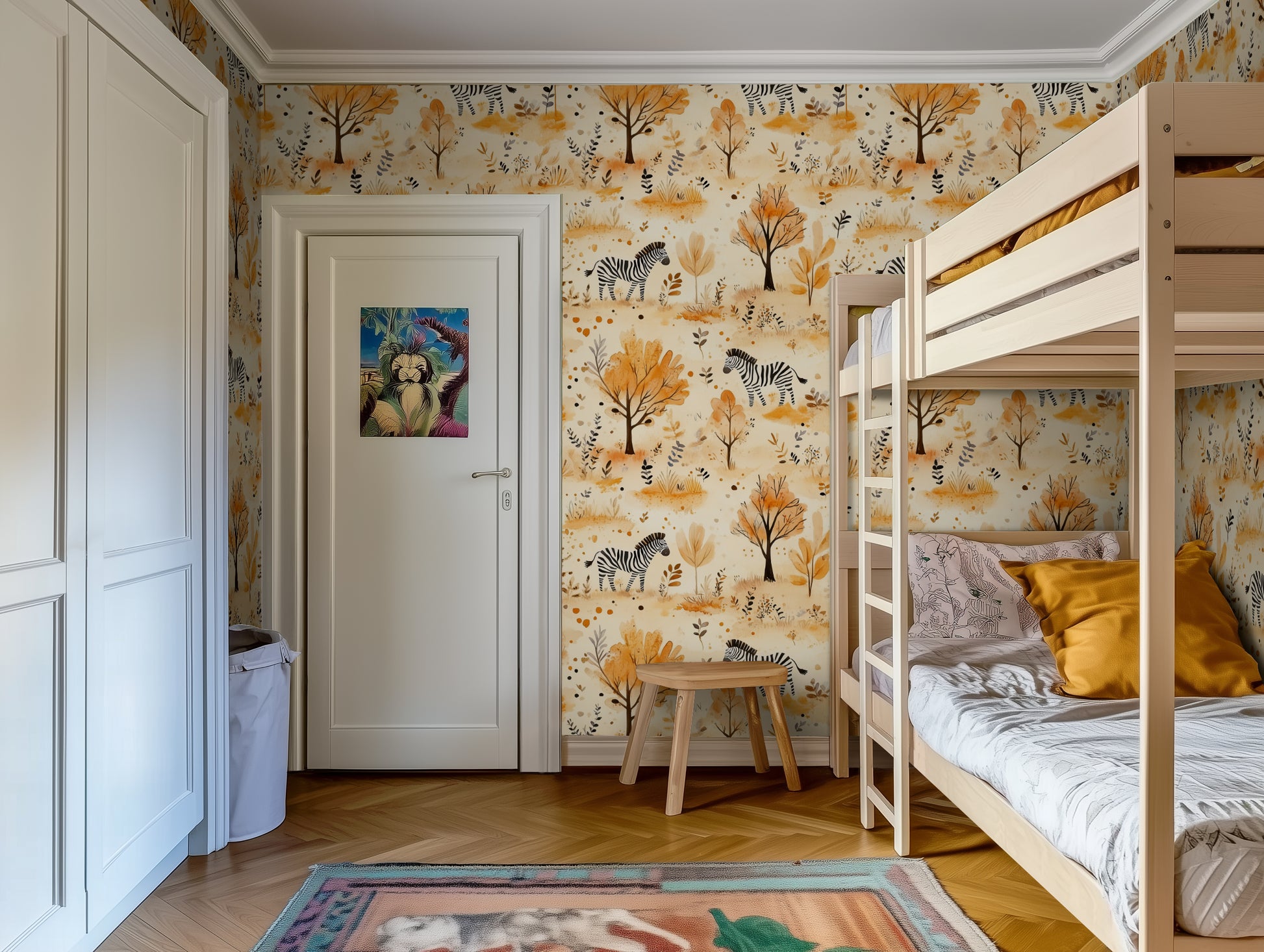 Earthy seasonal palettes are becoming a go-to in kids' interiors, and this wallpaper brings in autumn vibes without relying on pumpkins or leaves—just animals, trees, and beautiful color.