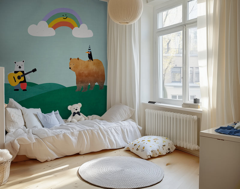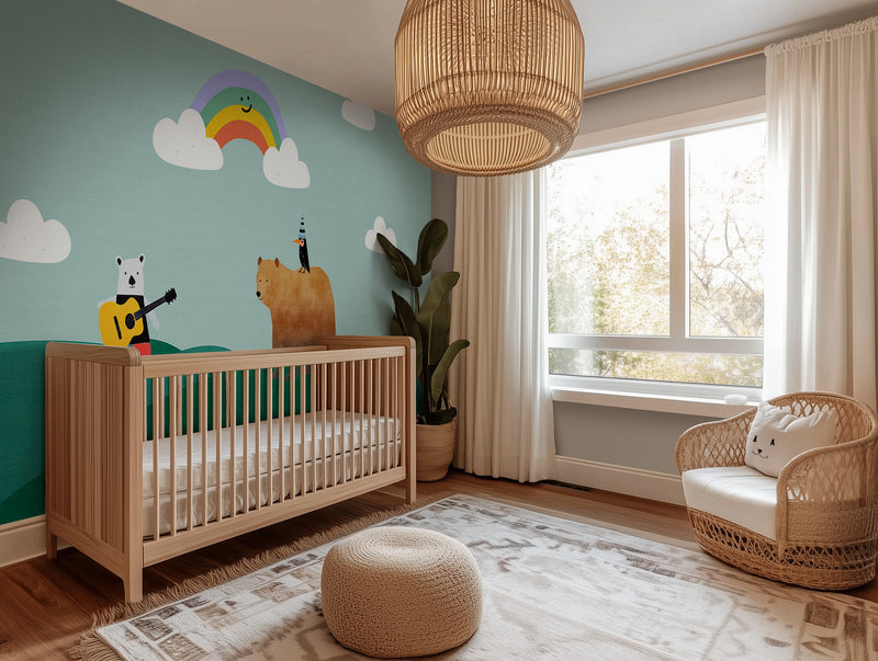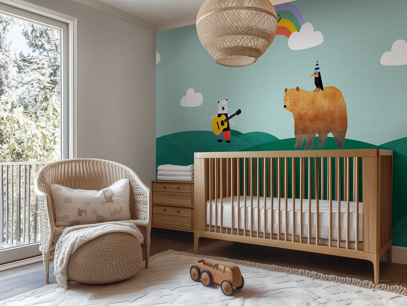 Storybook wallpapers are making a big comeback, with hand-drawn characters, playful scenes, and calming landscapes leading the charge. Rainbow Serenade taps into the trend for child-centric interiors that double as design-forward spaces—where wall art isn’t just for grownups. Its soft tones, whimsical figures, and layered landscape also align beautifully with biophilic design principles and the current love for murals that tell a story.