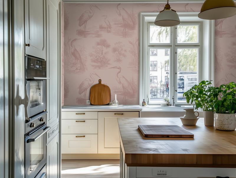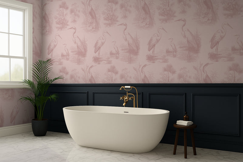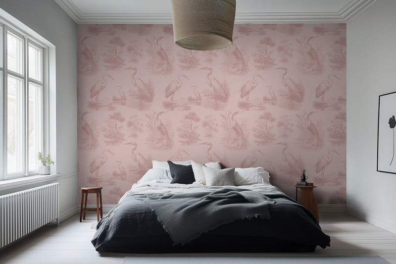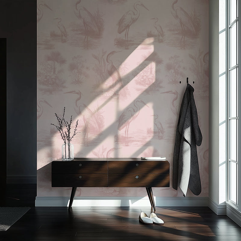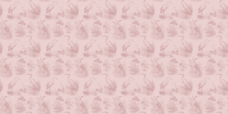 Morning Chorus – Rosewood on Soft Blush softens wetland wildlife into warm, tonal blush — herons, reeds, and rippling water drawn in muted rosewood. The result is delicate and calming, perfect for interiors seeking organic detail without bold color.