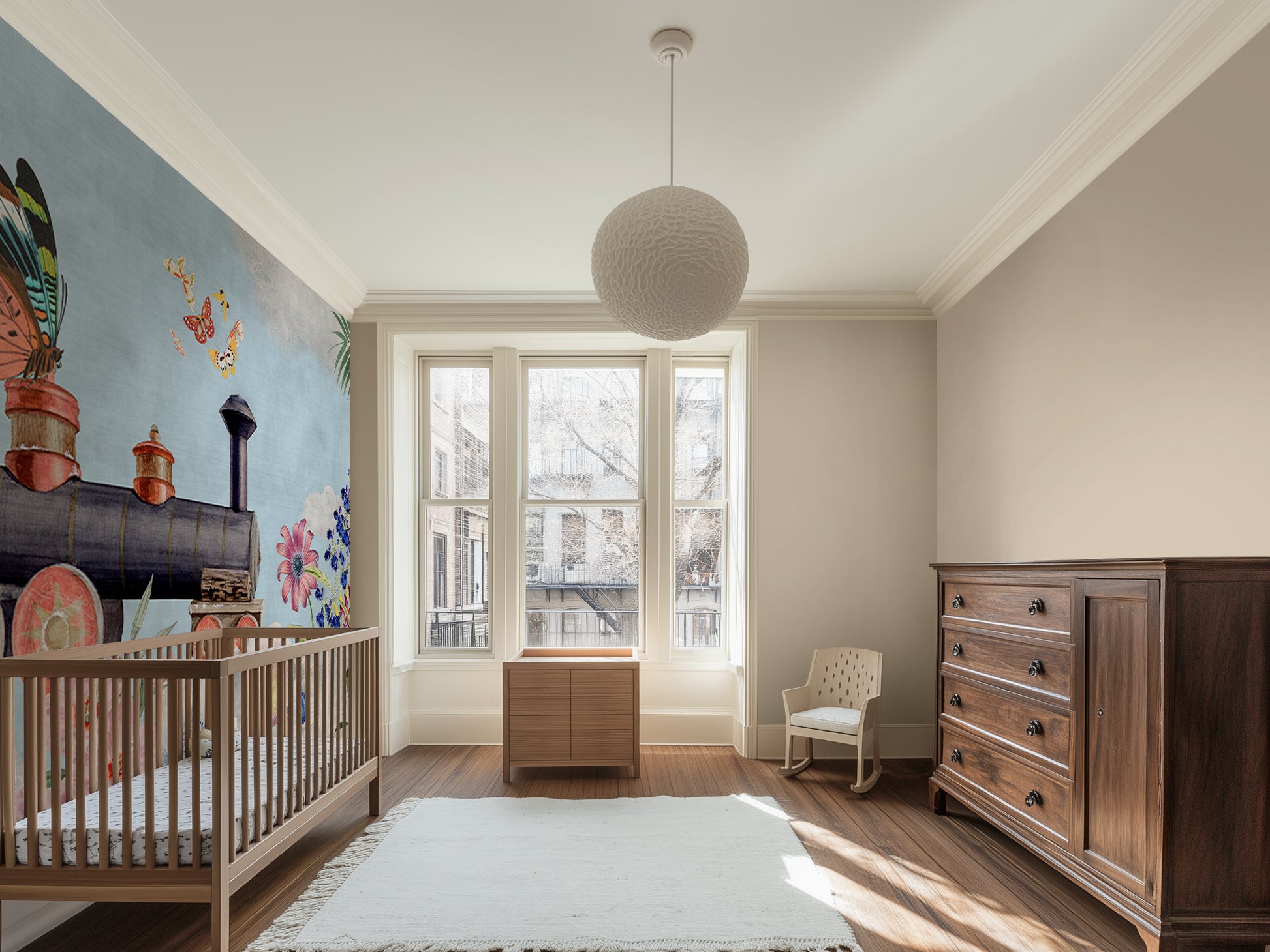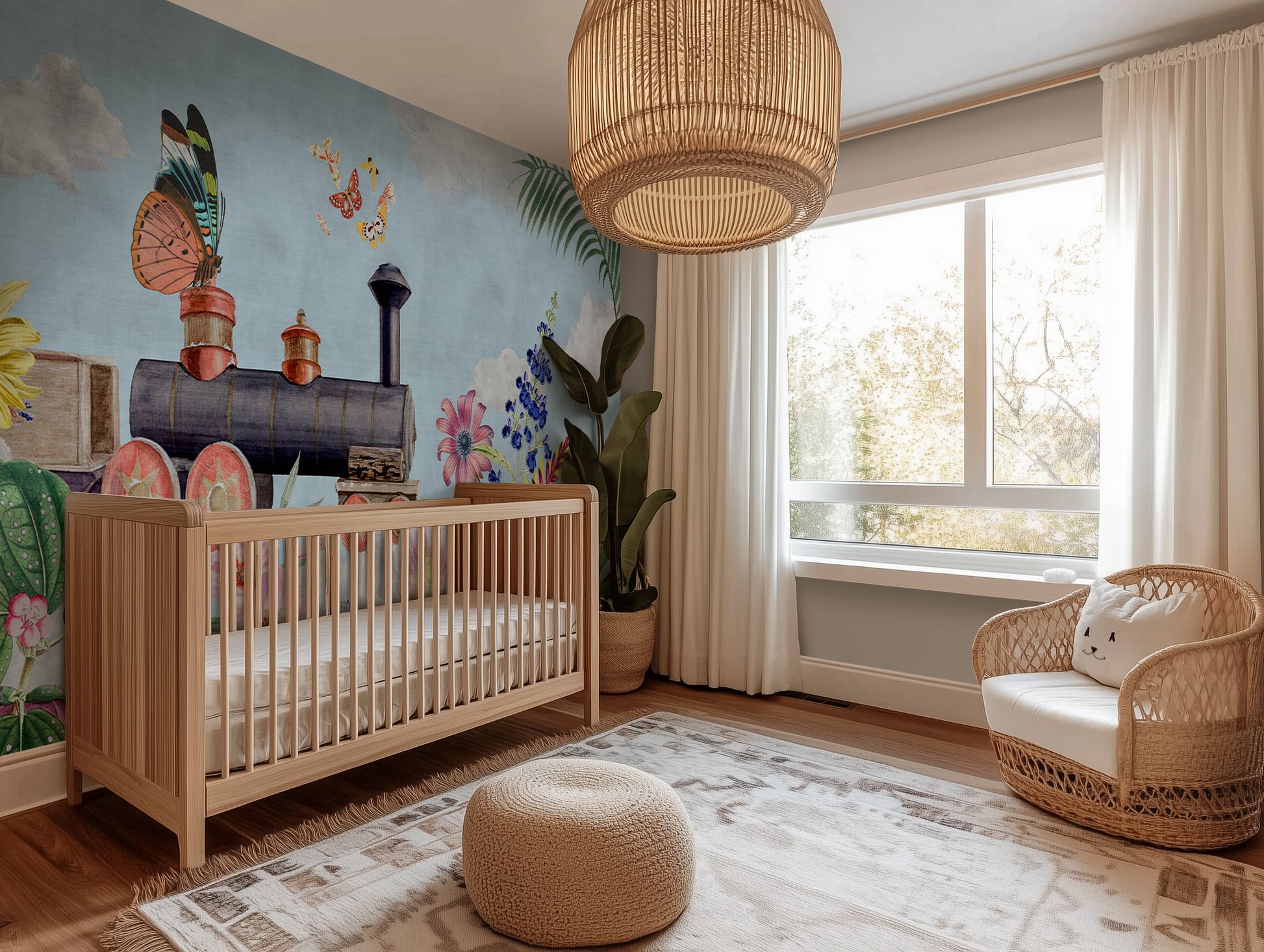 This mural hits two major trends: surreal storytelling in kids’ interiors and the fusion of vintage and botanical elements. The Dream Express balances classic illustration styles with fantastical composition, fitting beautifully into maximalist kids’ rooms, fairy tale-inspired nurseries, and biophilic design schemes that focus on nature, whimsy, and emotion.