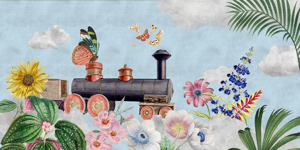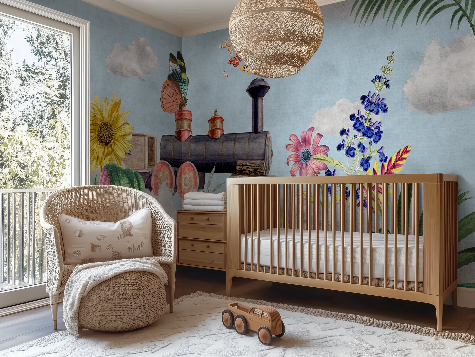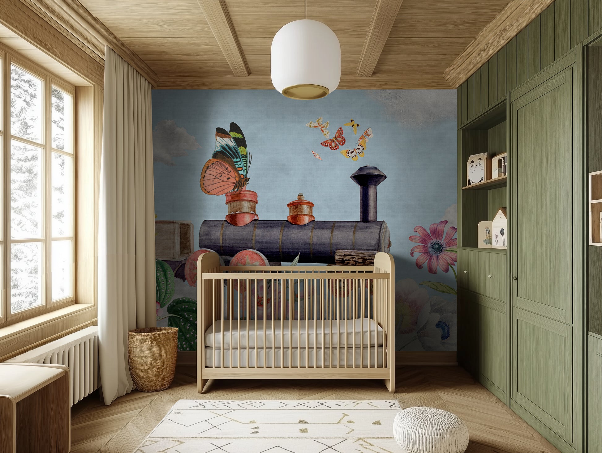 SEO Keywords: kids mural, fantasy train wallpaper, butterfly wallpaper, botanical kids decor, whimsical wall mural, flying train illustration, floral wallpaper for children, dreamy nursery mural, surreal kids wallpaper, nature inspired children’s mural, peel and stick wall mural, imaginative kids room decor