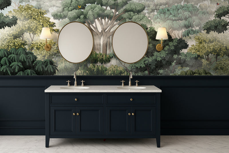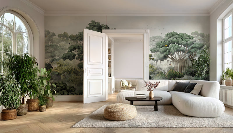 ... and then you open your eyes and see it. Wild Valley. A dreamlike forest of untouched beauty. A hand-illustrated signature design, months in the making, this mural captures a sanctuary suspended in morning mist — where ancient banyan trees stretch like temples toward the sky, rain trees bloom with quiet grace, and eucalyptus and teak breathe their silver-green calm into the forest air.