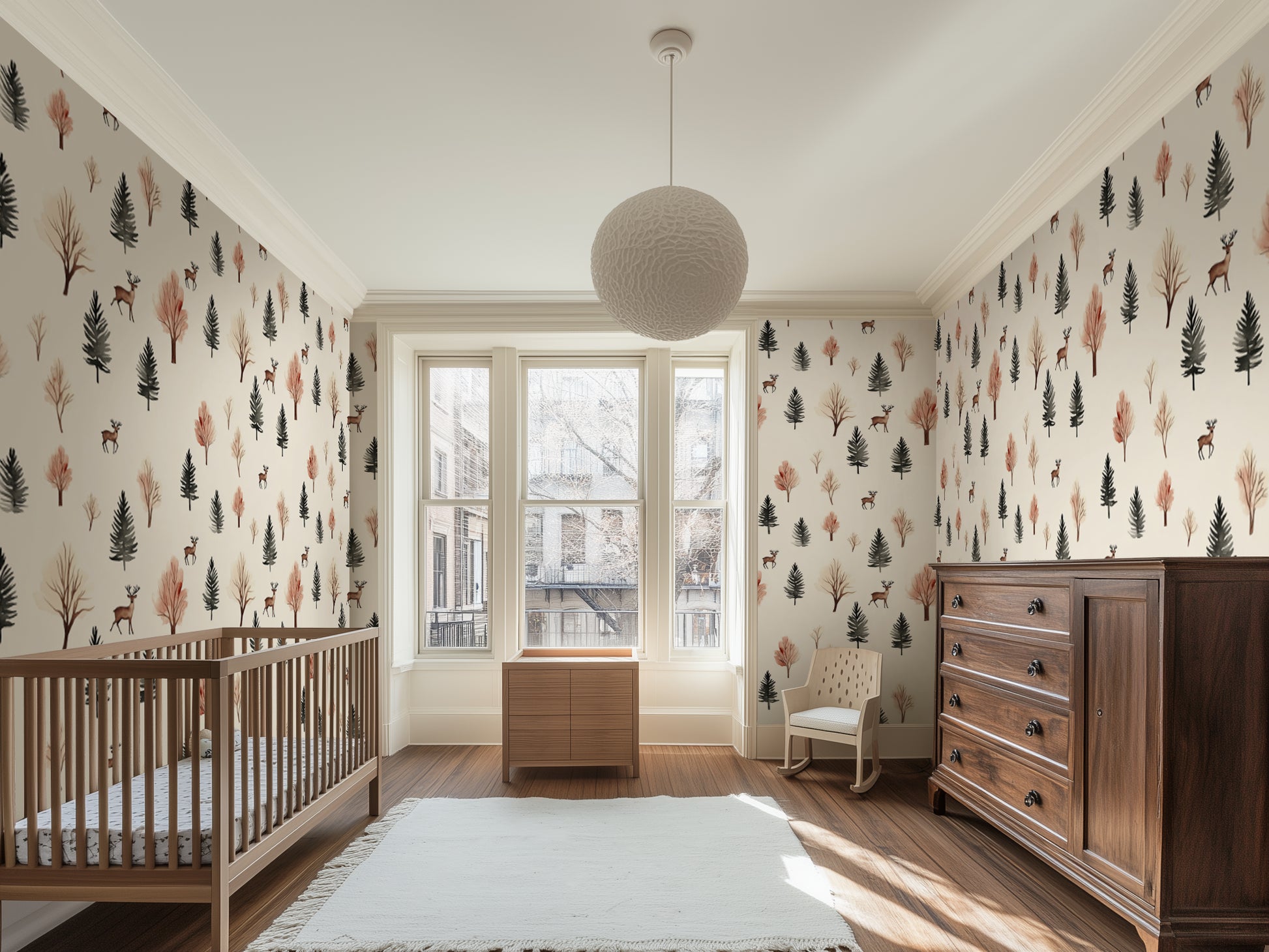 Available as a seamless repeat or a mural-scale forestscape, this wallpaper turns any space into a tranquil woodland retreat.