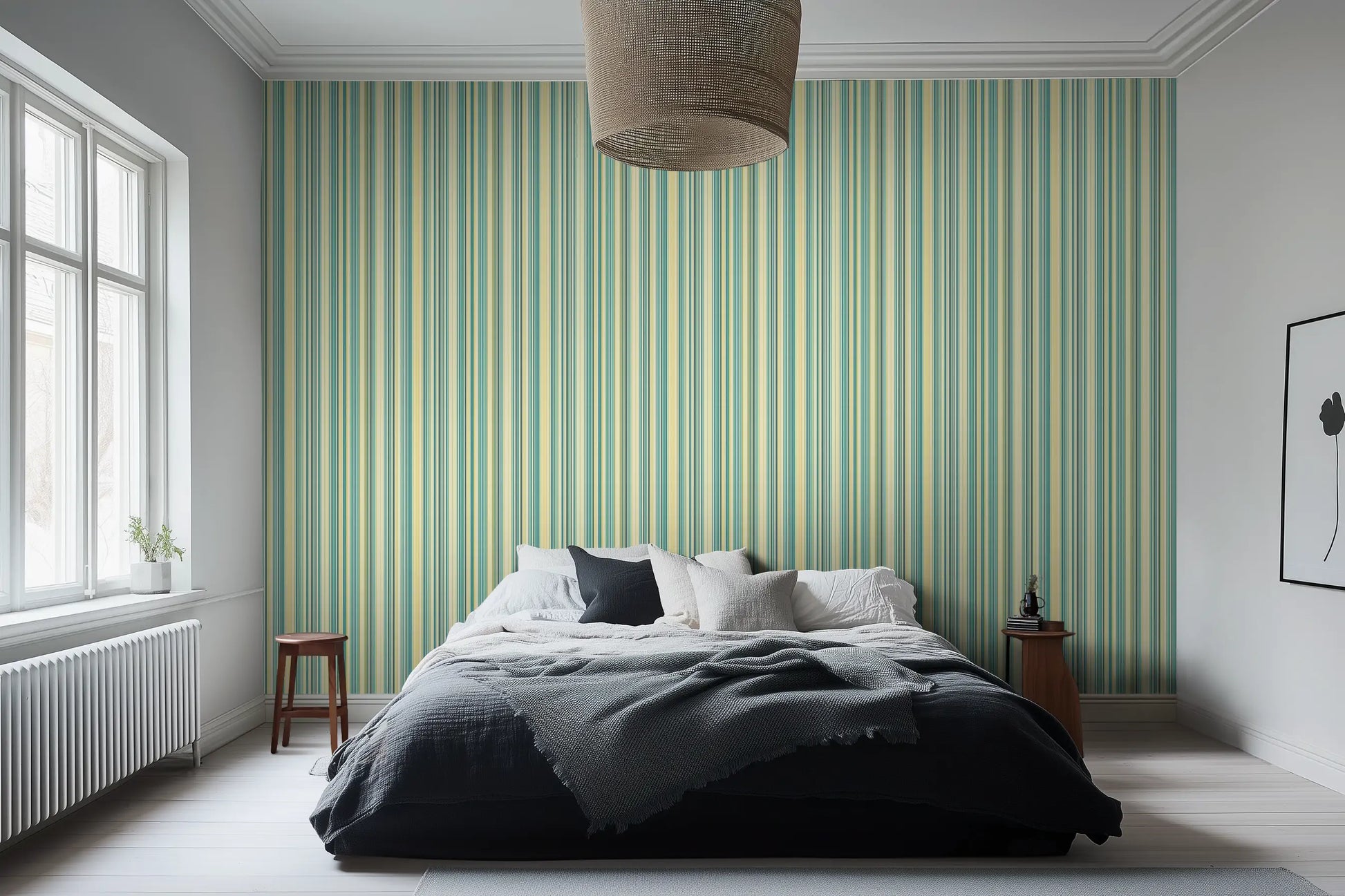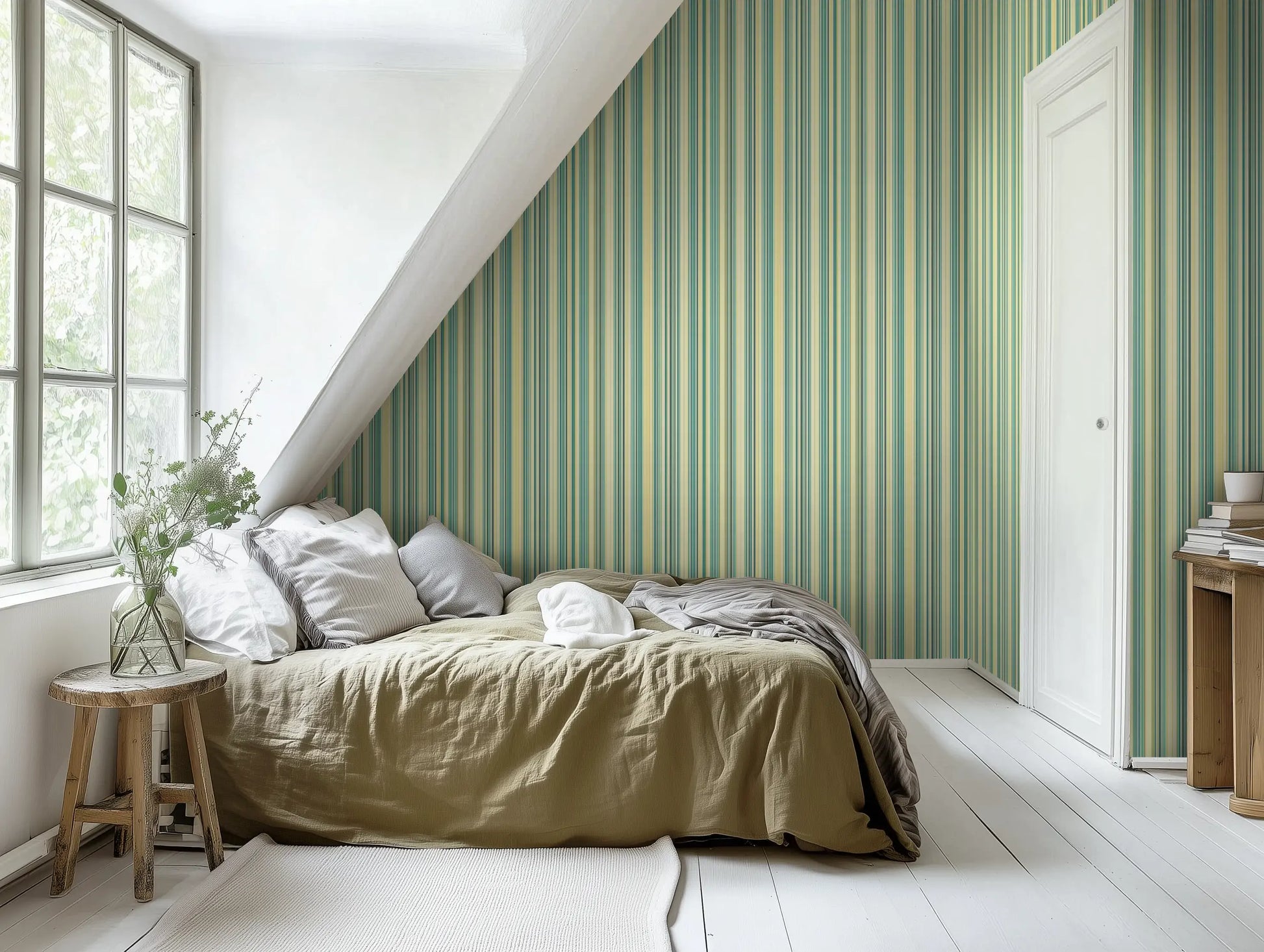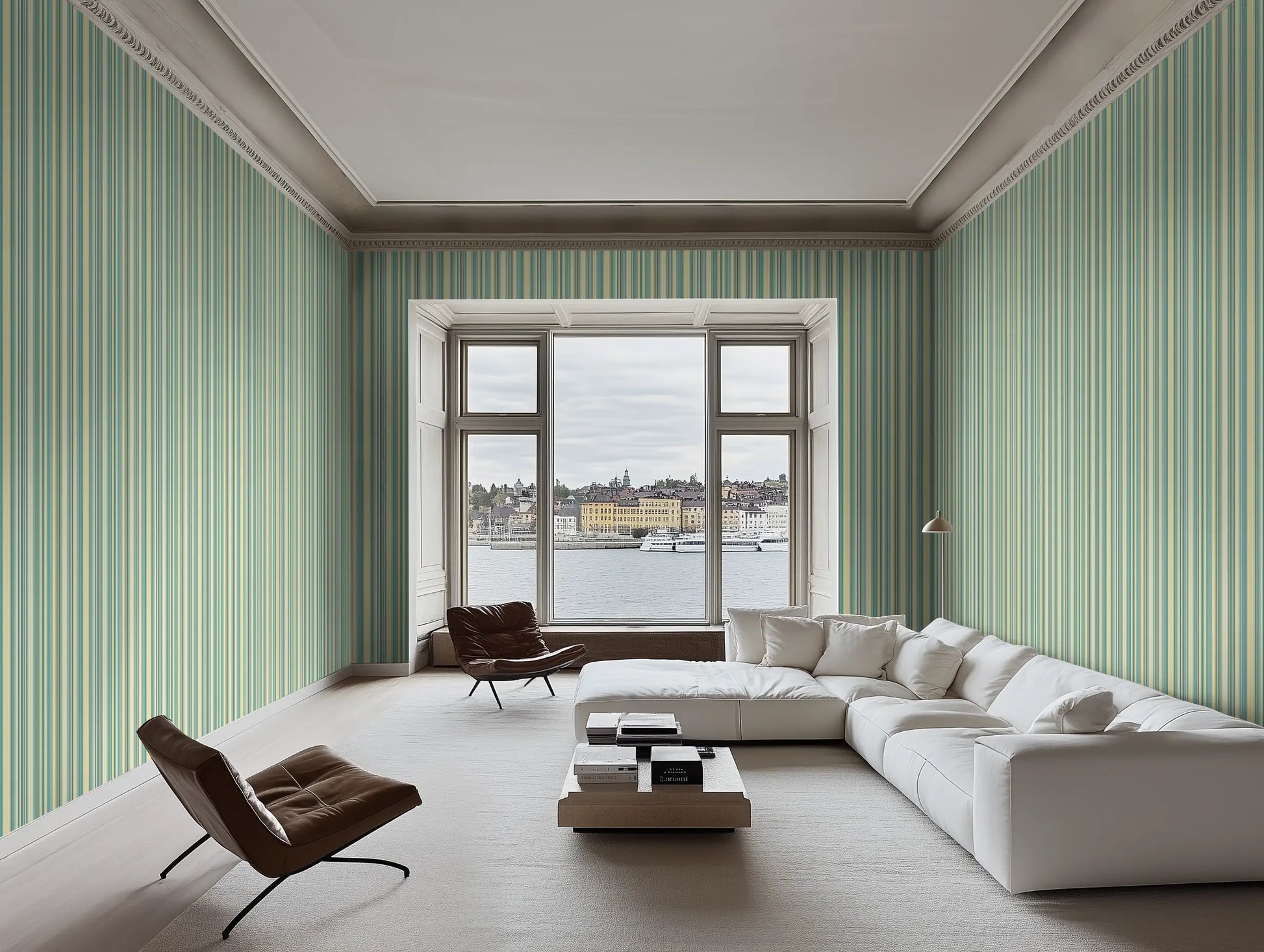 Perfect for coastal retreats, spa-like bathrooms, or bright, airy bedrooms, this soft blue striped wallpaper pairs beautifully with natural wood, white linen, and handwoven textiles, bringing the effortless elegance of Greek island living into your home.