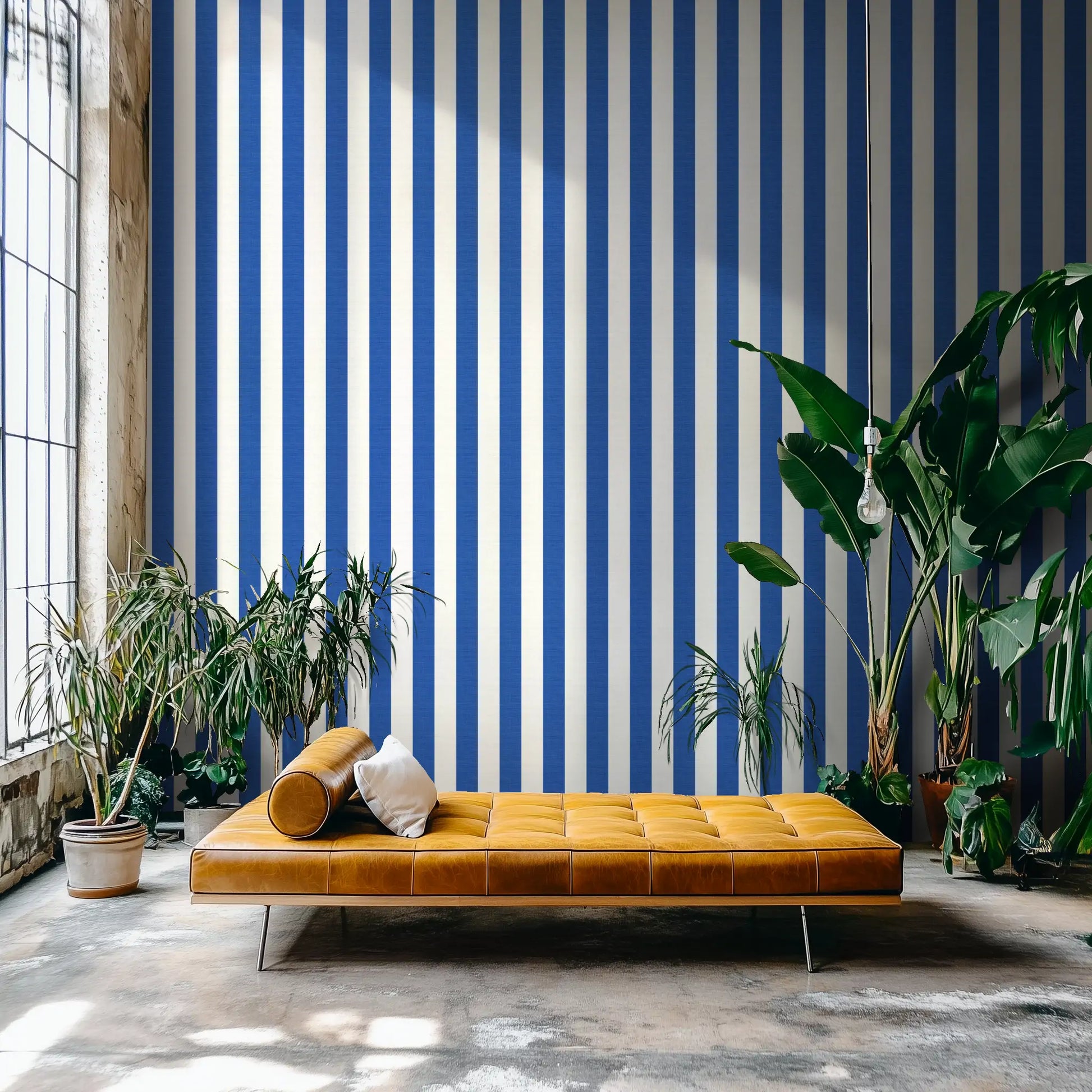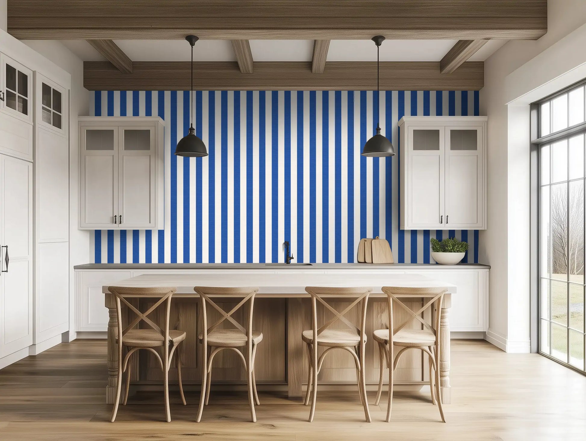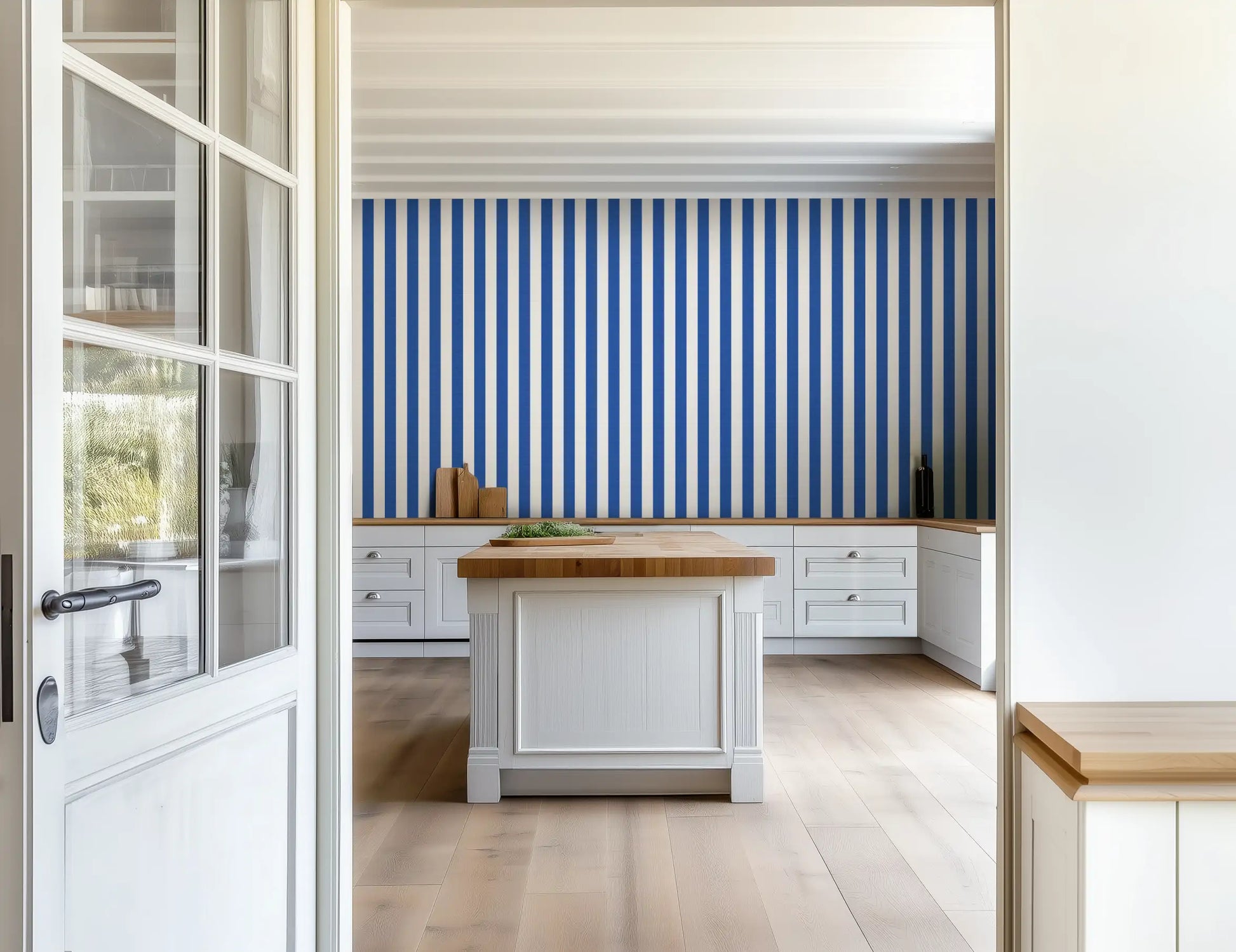 Perfect for coastal interiors, minimalist spaces, or breezy Mediterranean-inspired rooms, this Greek striped wallpaper pairs beautifully with textured linen, whitewashed wood, and deep indigo ceramics, creating an interior that feels sunlit, airy, and endlessly inviting.