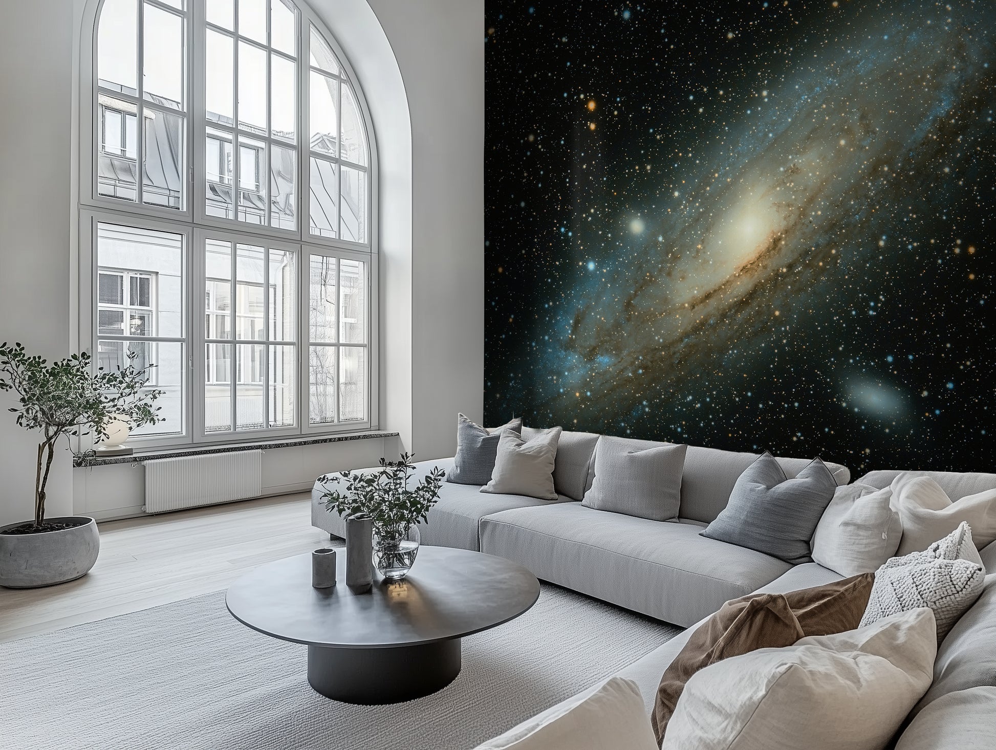 How it fits into current design trends: Galaxy murals are trending in both tech-inspired and meditative interiors—Andromeda Drift walks the line between order and awe.