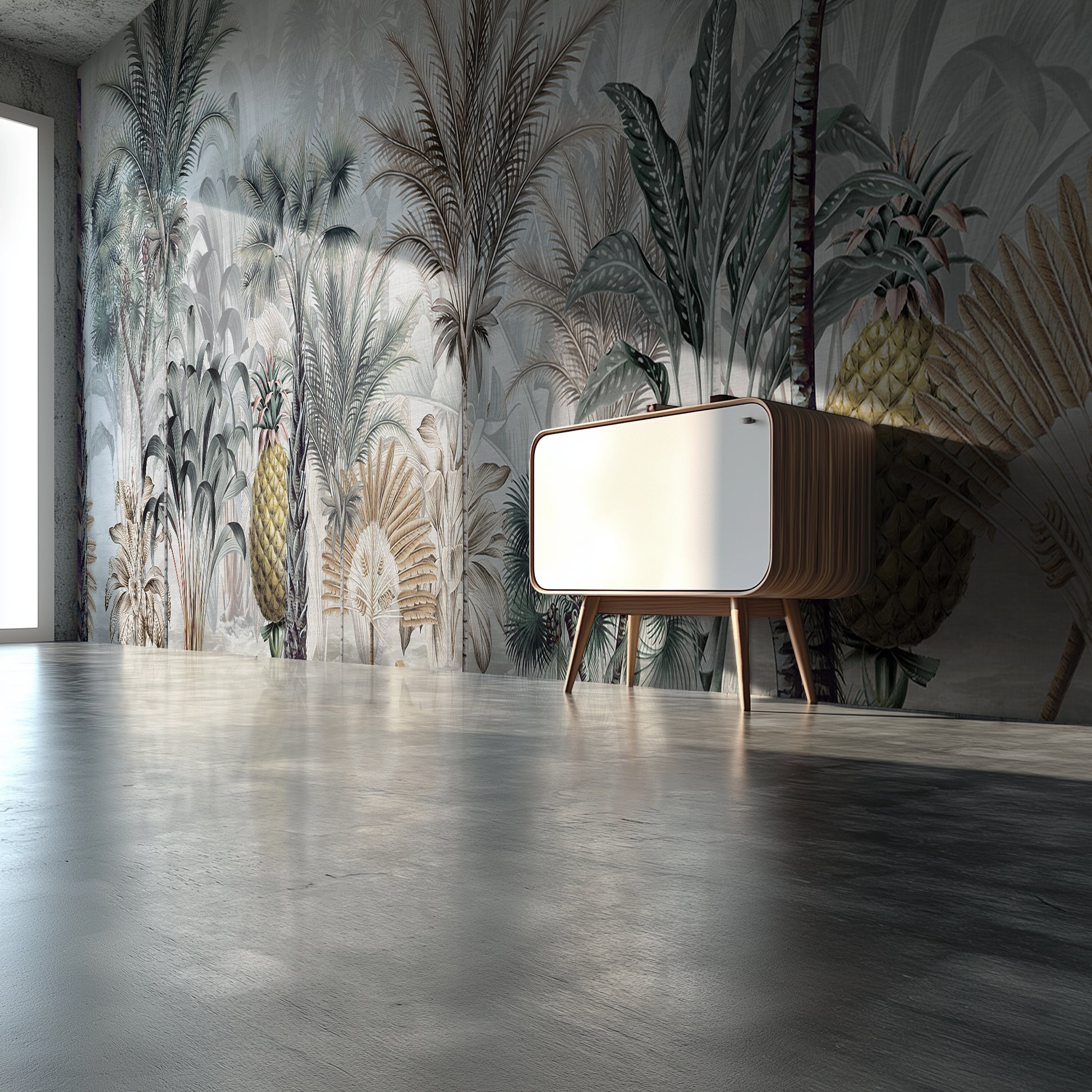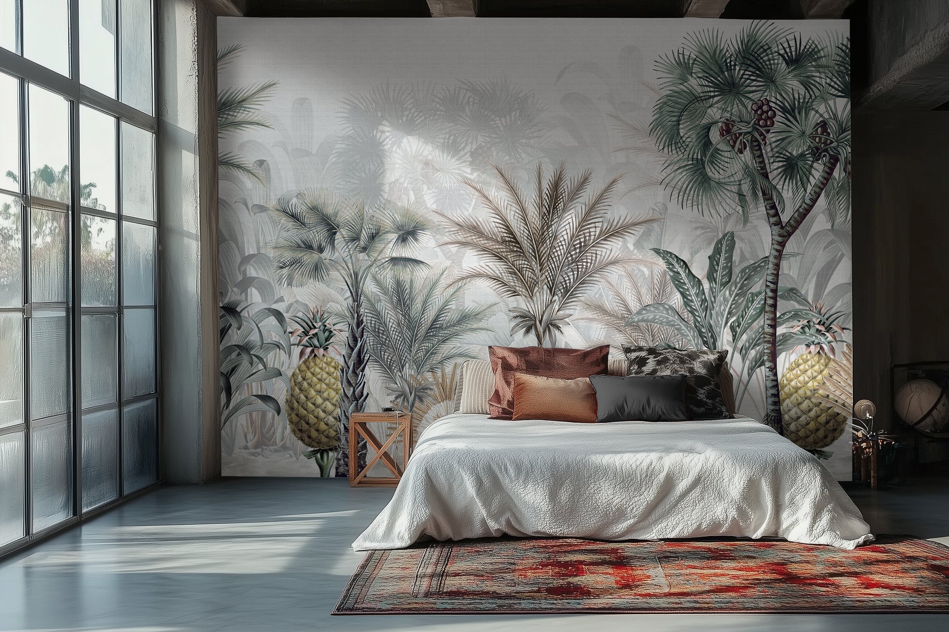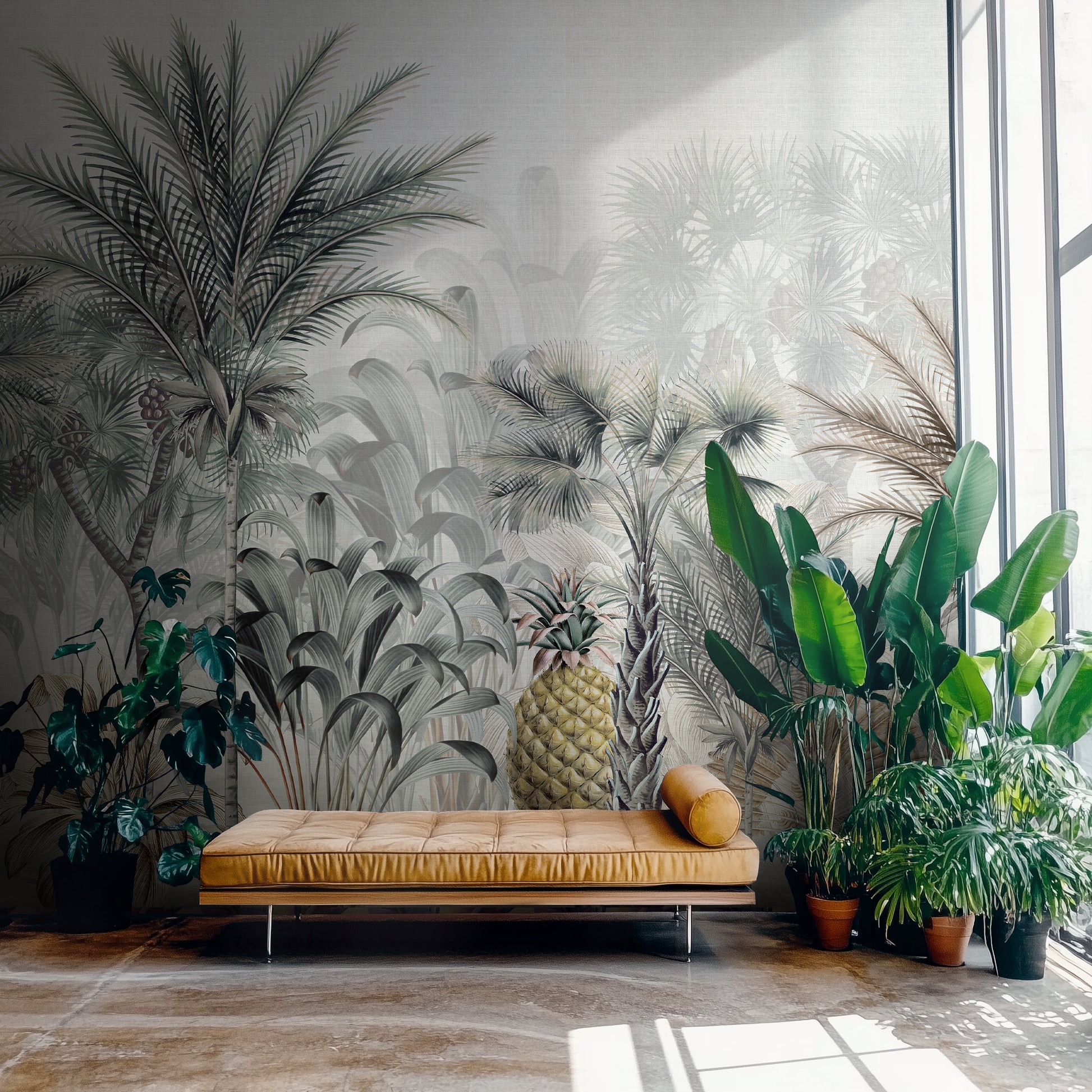 In a jungle dappled with filtered light, palms fan out like cathedral arches while pineapples rise like golden sentinels among lush leaves, all brought to life in Eden Mirage, a jungle botanical wallpaper mural that transforms any space into an elegant tropical escape. Soft greens, sandy neutrals, and delicate shadows weave together a vision where nature feels both ornamental and untamed—a perfect balance of lush detail and gentle sophistication.