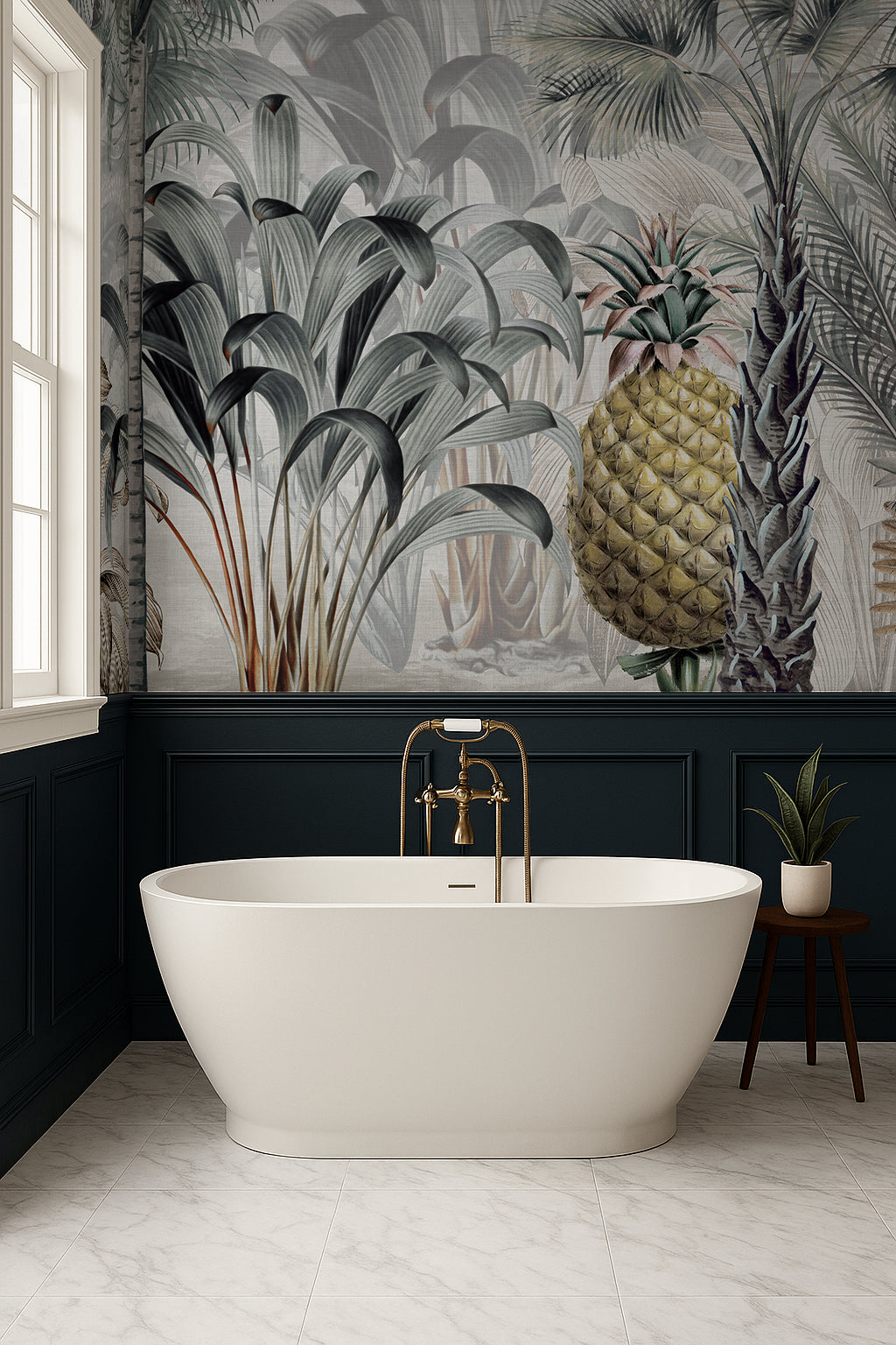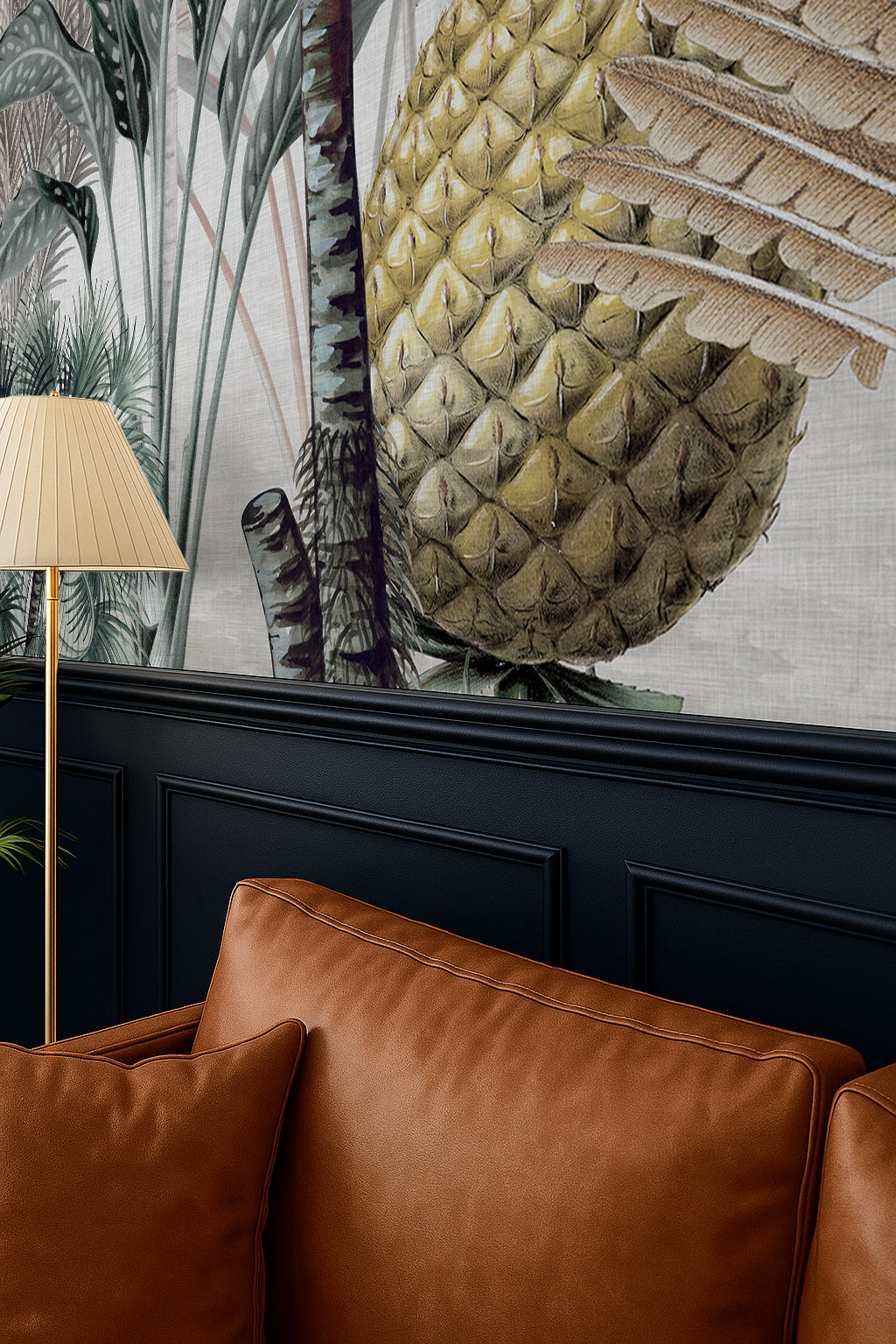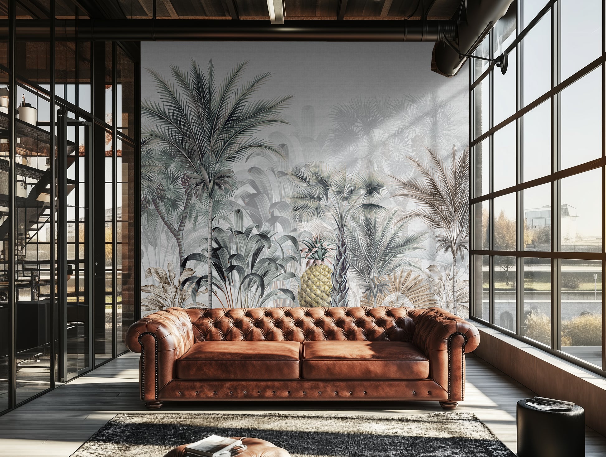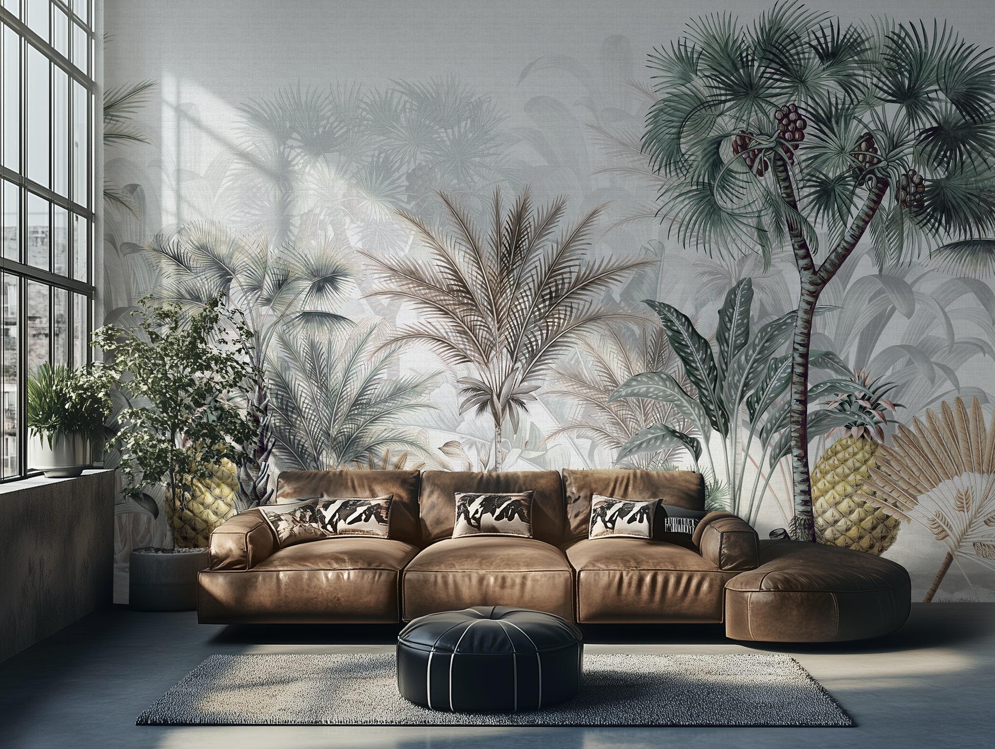 In a jungle dappled with filtered light, palms fan out like cathedral arches while pineapples rise like golden sentinels among lush leaves, all brought to life in Eden Mirage, a jungle botanical wallpaper mural that transforms any space into an elegant tropical escape. Soft greens, sandy neutrals, and delicate shadows weave together a vision where nature feels both ornamental and untamed—a perfect balance of lush detail and gentle sophistication.