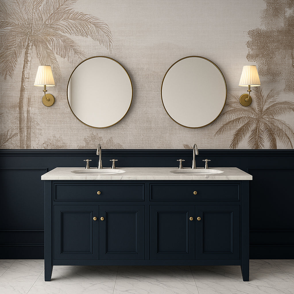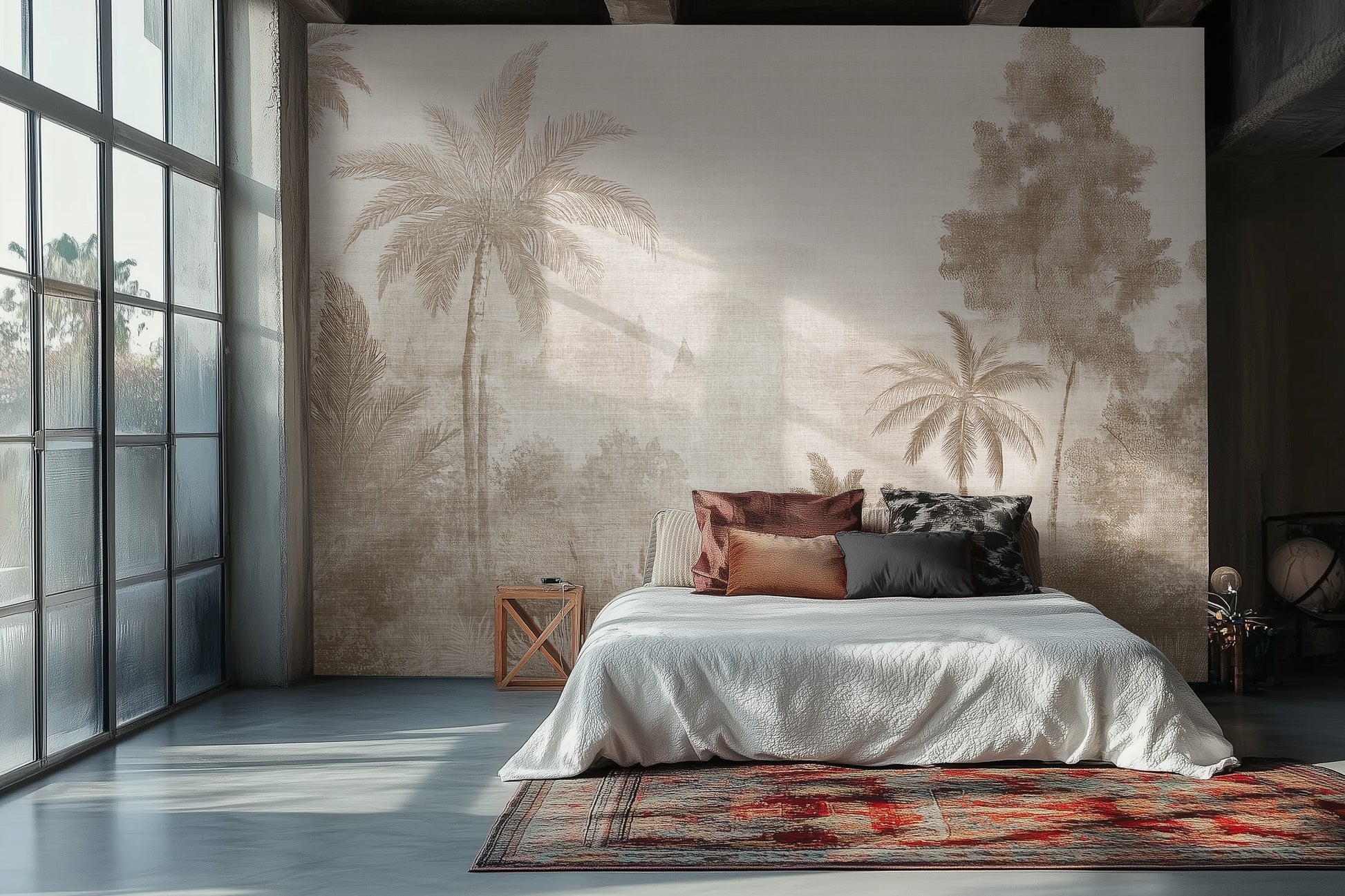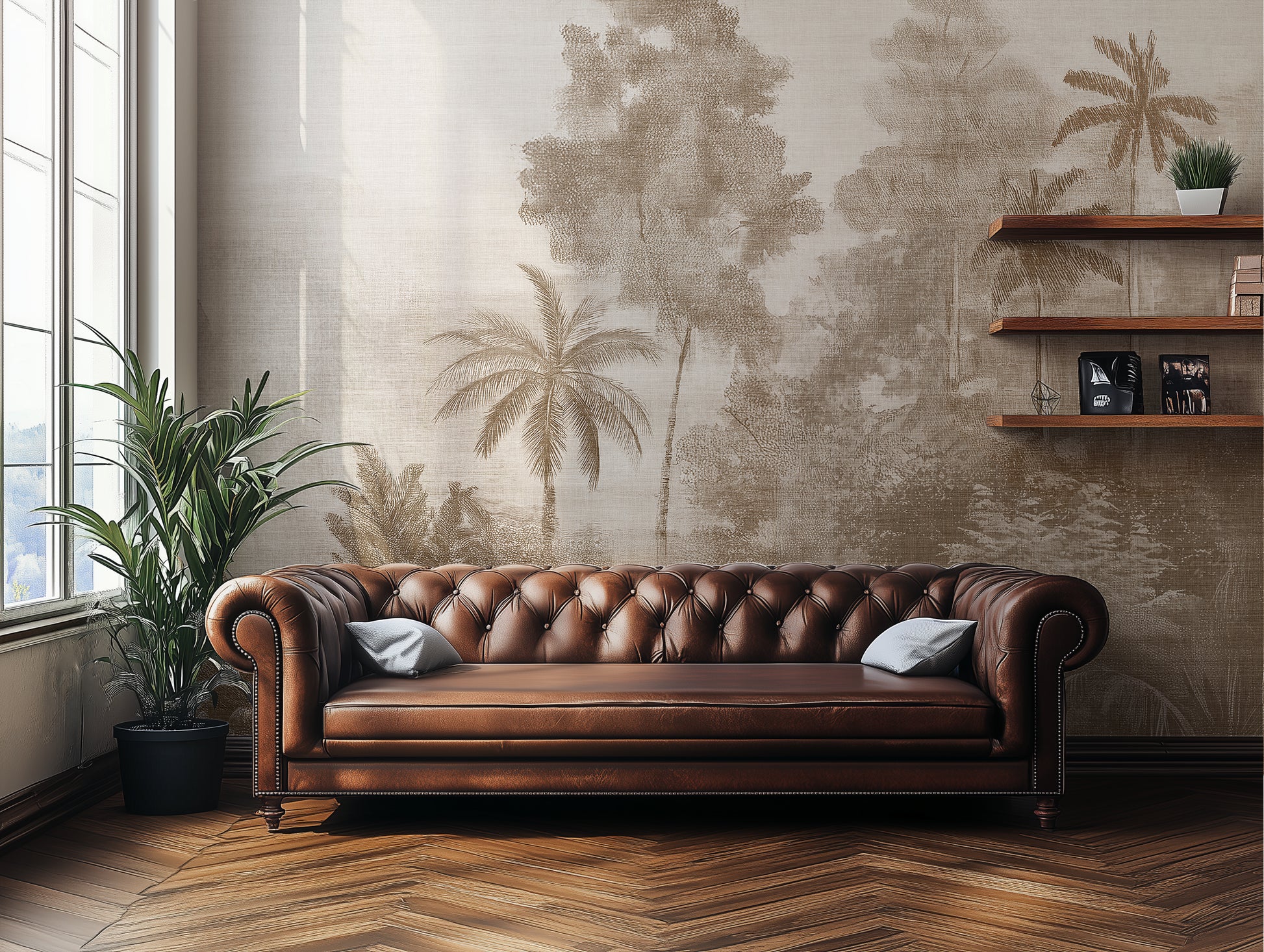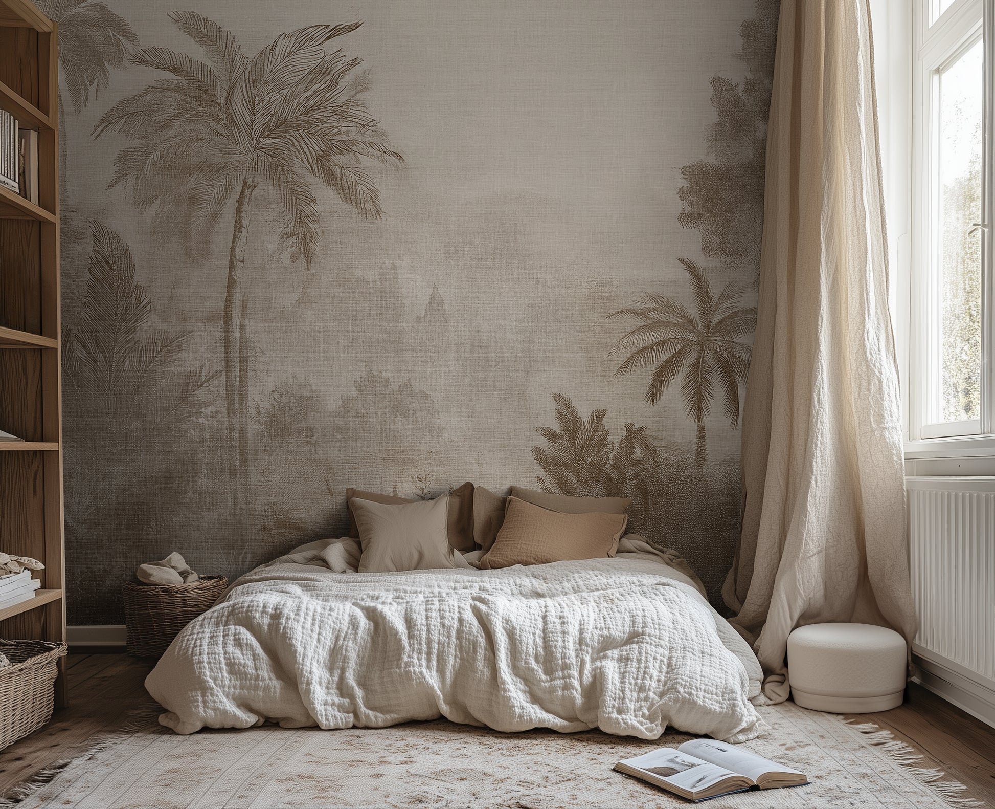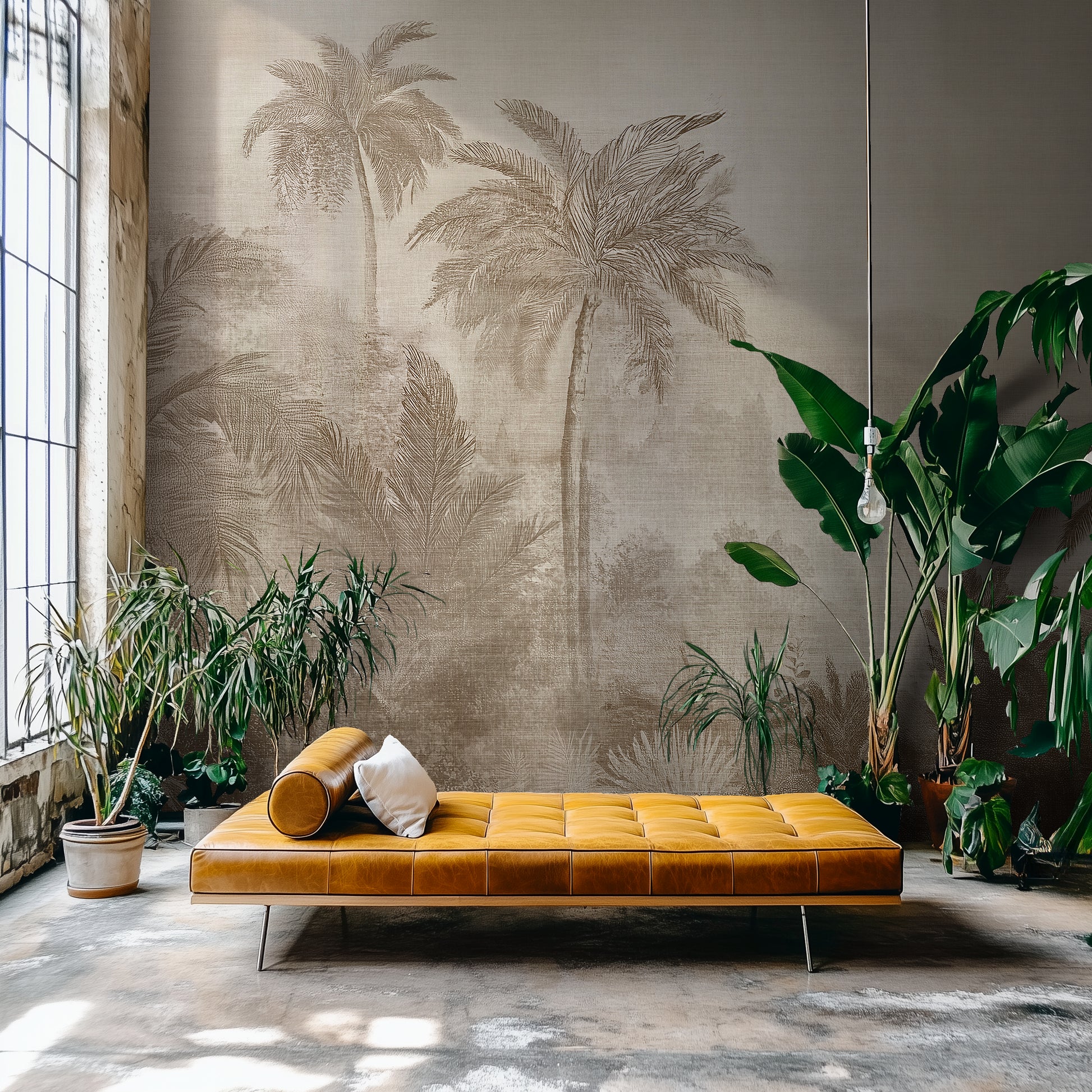 A jungle suspended in time, like an old travel photograph left to fade under the sun. Sepia Mirage brings a soft, vintage warmth to a lush tropical scene, where misty palms rise from a dreamlike landscape. This piece from the Jungle Nouveau Collection is a bridge between eras—classic in form, yet effortlessly modern in execution.