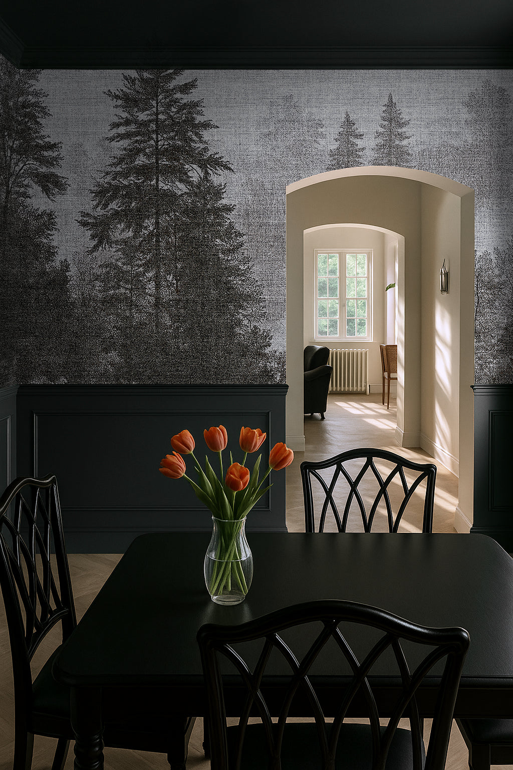 The water barely stirs, a mirror to the mist that hangs between the trees. In the distance, the forest rises in layers, fading into the pale light of dawn. Shadowed Fjord captures that fleeting, cinematic moment—the hush of a secluded Nordic landscape, where silence speaks louder than sound. A standout piece from the Vintage Forest Collection, this wallpaper is an ode to monochrome landscapes, Nordic minimalism, and the quiet beauty of untouched wilderness.
