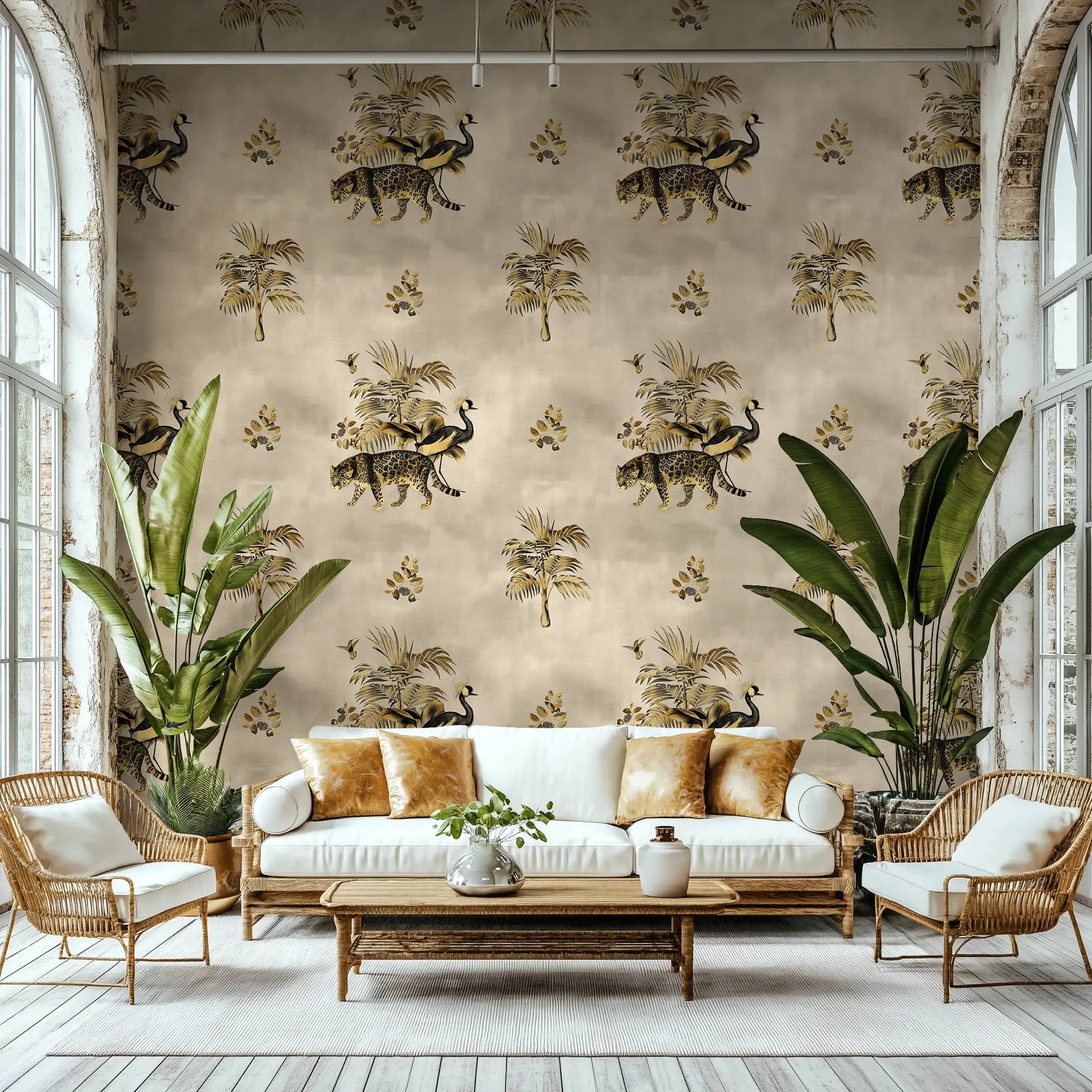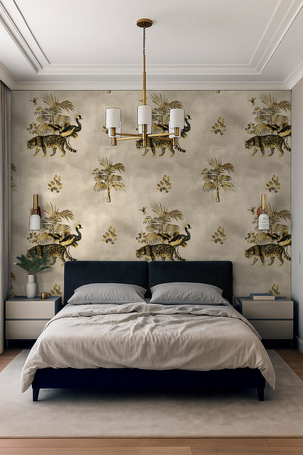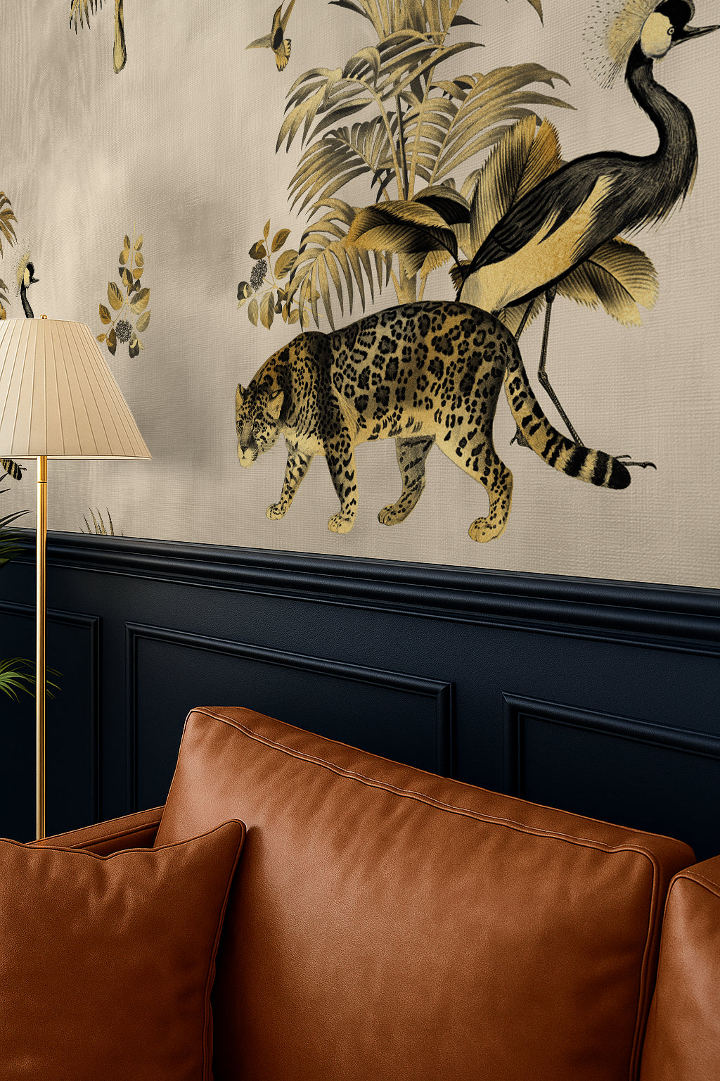 Somewhere in the golden haze of a forgotten world, a leopard prowls beneath towering palms while a crowned crane steps elegantly beside it. The Gilded Wild is a study in contrast—wild yet refined, untamed yet regal. Inspired by antique textile patterns and colonial-era illustrations, this wallpaper from the Animal Kingdom Collection merges safari grandeur with an air of vintage sophistication.