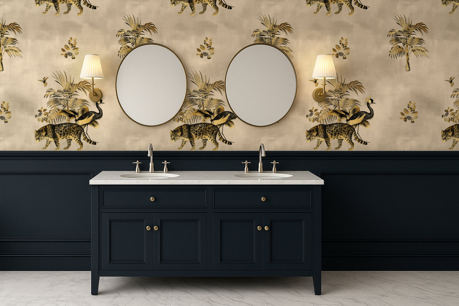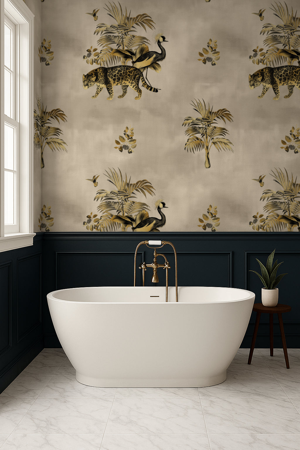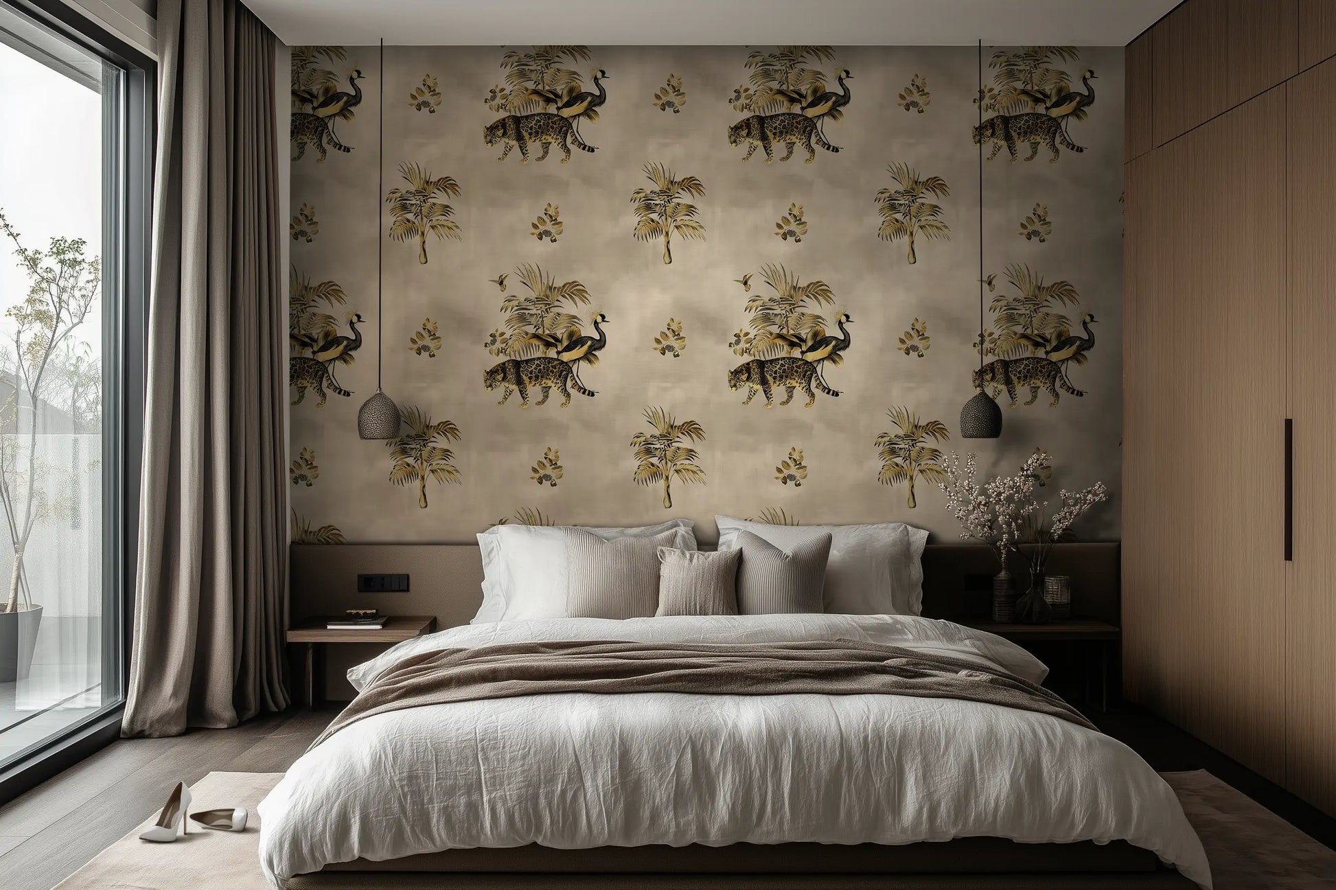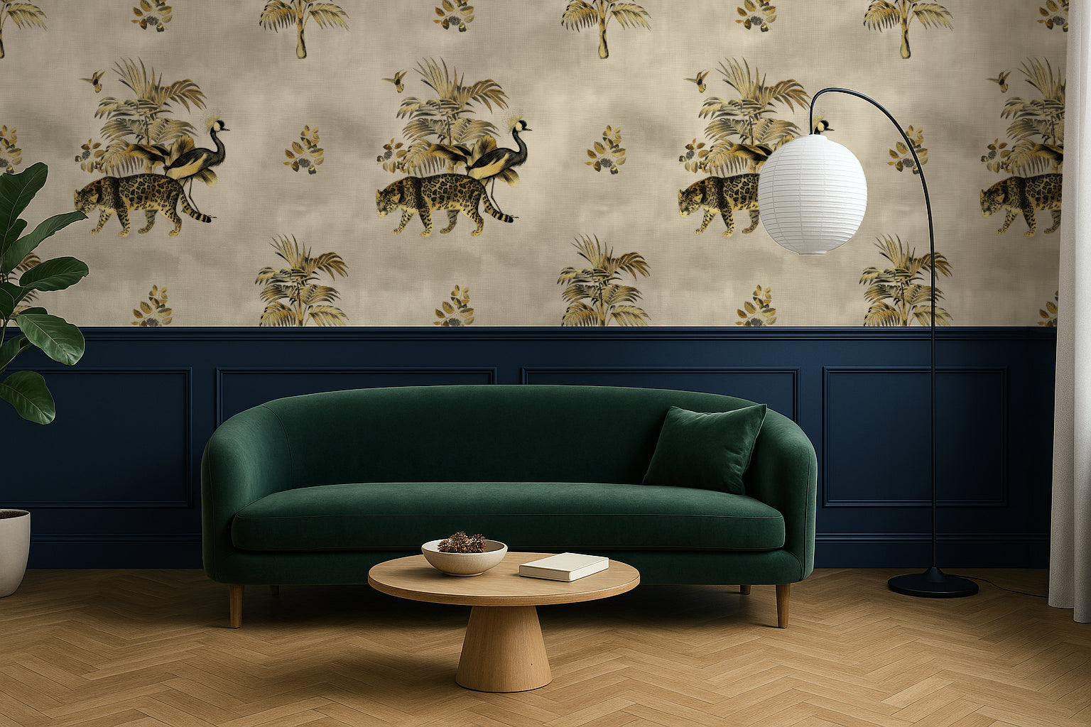 Somewhere in the golden haze of a forgotten world, a leopard prowls beneath towering palms while a crowned crane steps elegantly beside it. The Gilded Wild is a study in contrast—wild yet refined, untamed yet regal. Inspired by antique textile patterns and colonial-era illustrations, this wallpaper from the Animal Kingdom Collection merges safari grandeur with an air of vintage sophistication.