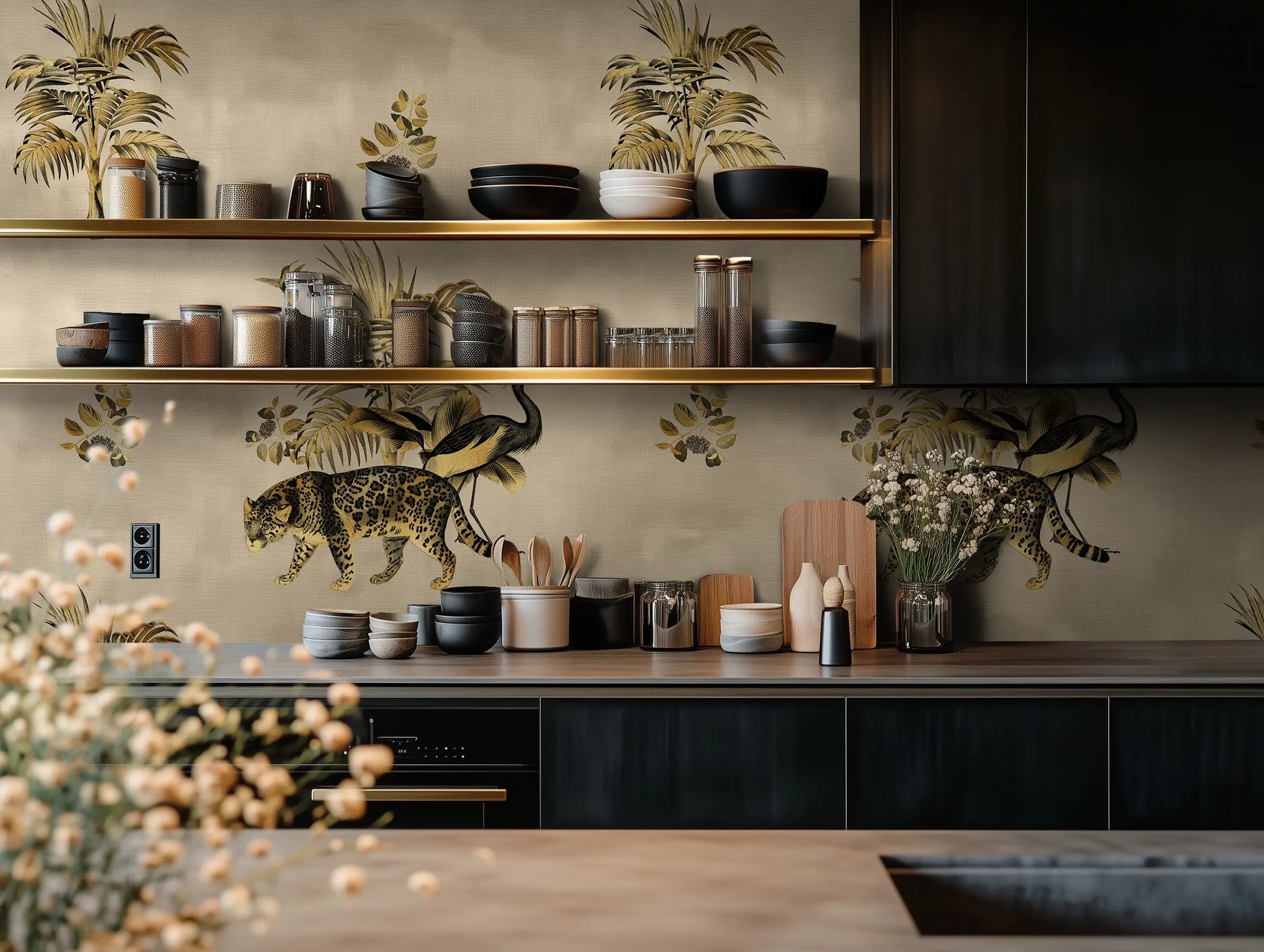 Why it’s great: The muted gold and black palette adds a luxurious depth, perfect for statement walls, boutique interiors, or moody, nature-inspired spaces.
