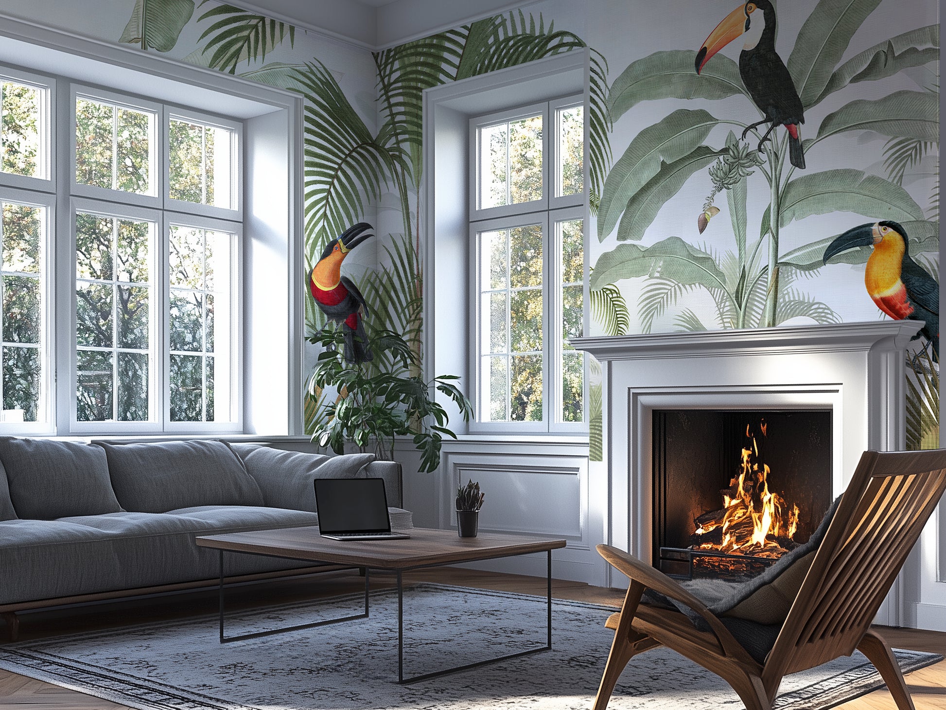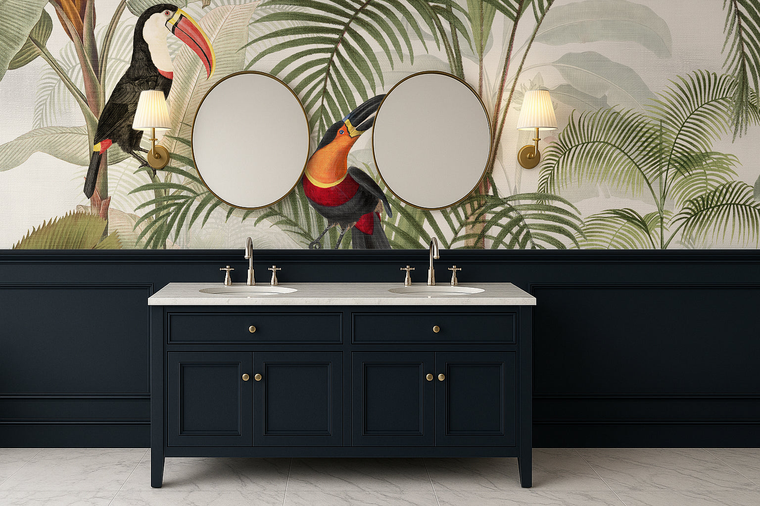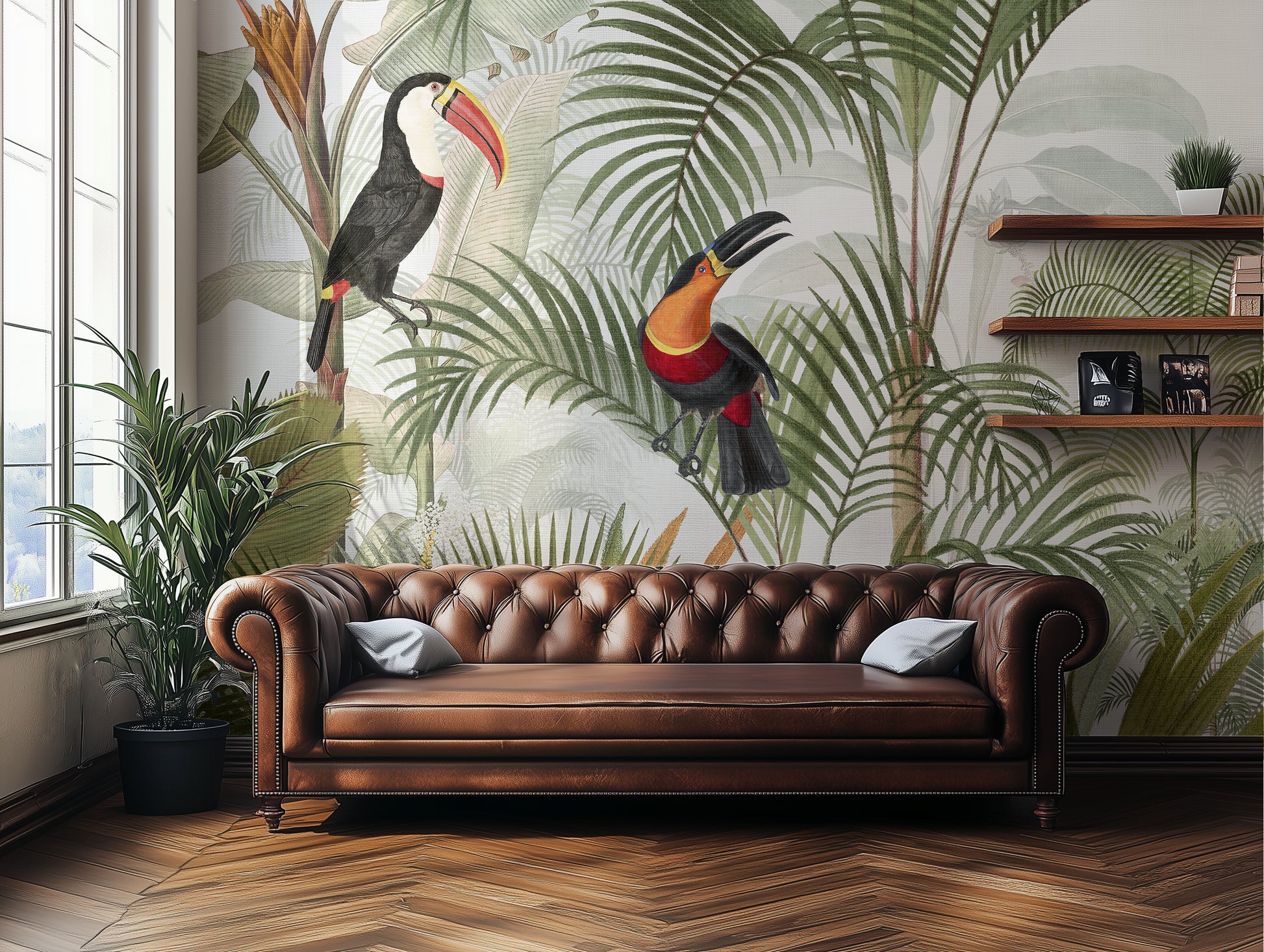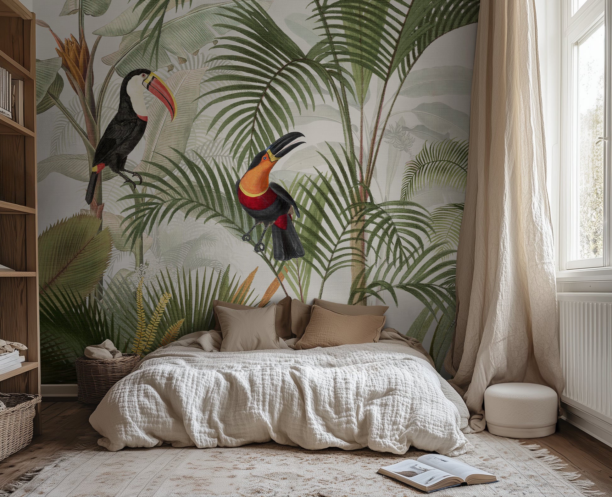 High above the jungle floor, flashes of orange and black cut through the mist—toucans in their element, watching, waiting, calling into the canopy. Toco Haven brings the wild rhythm of the tropics to life, where lush palms and exotic birds merge in a soft, dreamy jungle scene. This wallpaper captures the untamed beauty of the rainforest, blending vintage botanical artistry with a contemporary, light-filled palette.
