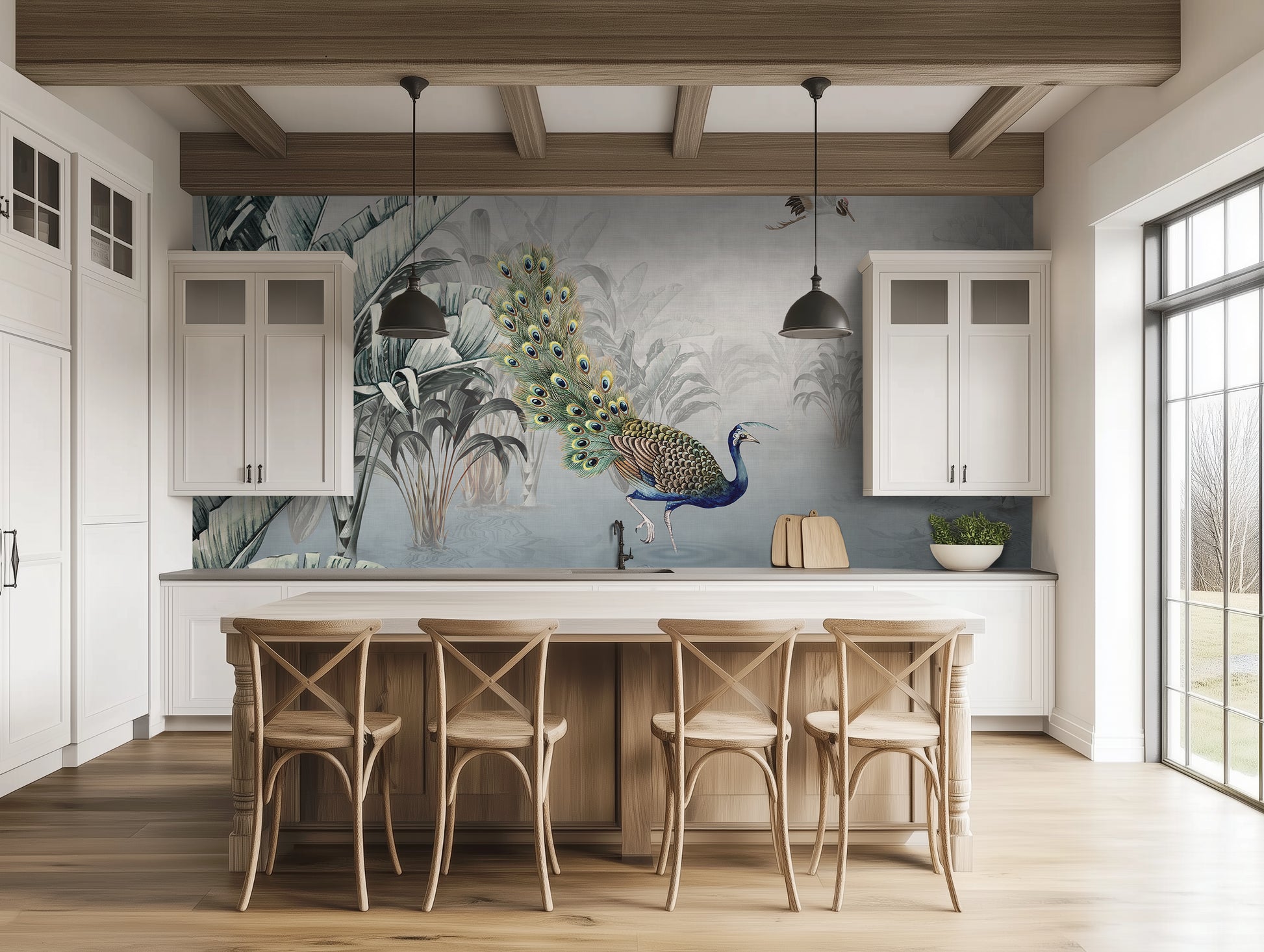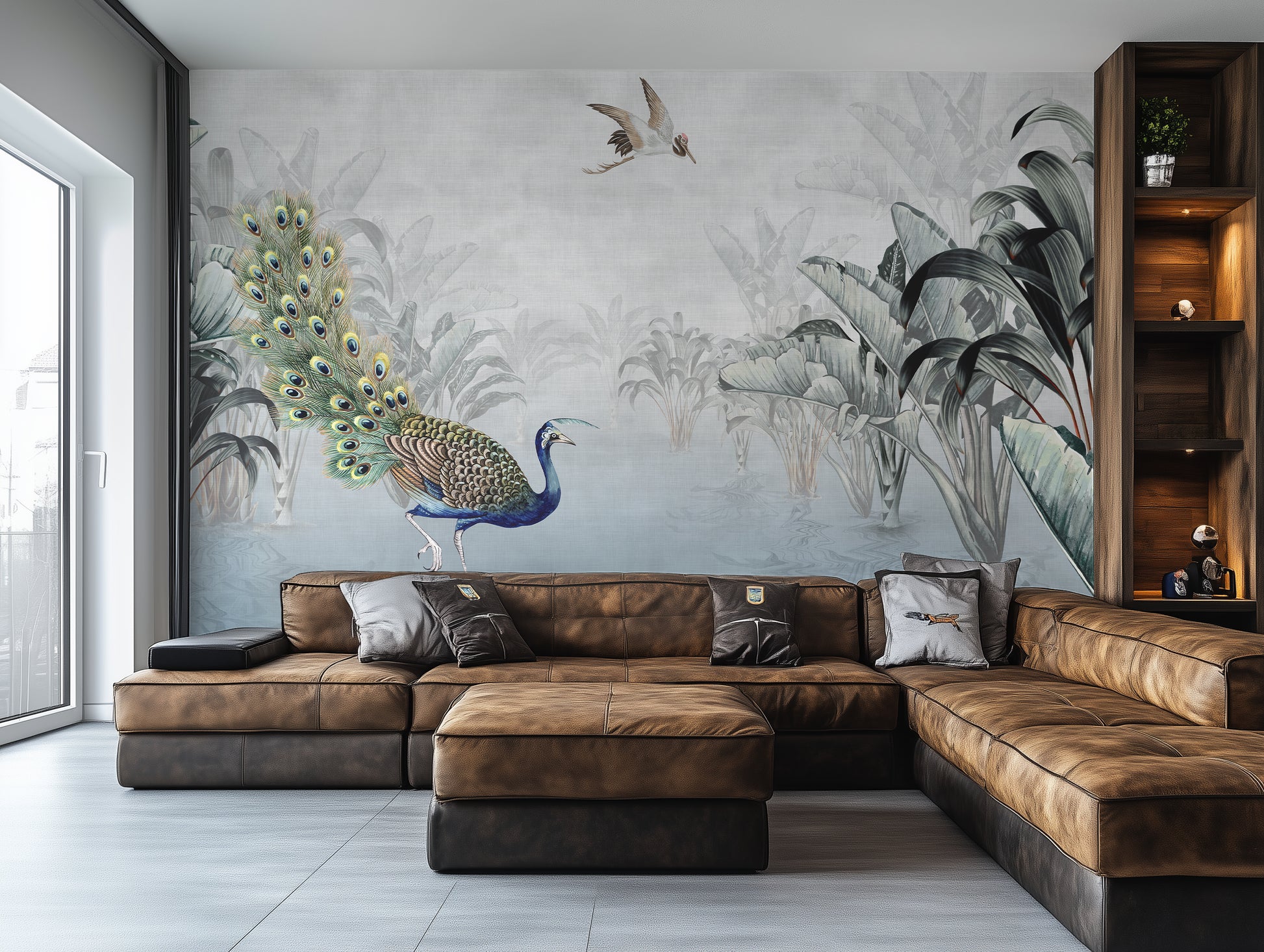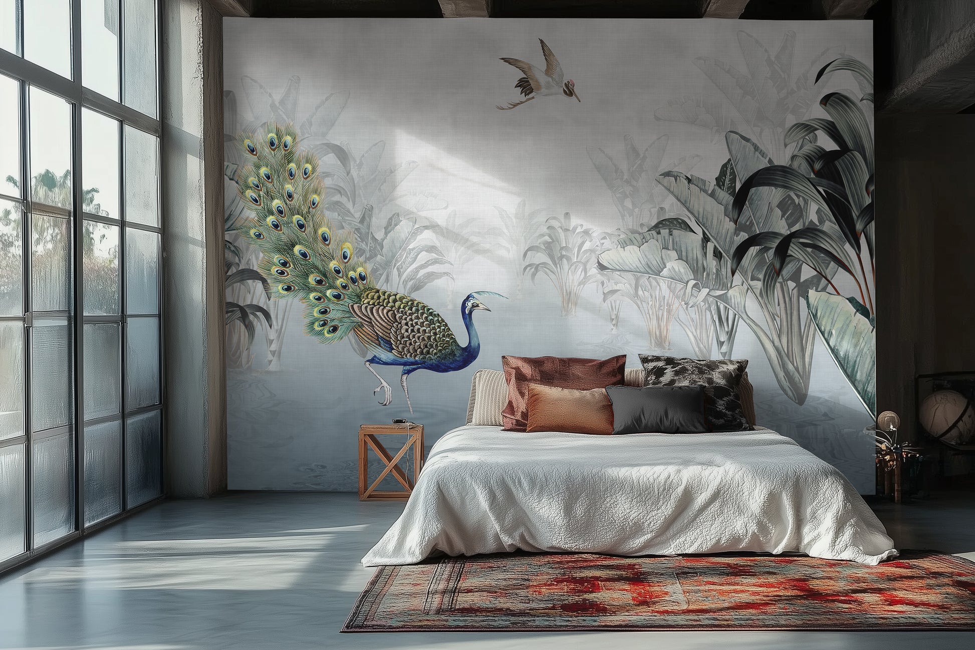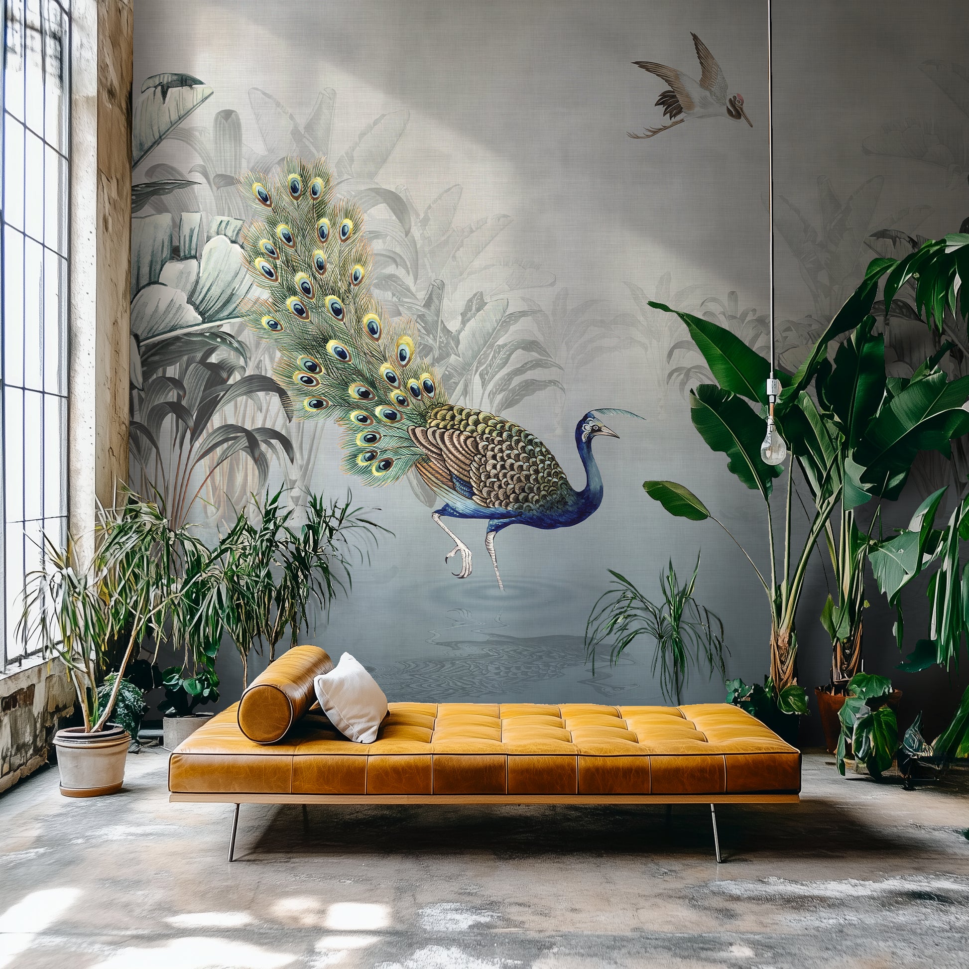Peacock Reverie reflects the rise of tropical wallpaper murals that blend fine art aesthetics with lush natural themes. As a tropical jungle wall mural, it fits seamlessly into modern interiors embracing maximalist touches while maintaining sophistication—offering a peaceful jungle escape intertwined with the romantic narrative of the Silk Road, transforming any room into an artistic focal point.