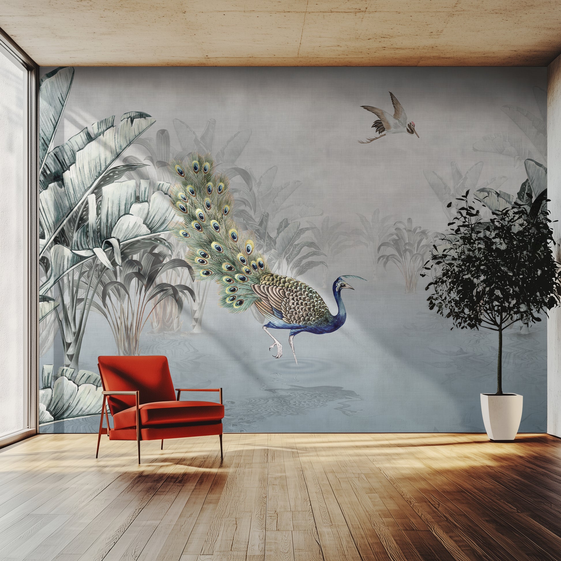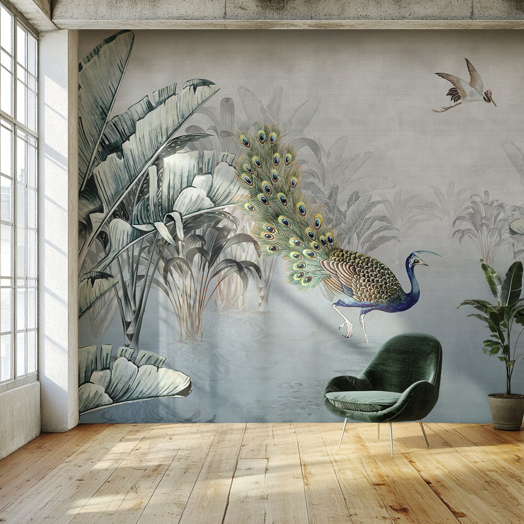 Mist rises above still waters, leaves curl in gentle shadows, and a lone peacock fans its jeweled tail like a living painting, captured in Peacock Reverie, a tropical jungle wall mural that feels caught between dream and reality. Here, jungles become quiet stages and every feather glimmers with hidden stories, echoing the opulence and mystery woven through ancient caravan routes. Soft watercolor textures and cool blue tones make this mural as elegant as it is serene.