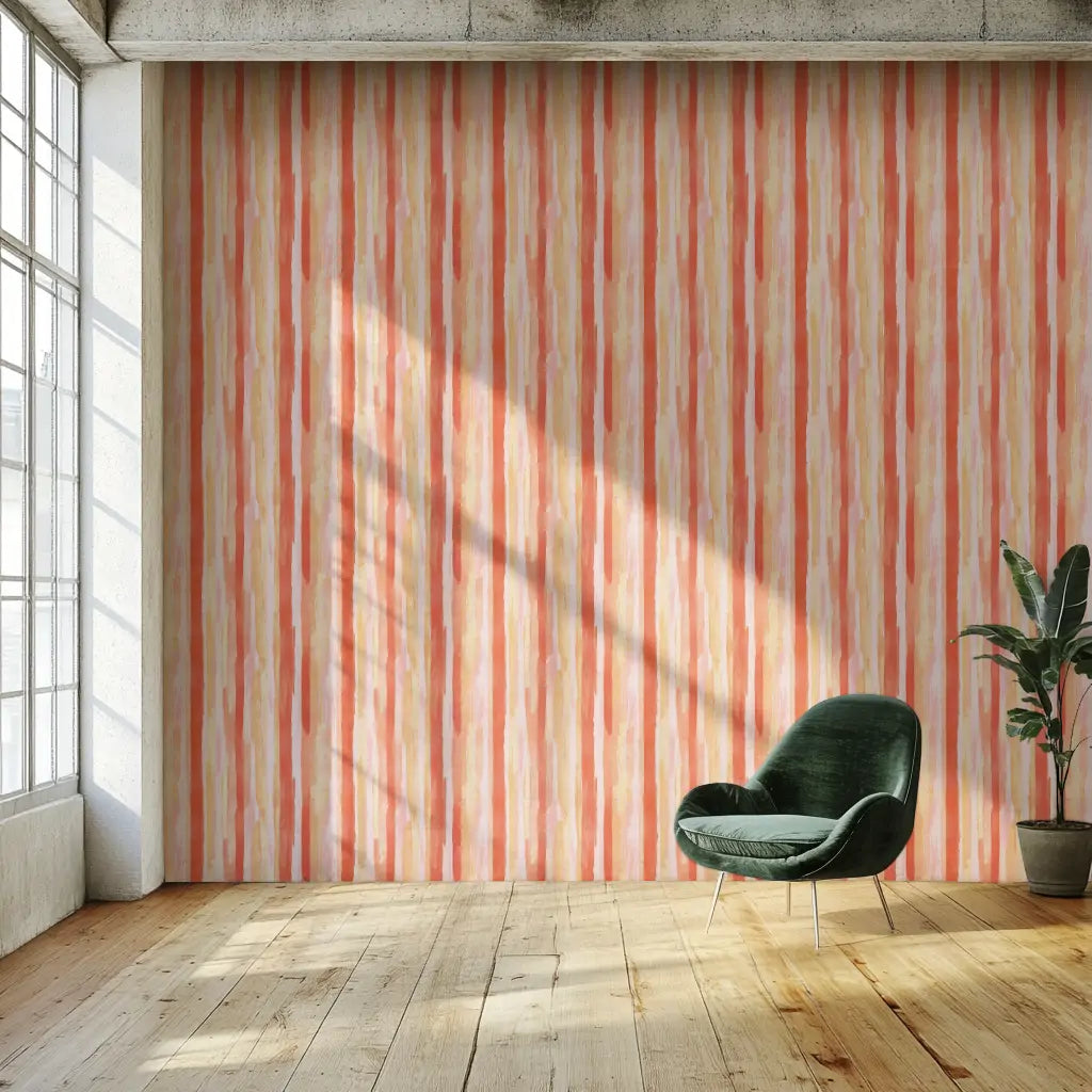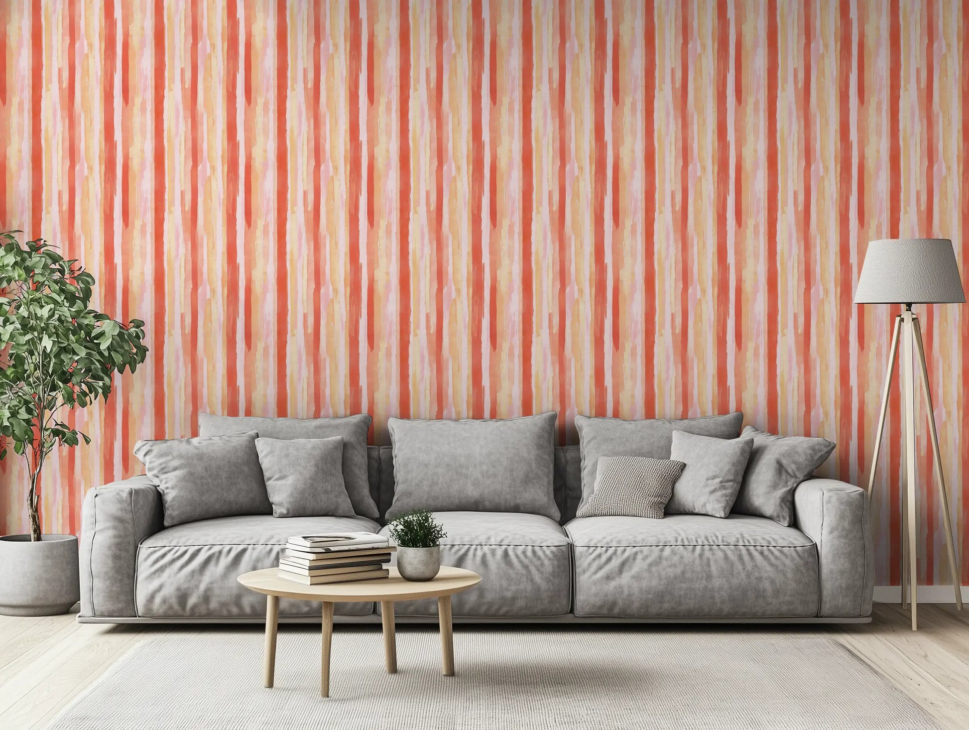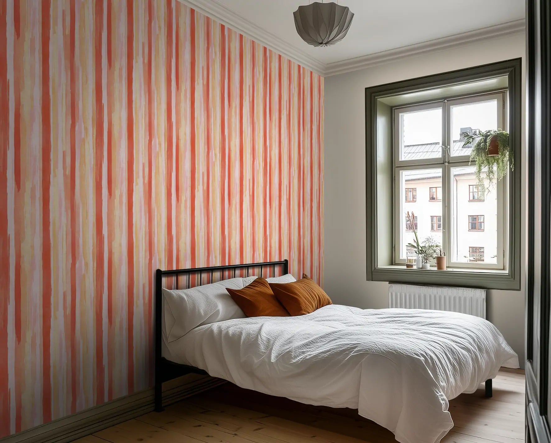 Perfect for bohemian bedrooms, Mediterranean dining spaces, or warm, inviting hallways, this sunset-striped wallpaper mural pairs beautifully with earthy ceramics, soft neutrals, and natural linen, bringing a glow of Mediterranean charm into your space.