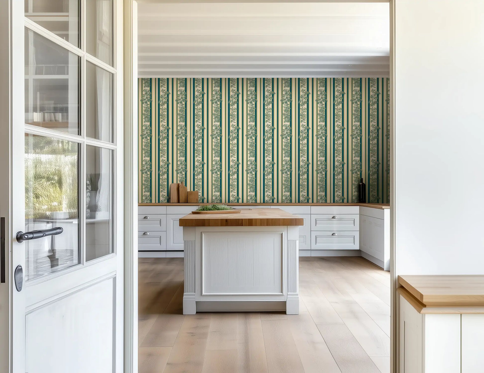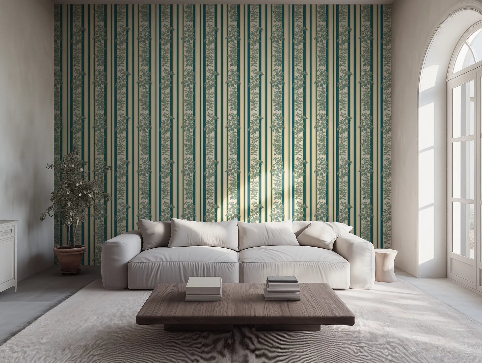 The palaces of Crete were adorned with intricate frescoes and motifs of olive branches, sea waves, and mythological creatures. Cretan Tapestry weaves together dark Mediterranean blues, muted seafoam, and subtle botanical elements, giving a regal yet natural touch to its timeless striped pattern.
