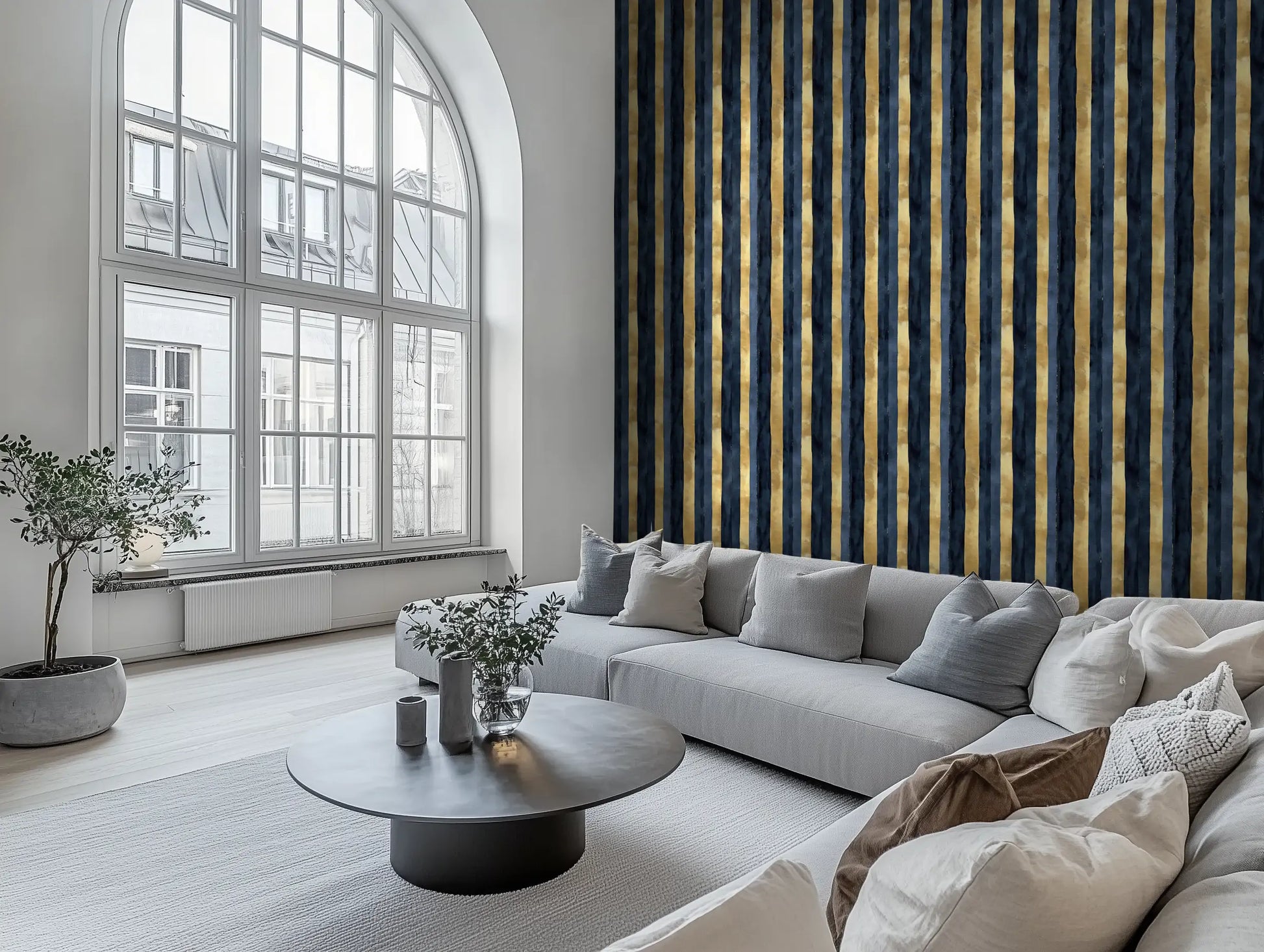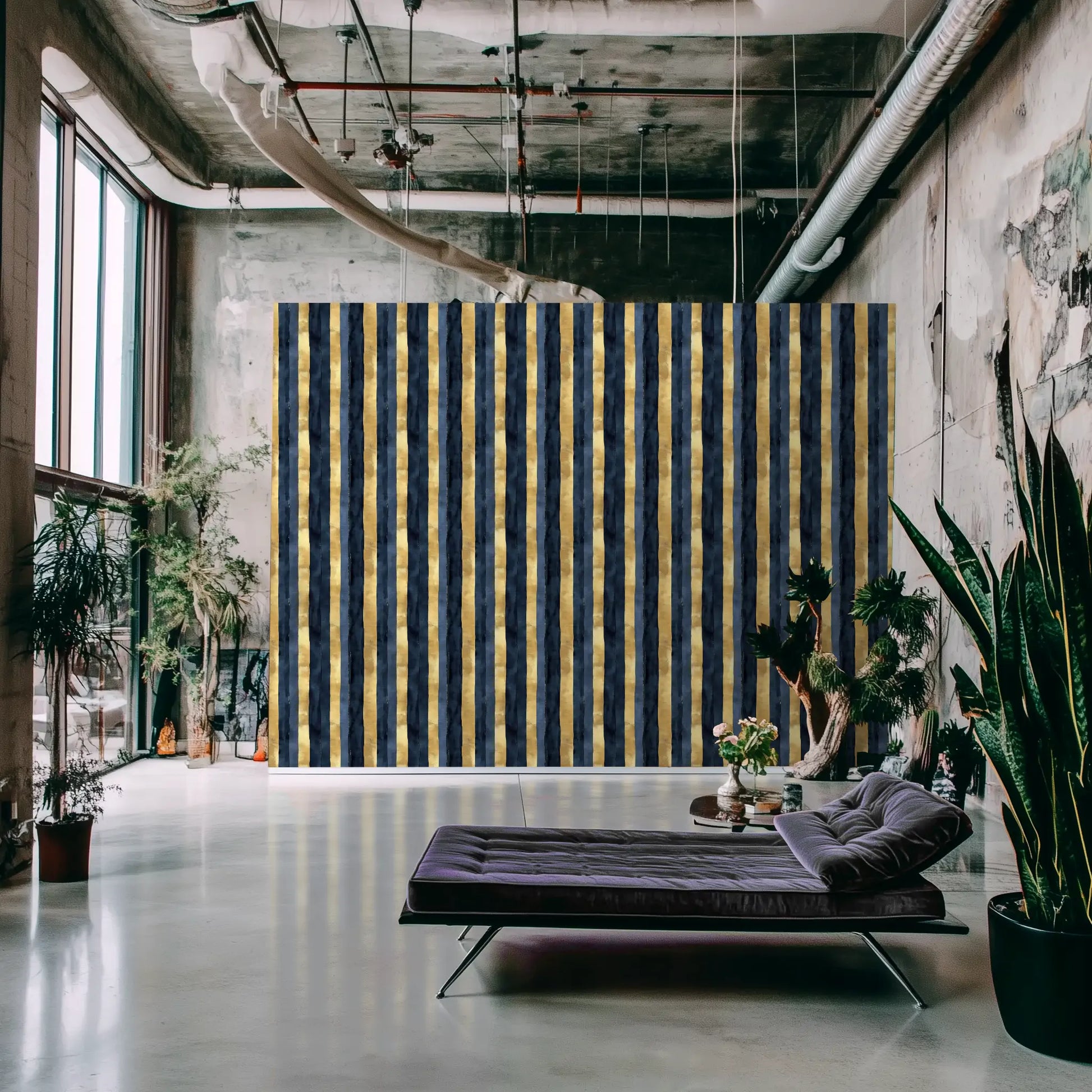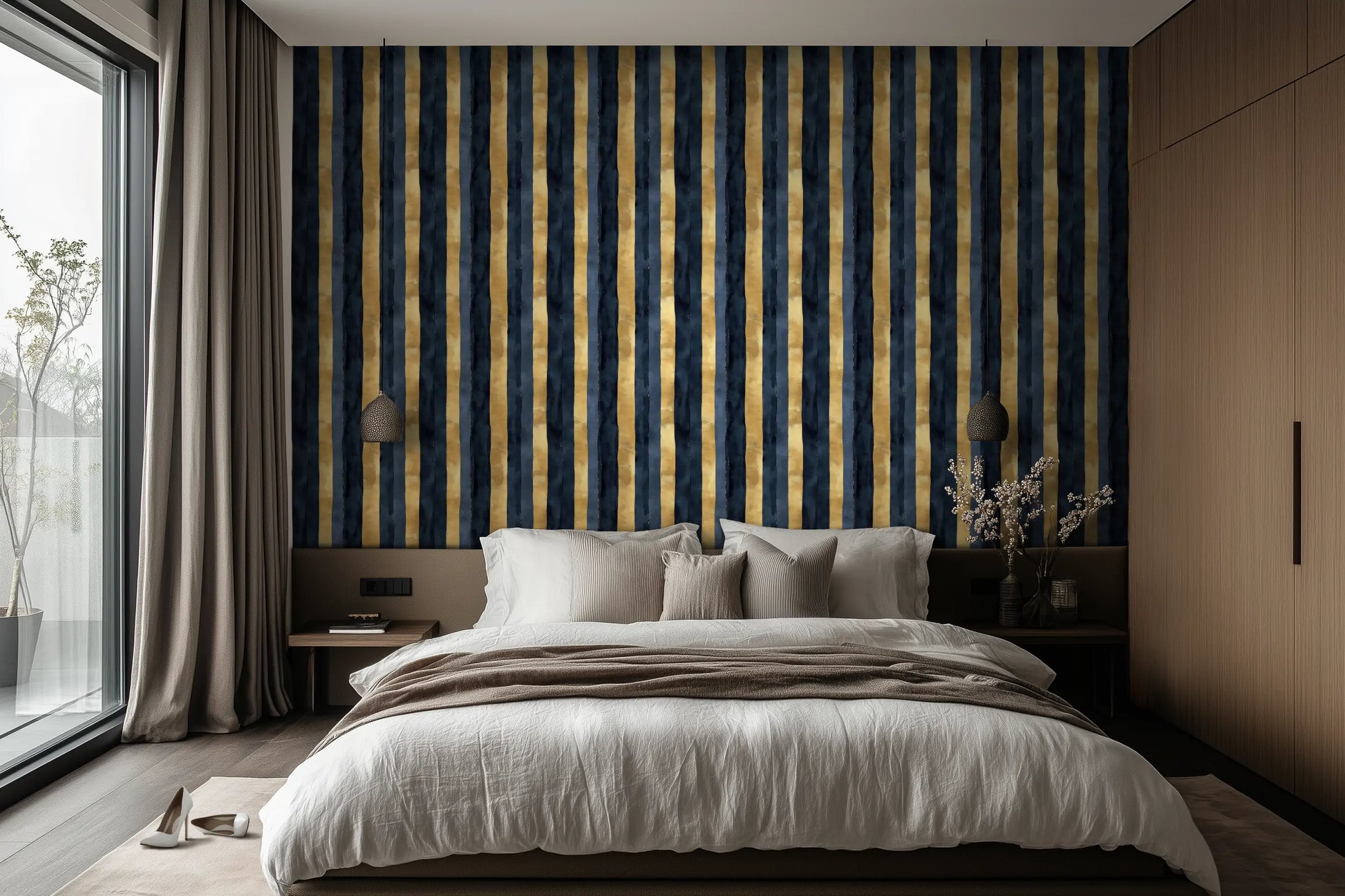 The golden light of a setting sun over the Aegean, the deep navy of ancient Greek tapestries, the mystique of legends carved in stone—Mythos channels the rich history and opulence of Greek mythology, blending midnight blue, aged gold, and soft parchment hues into regal vertical stripes.