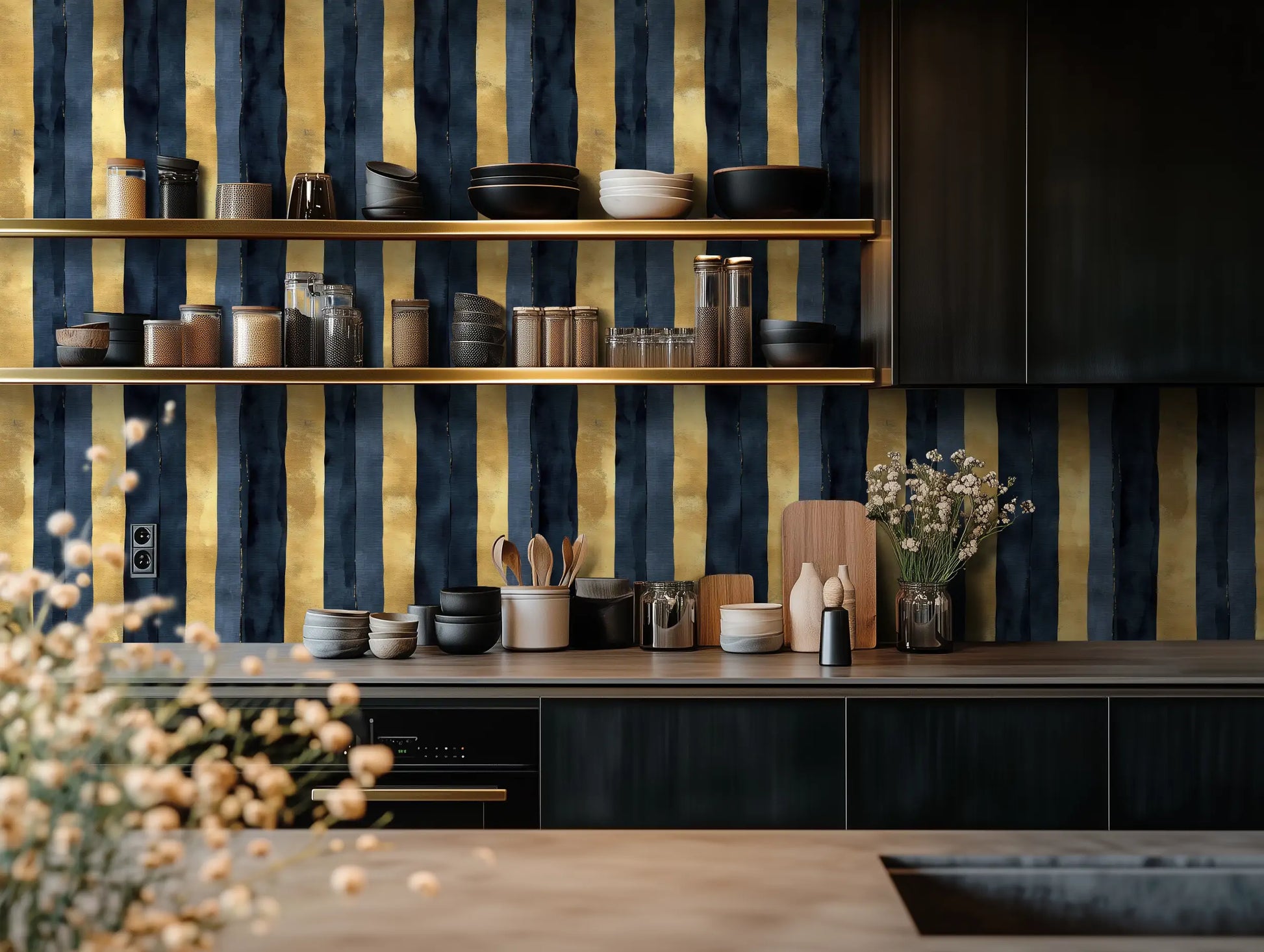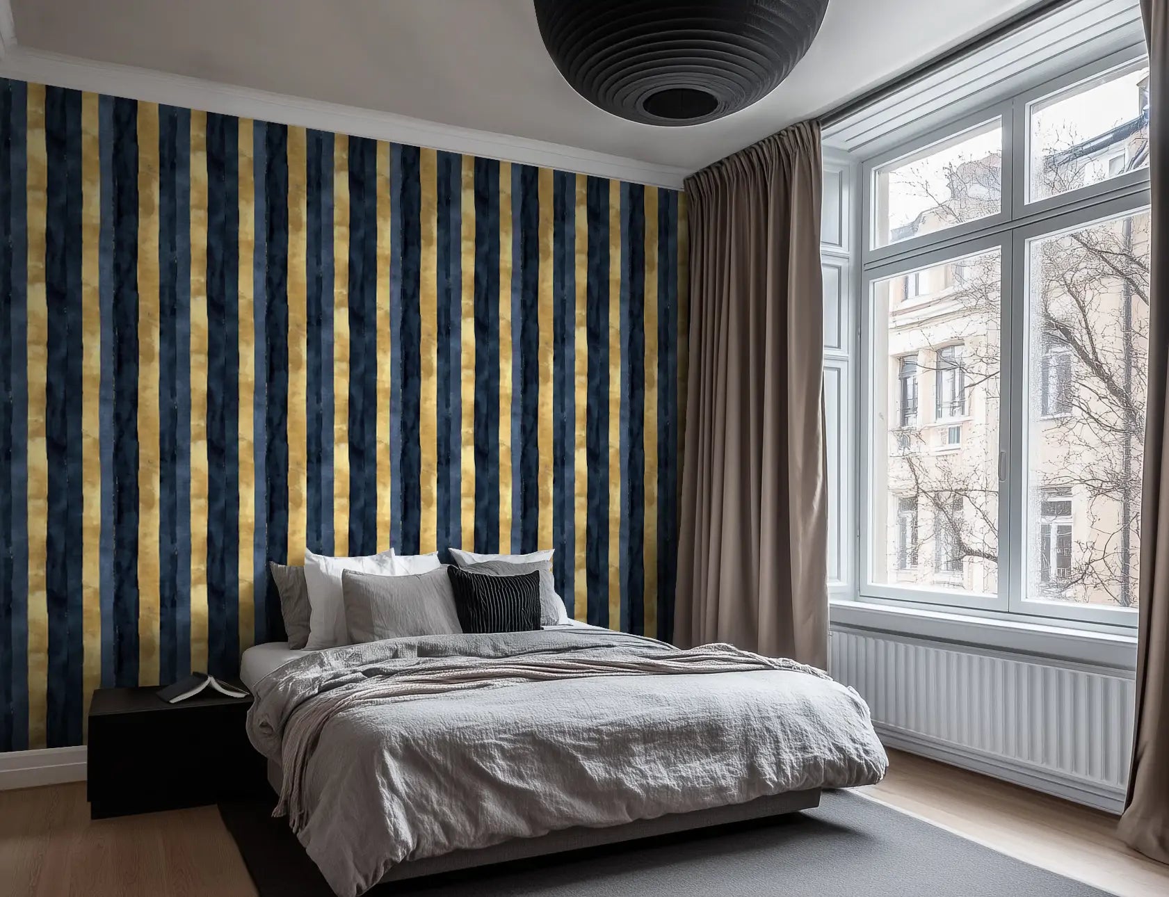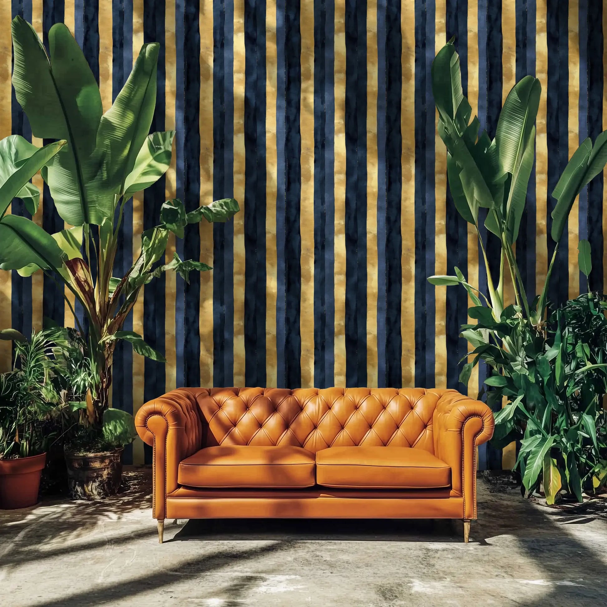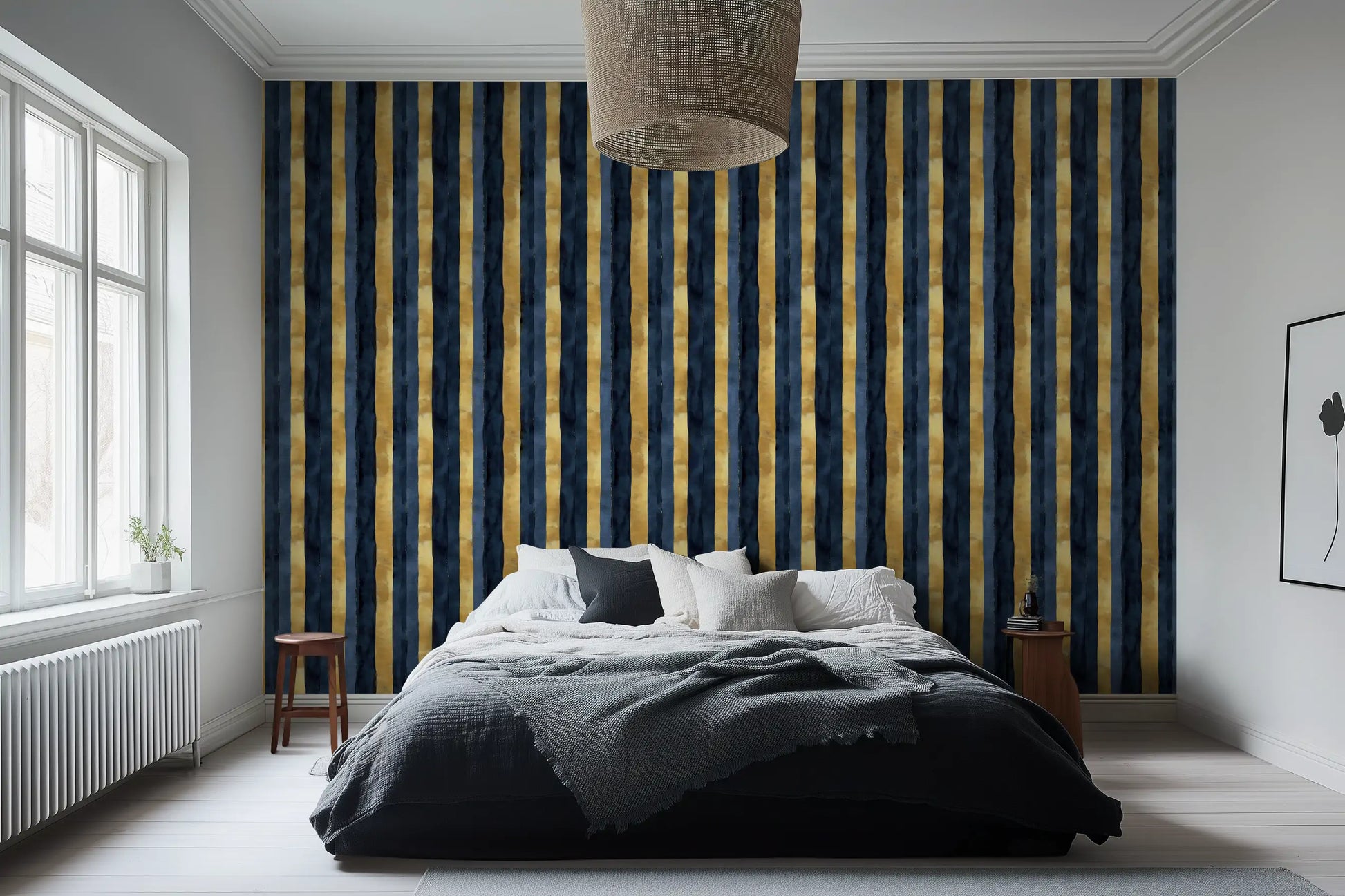 The golden light of a setting sun over the Aegean, the deep navy of ancient Greek tapestries, the mystique of legends carved in stone—Mythos channels the rich history and opulence of Greek mythology, blending midnight blue, aged gold, and soft parchment hues into regal vertical stripes.