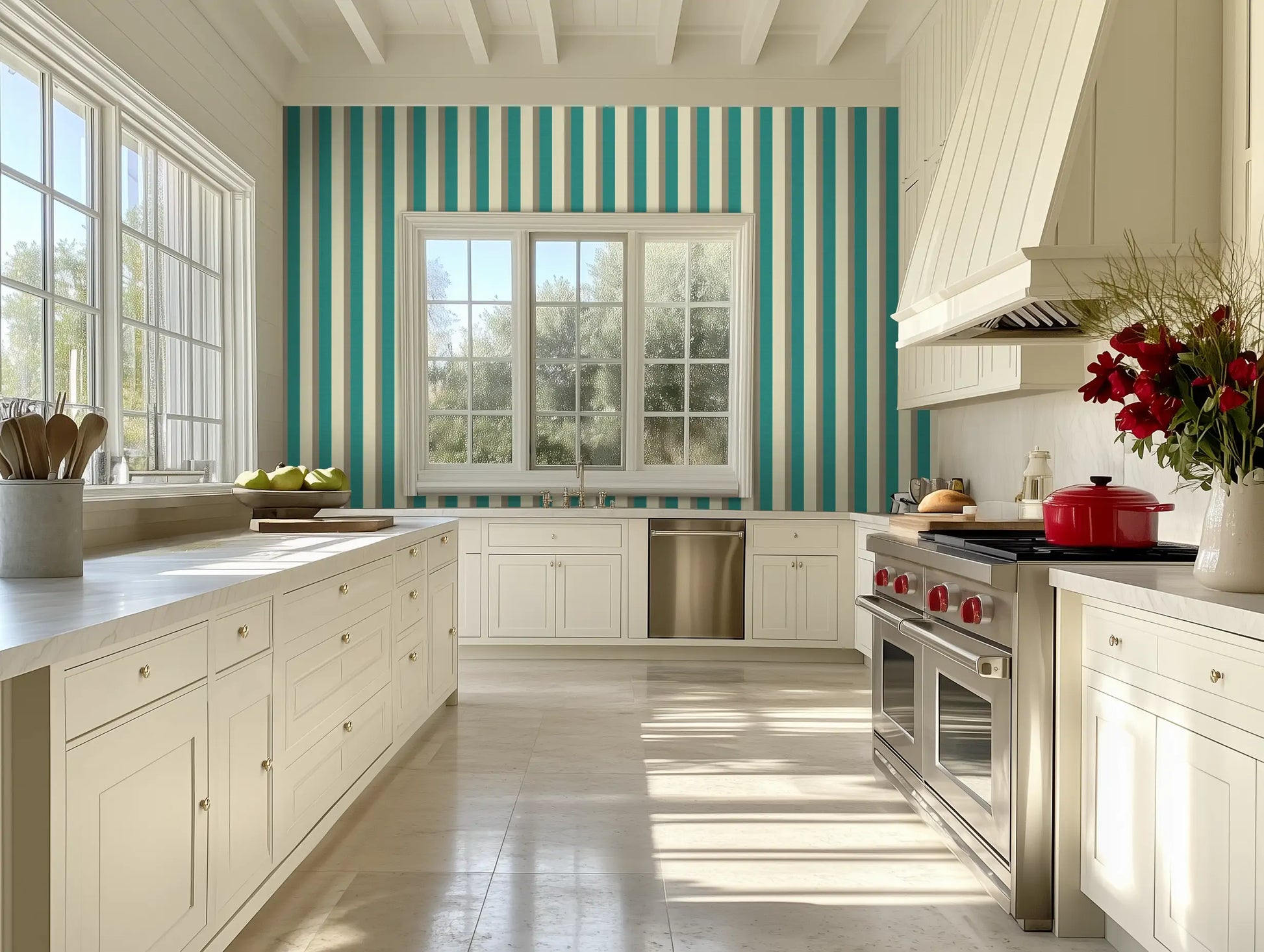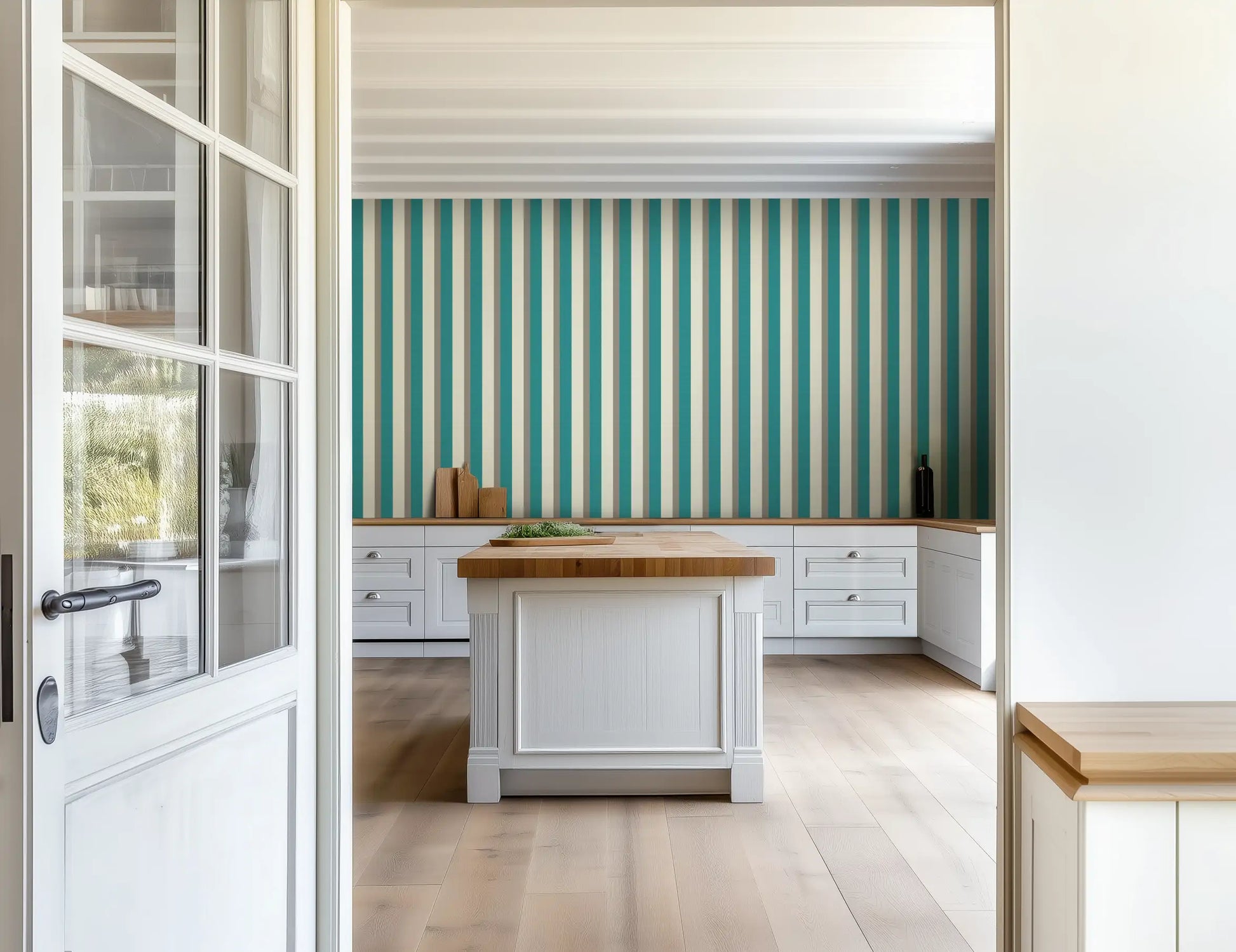 Designed for spa-like bathrooms, breezy bedrooms, or relaxed living spaces, this coastal Mediterranean wallpaper pairs beautifully with bleached wood, white linen, and handwoven rattan, bringing the spirit of the Greek islands into any space.