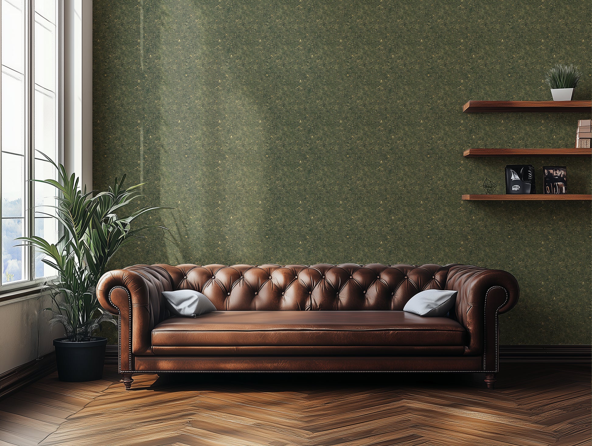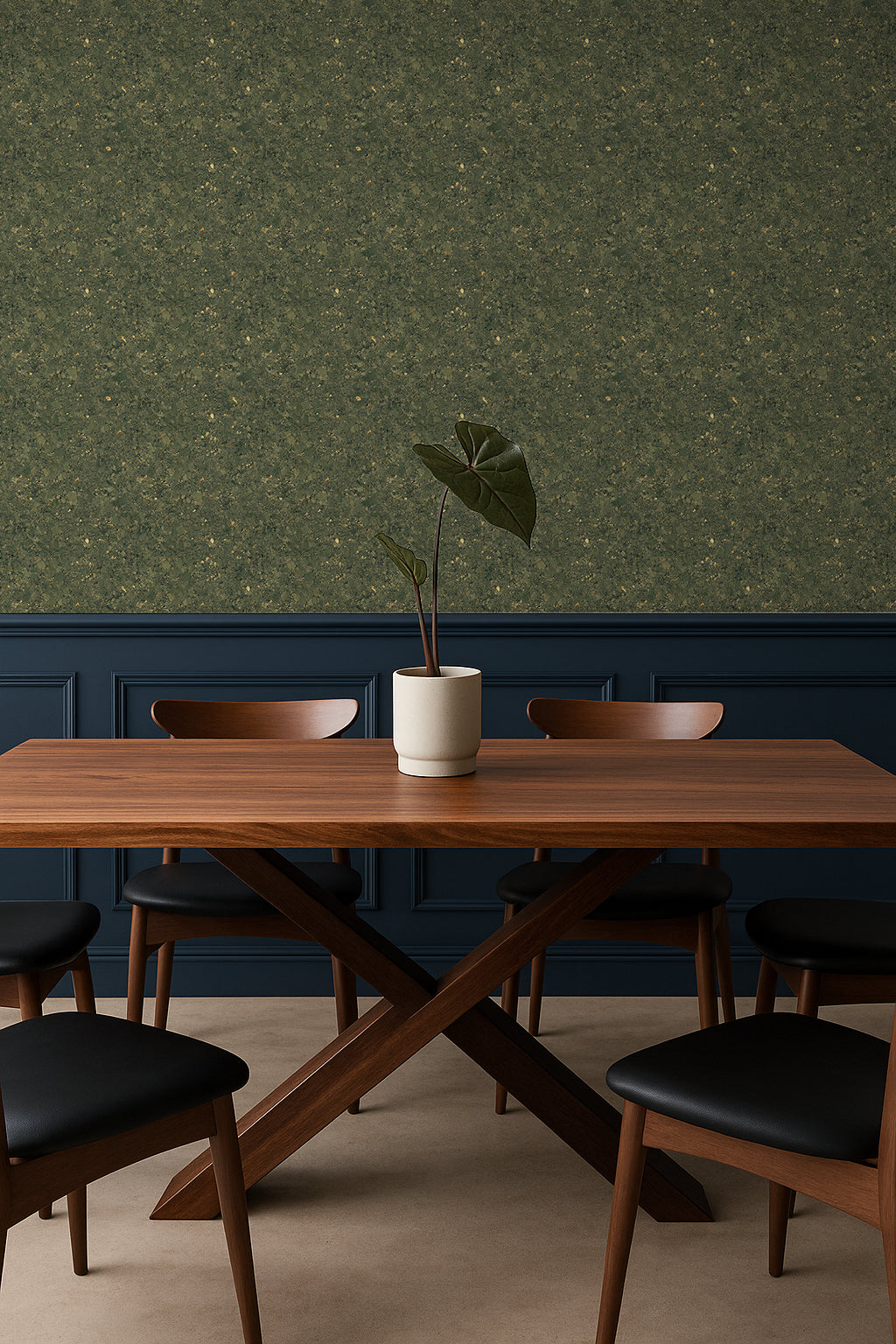 This wallpaper offers the look of natural cork with soft gold and ochre variation — rich texture without the fragility of real cork panels. Its deep green hue layers beautifully with warm woods, brass, or stone, making it ideal for library-inspired living rooms, cozy bedrooms, or modern dining spaces.