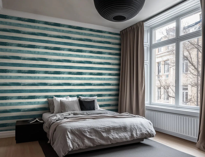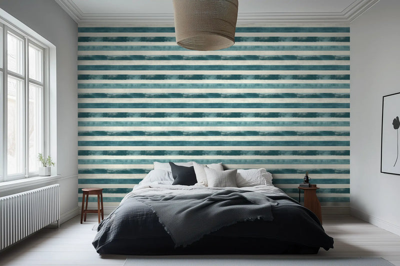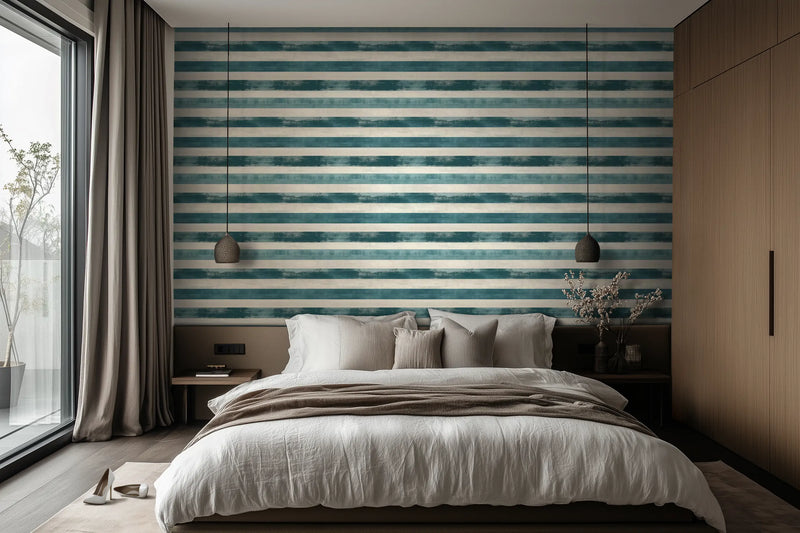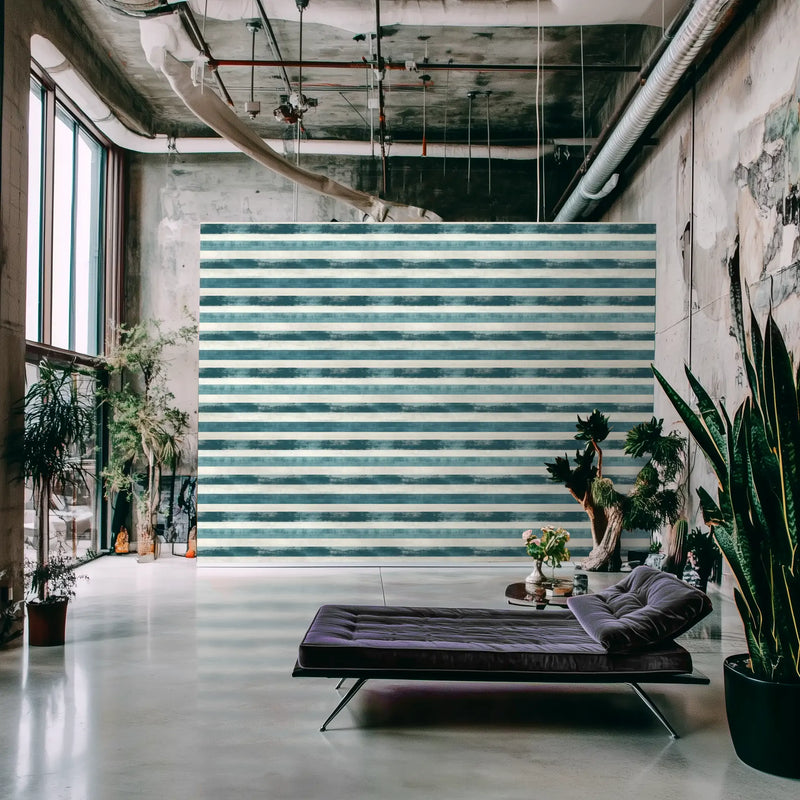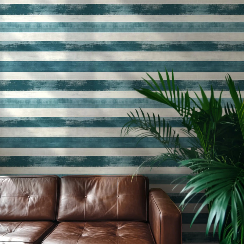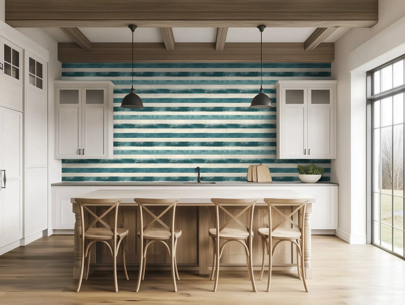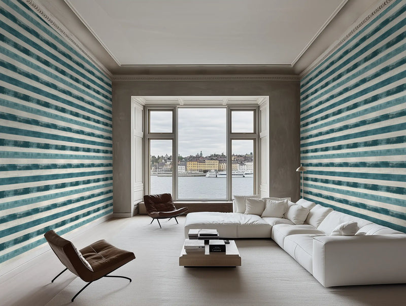 Designed for coastal retreats, minimalist interiors, or Mediterranean-inspired living rooms, this blue and white striped wallpaper pairs effortlessly with raw stone, wicker accents, and breezy linen curtains, creating an atmosphere that feels timeless, fresh, and sun-drenched.