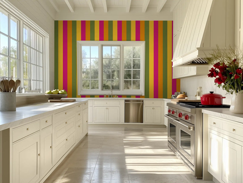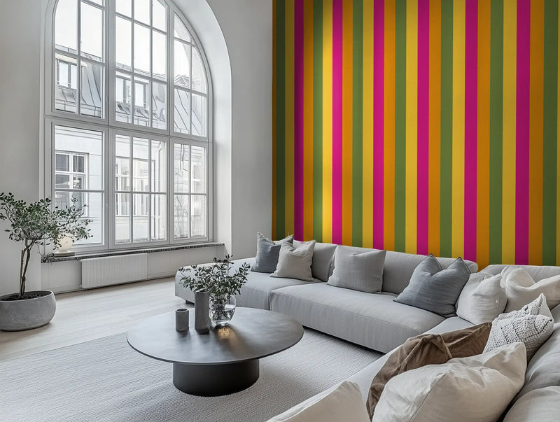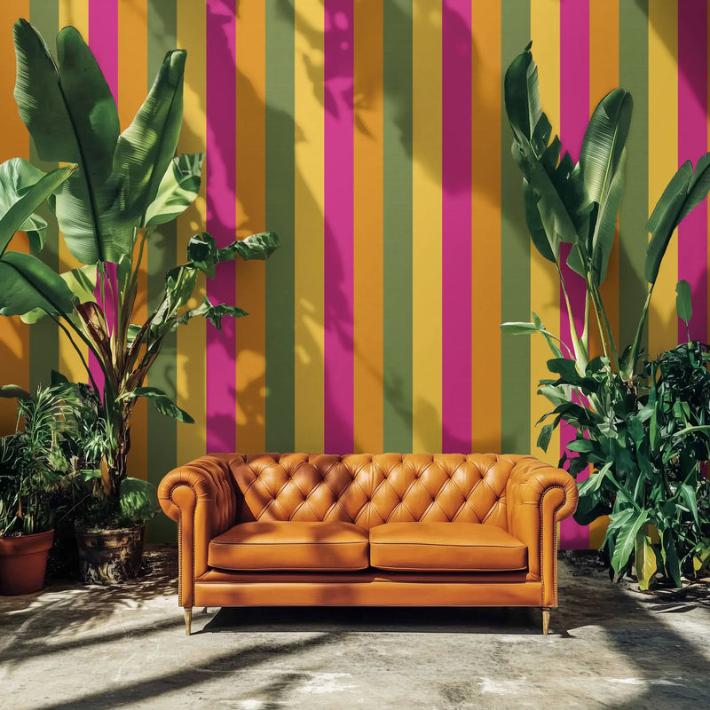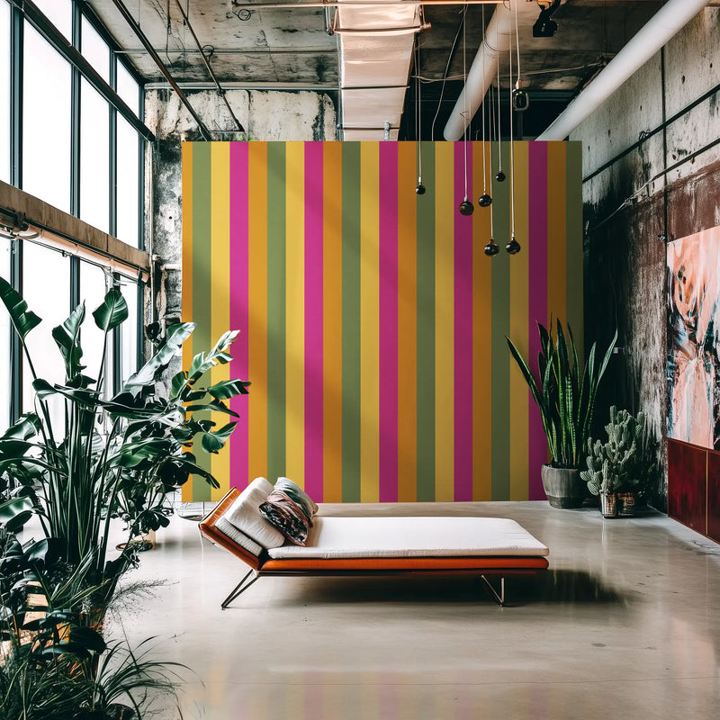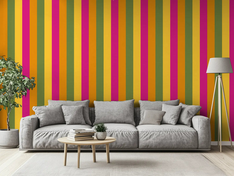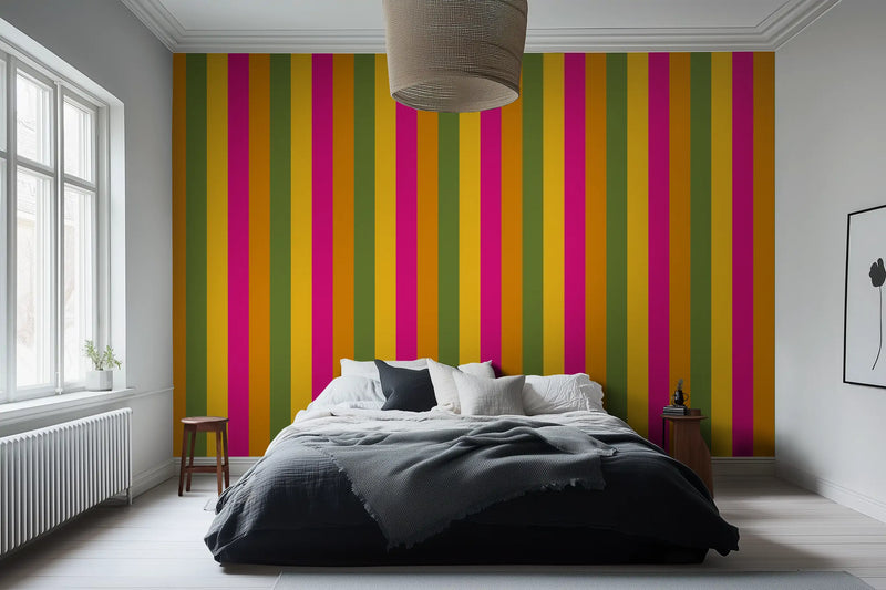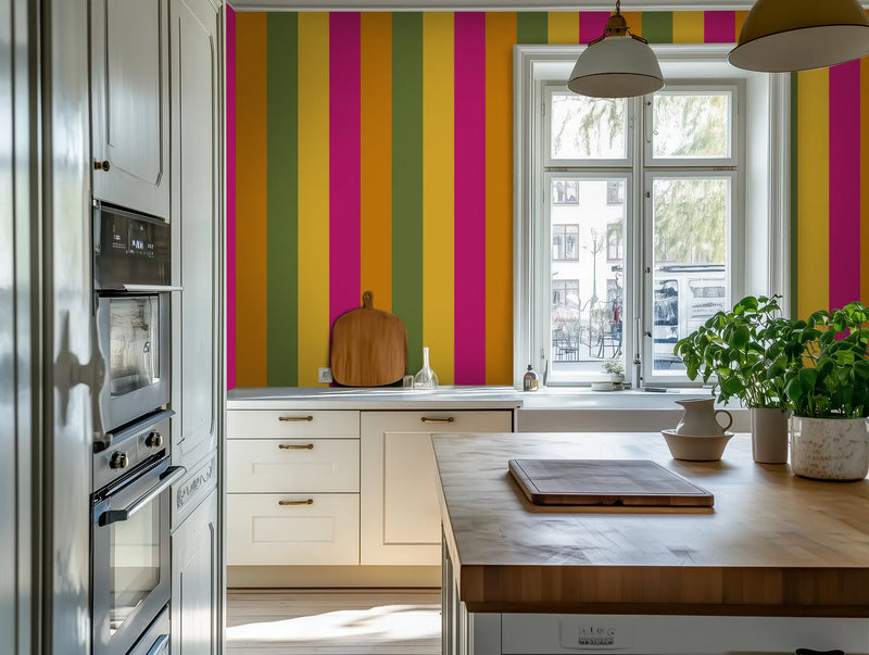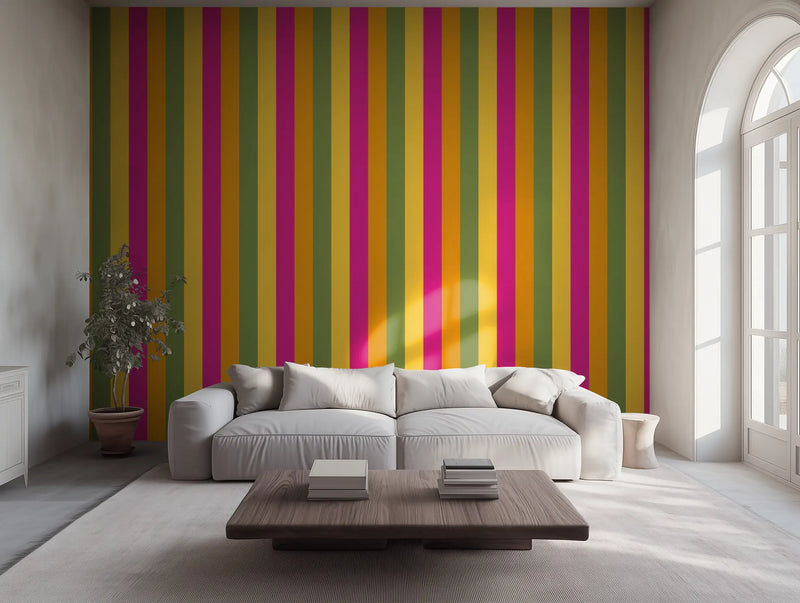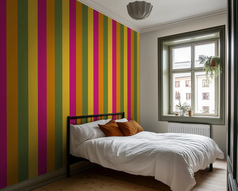 Kolkata is a city of deep tradition and unstoppable energy, a place where colonial history meets vibrant street life. We pulled from its bright mustard yellows, deep magentas, and rich sunset oranges—the colors of bustling markets, handwoven saris, and grand old buildings weathered by time—and transformed them into a high-energy striped wallpaper mural that radiates warmth and culture.