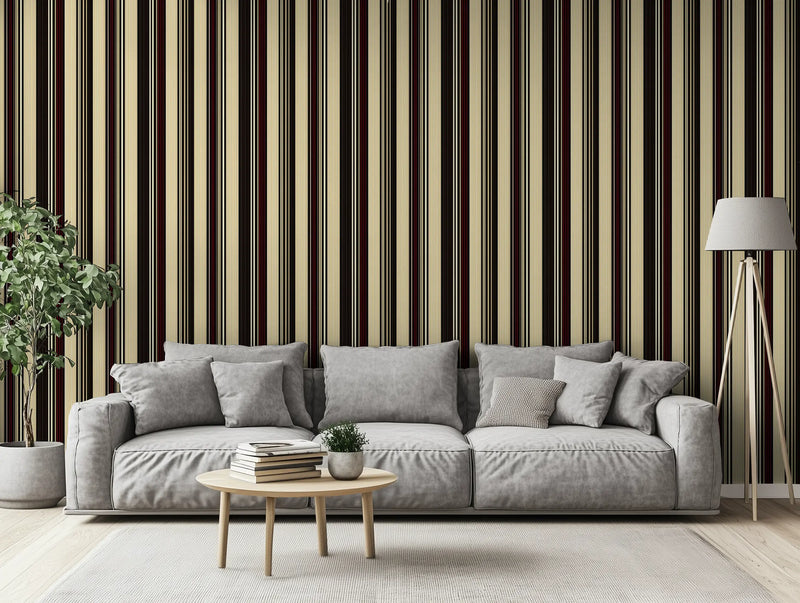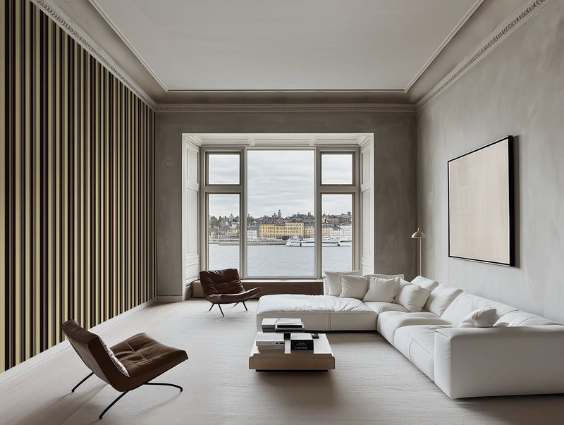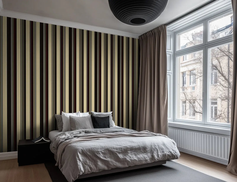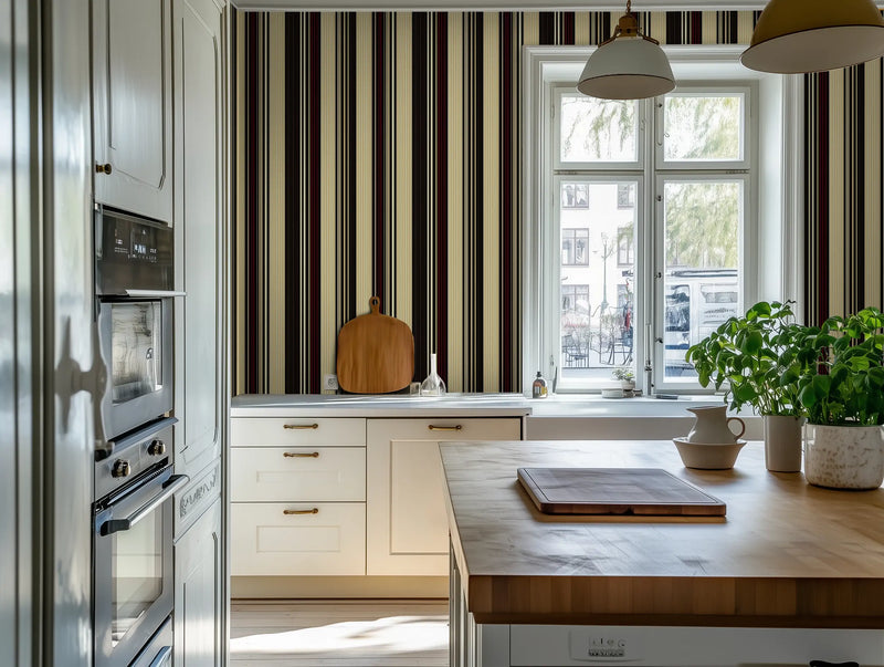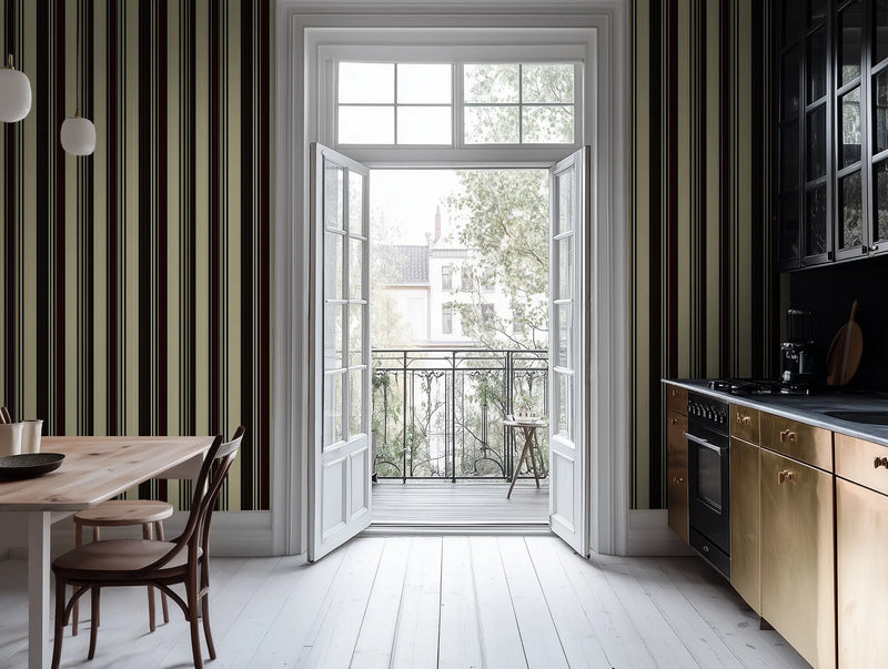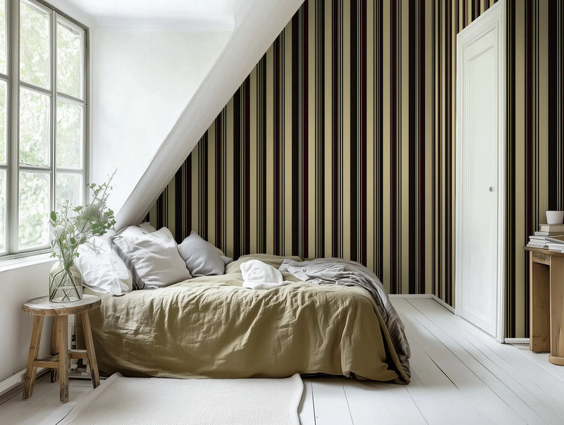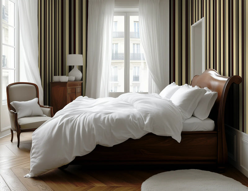 Short, bold, and intense—Ristretto is a powerful take on espresso culture, where rich, roasted hues meet sleek, dynamic stripes. Inspired by the contrast of dark coffee and golden crema, this wallpaper blends espresso black, deep mahogany, and warm gold into a striking, luxurious design that feels both vintage and contemporary.
