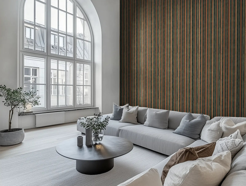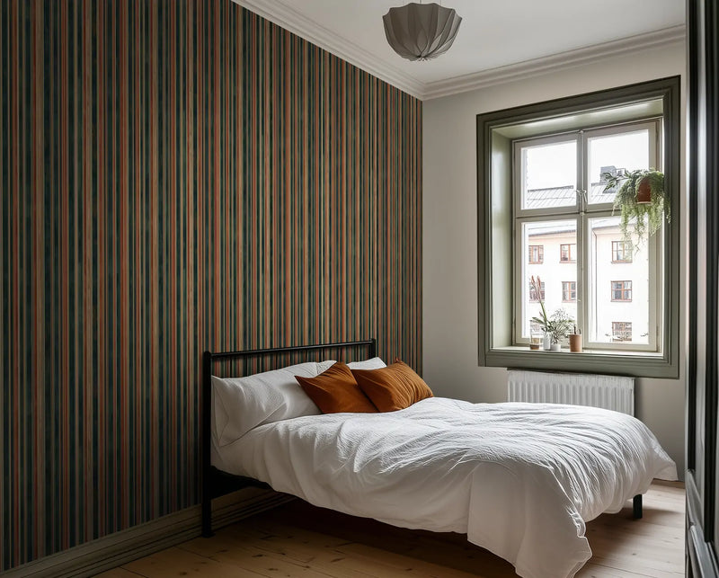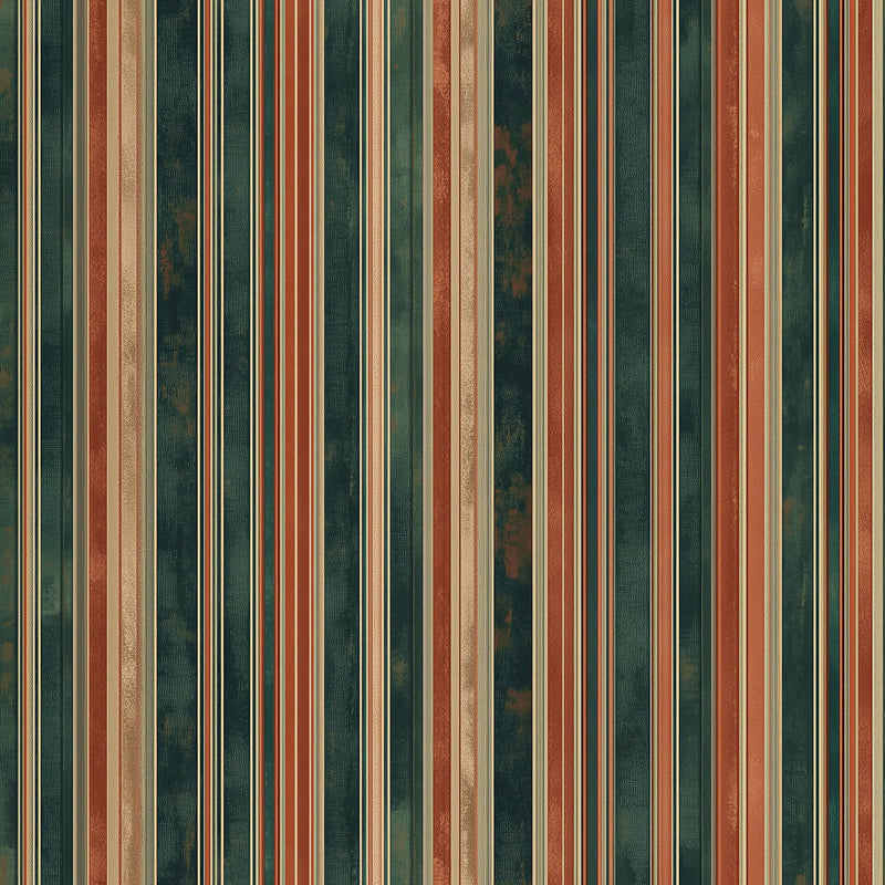A walk through the spice souks—rows of saffron, paprika, cinnamon, and cumin piled high in brass bowls, their colors rich and intoxicating. Spice Souk takes this vibrant, well-traveled palette and transforms it into a classic, vintage-inspired striped wallpaper, with deep teal, burnt sienna, and faded gold hues.