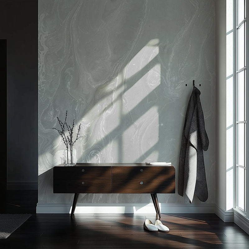 How it fits into current design trends: Tonal grey marble wallpapers are rising in Japandi and quiet luxury spaces, where natural materials and visual softness set the tone.