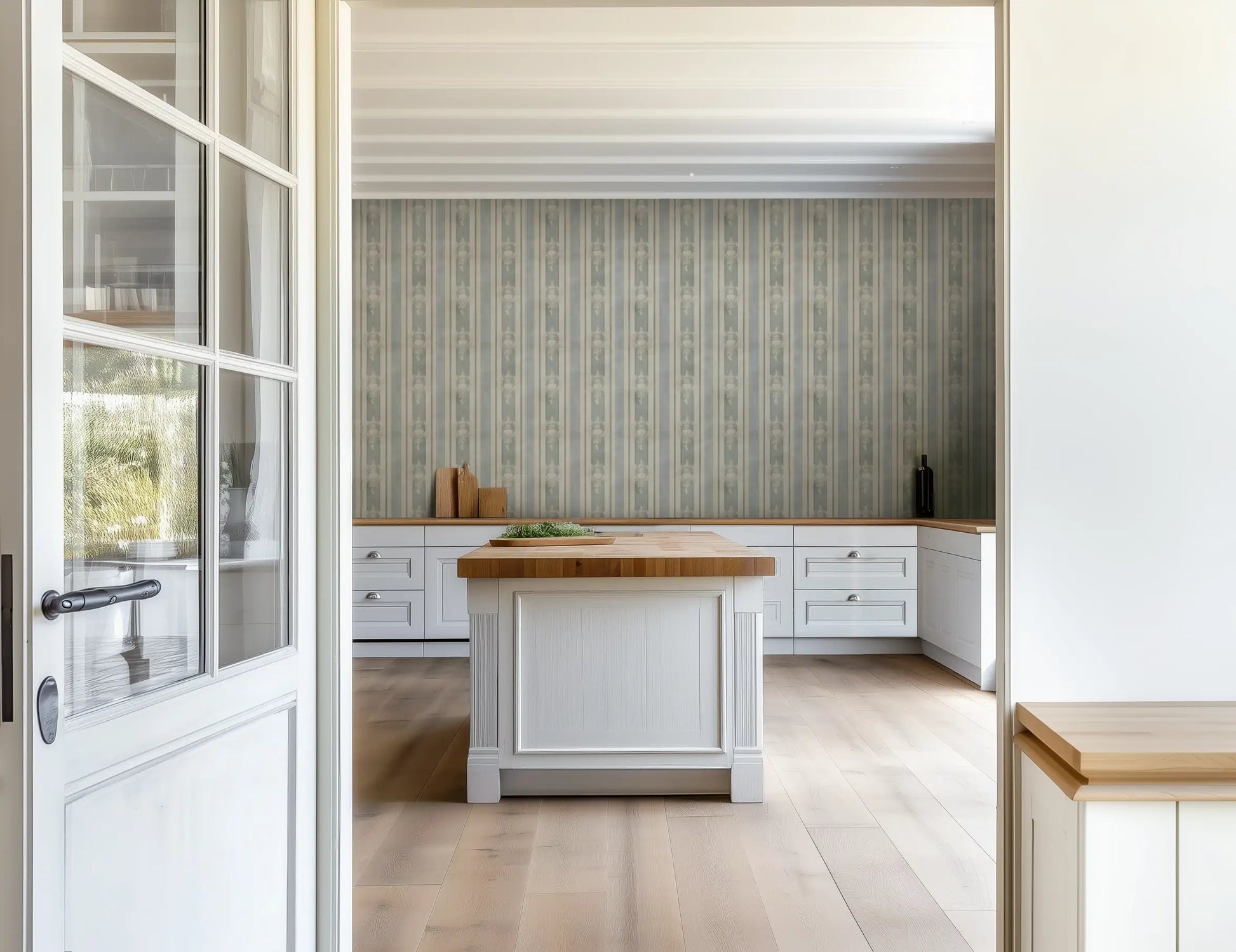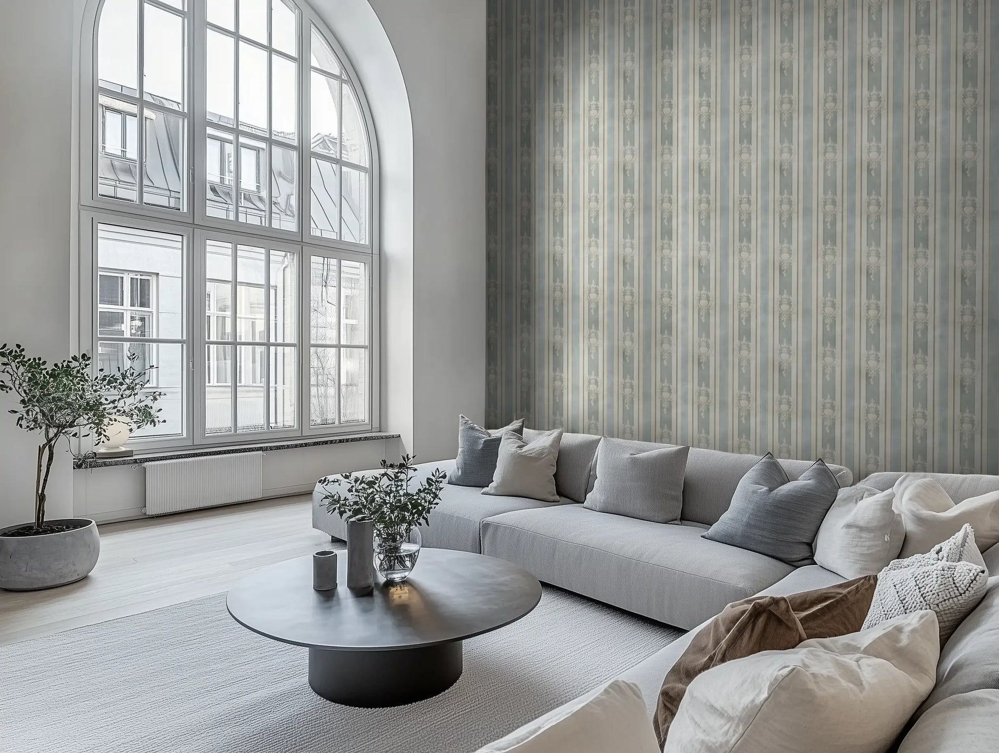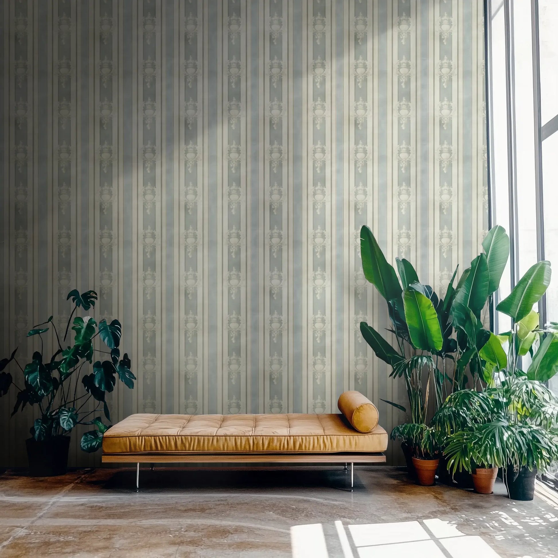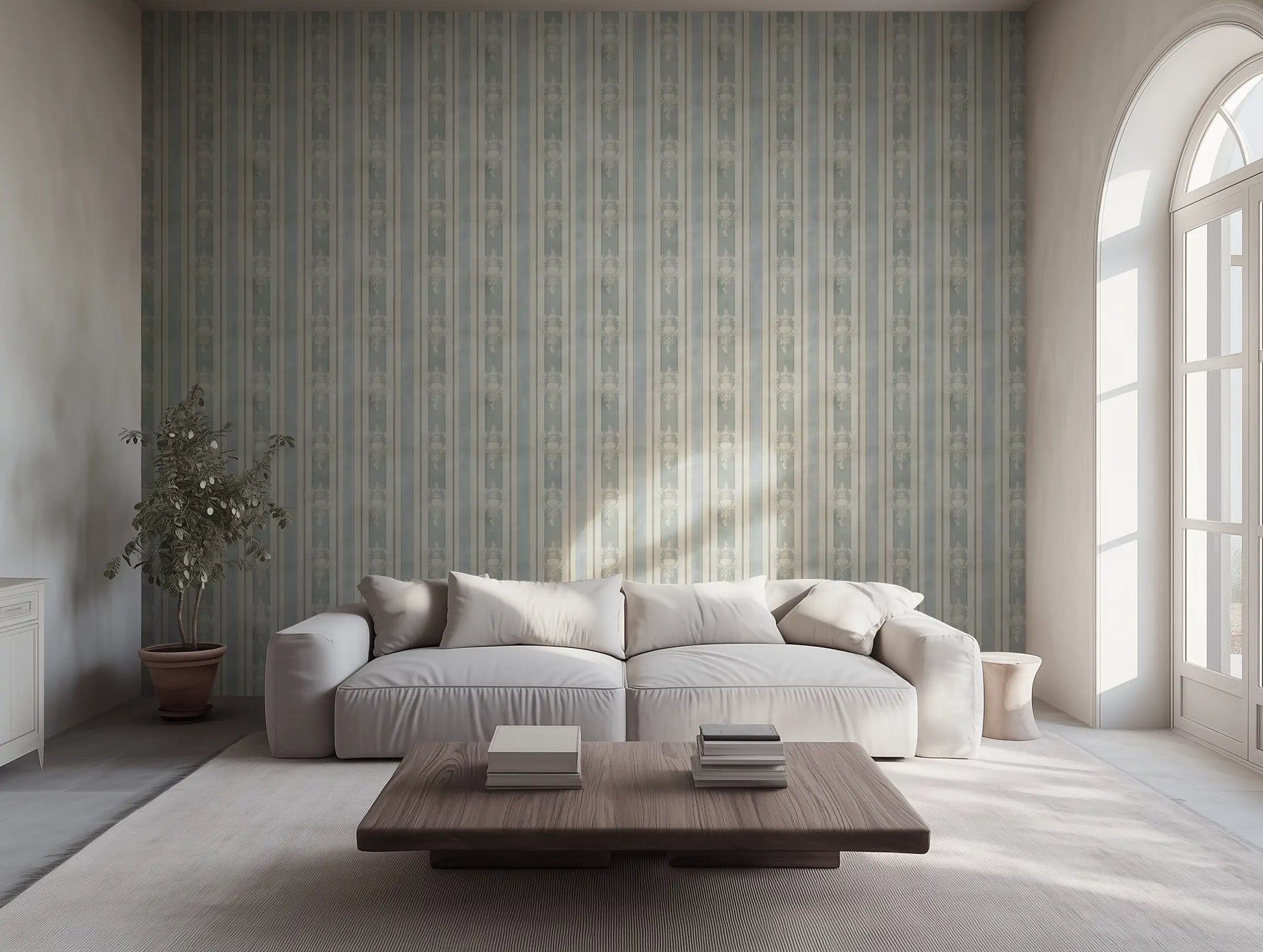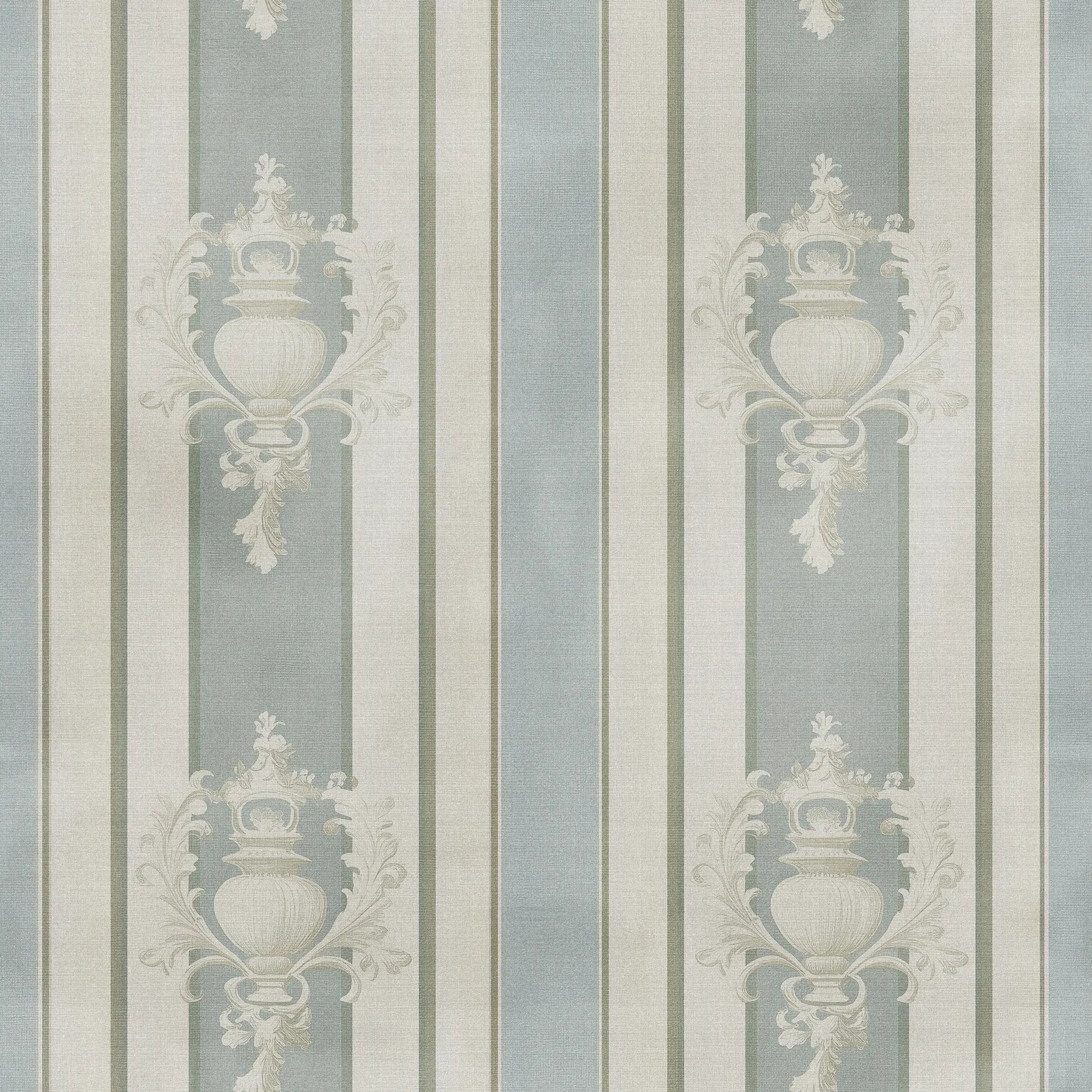 Château Bleu captures this understated elegance, blending soft morning-sky blues, sun-faded cream, and the warmth of aged plaster into a classic French stripe design. Delicate urn motifs weave through the pattern, whispering of a past that still lingers—timeless, storied, and effortlessly refined.