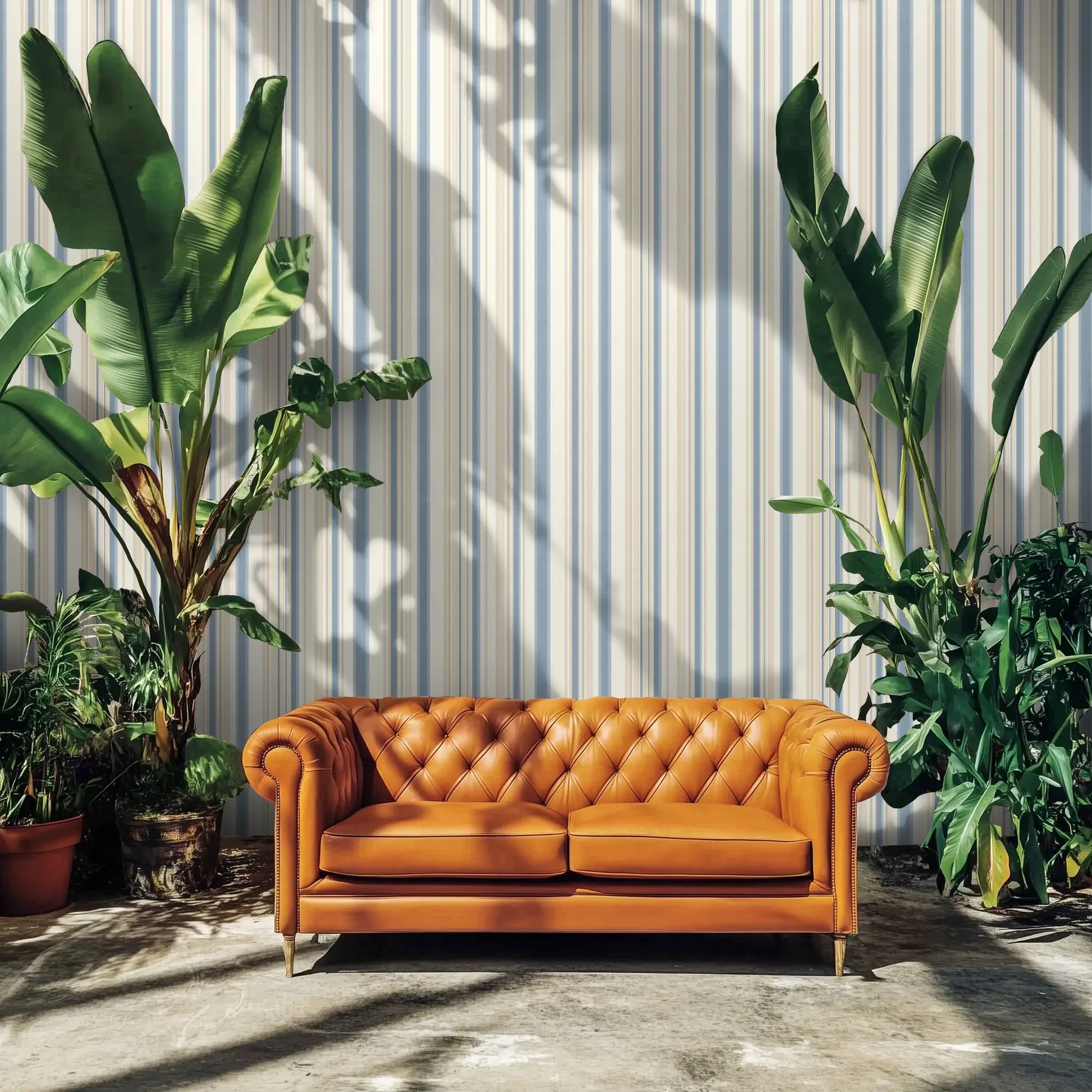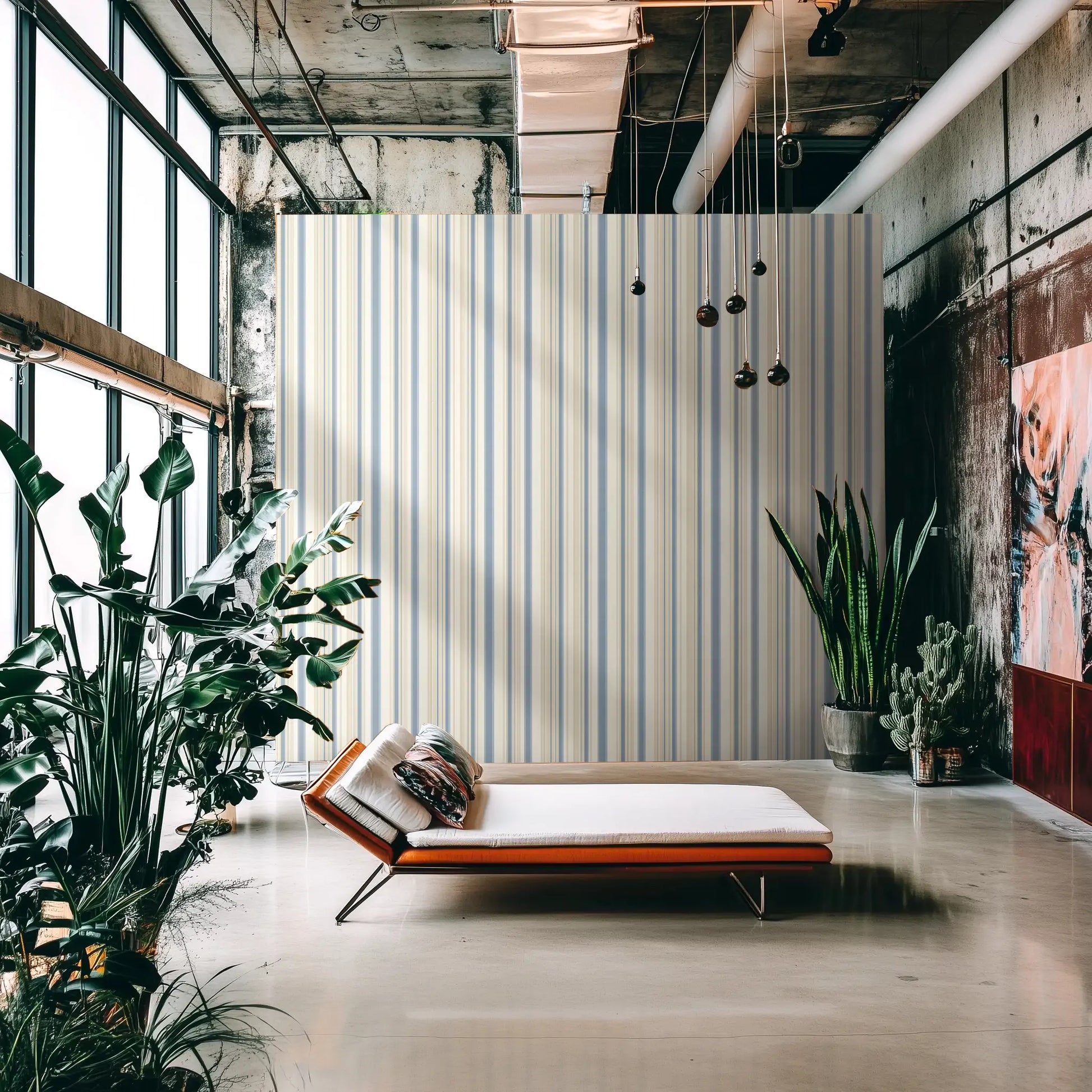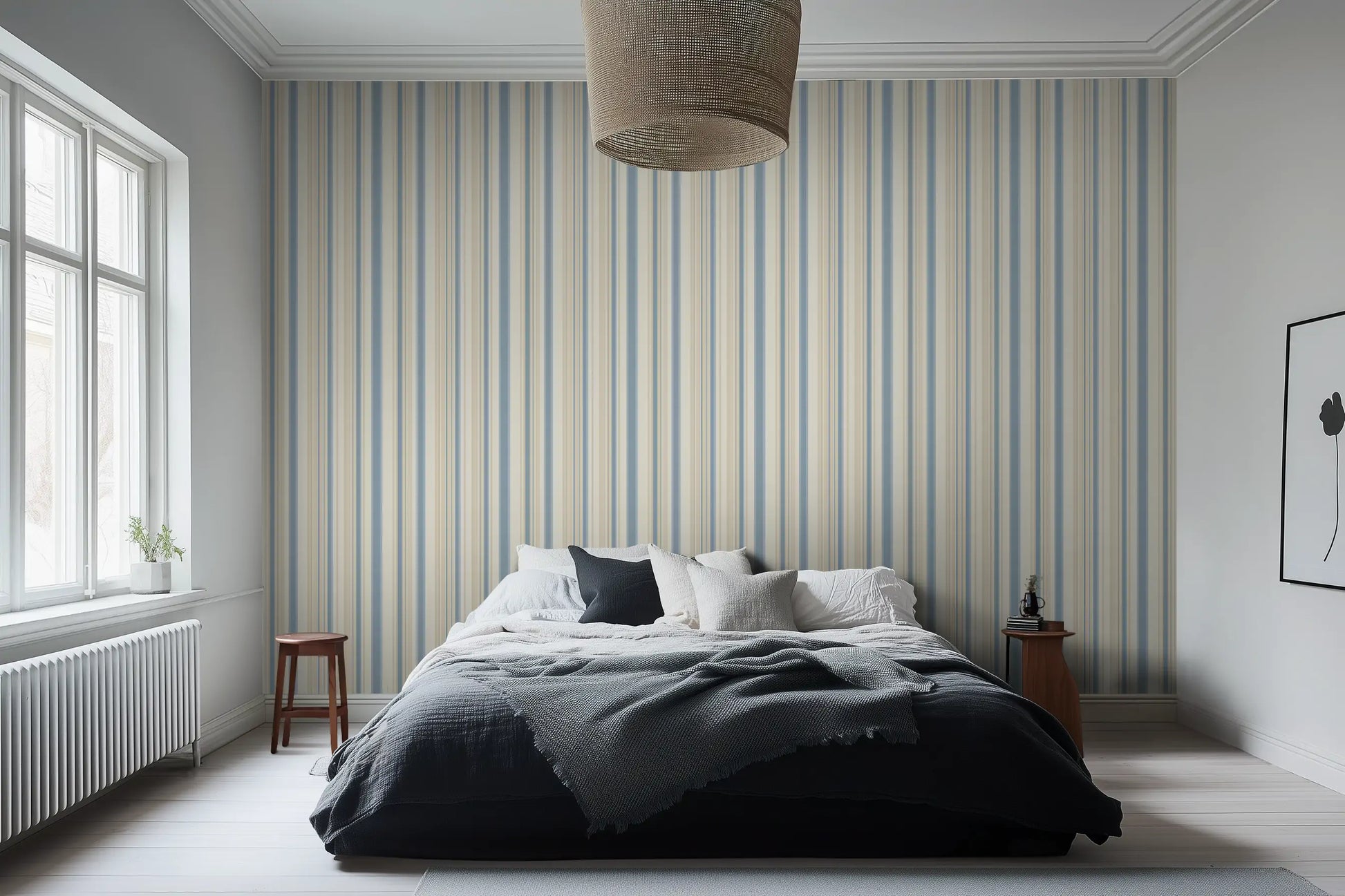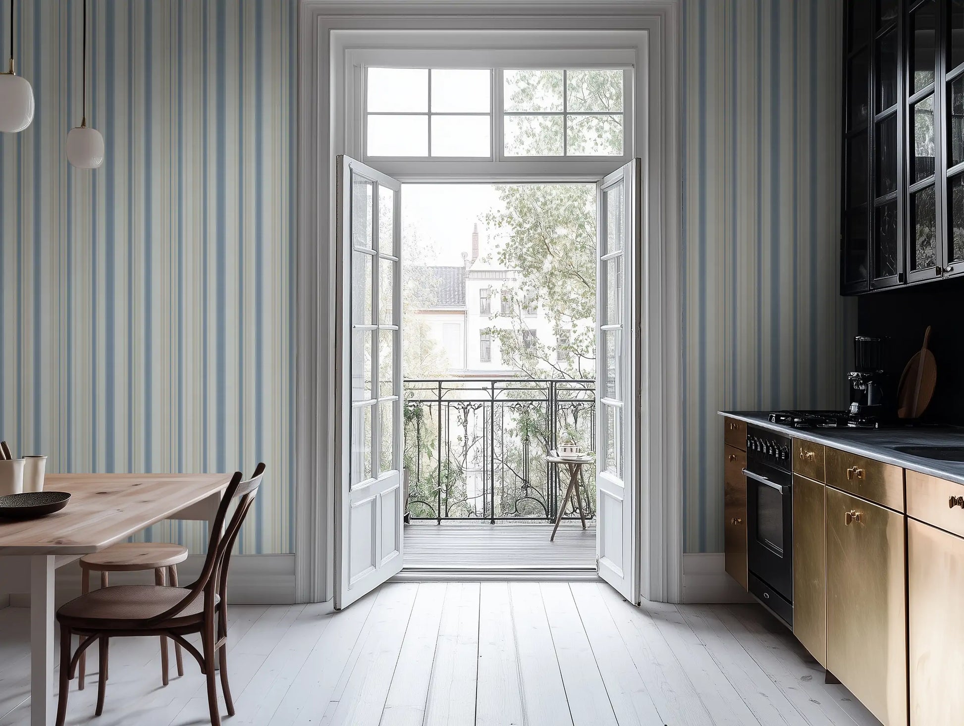 Perfect for serene bedrooms, airy living spaces, or heritage-inspired kitchens, this soft vintage striped wallpaper pairs effortlessly with light-washed wood, antique porcelain, and woven rattan accents, bringing a sense of calm, sophistication, and effortless charm.