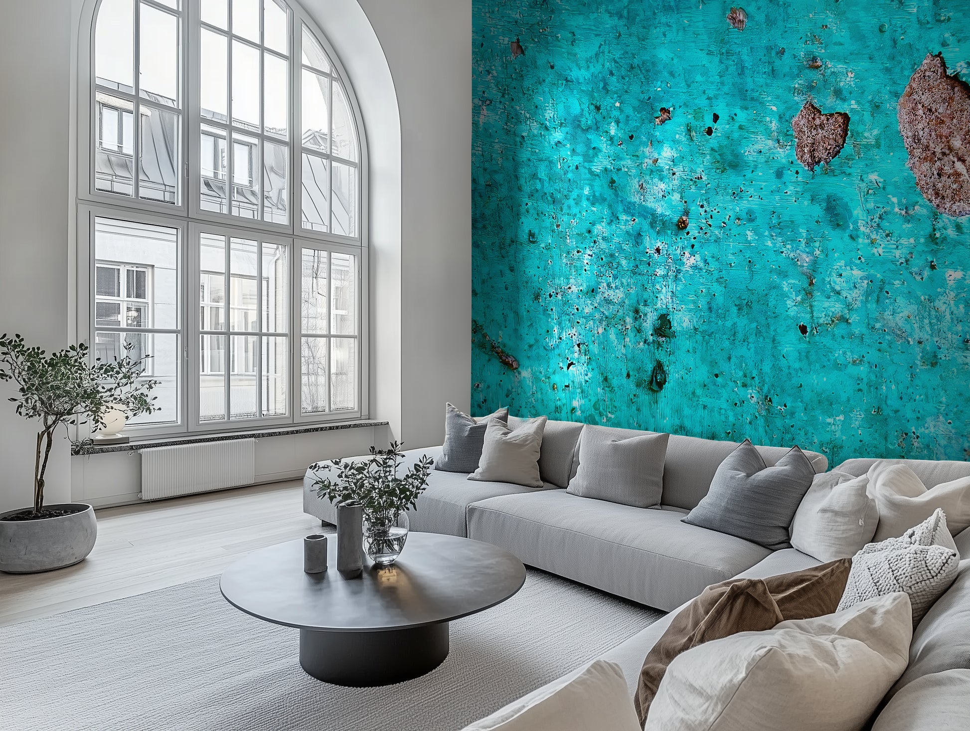 Turquoise metal breaks and peels, revealing rusted copper underneath—like decay in full bloom. Corrosion Bloom is graphic, painterly, and surprisingly vibrant. A wall mural for those who find beauty in breakdown.