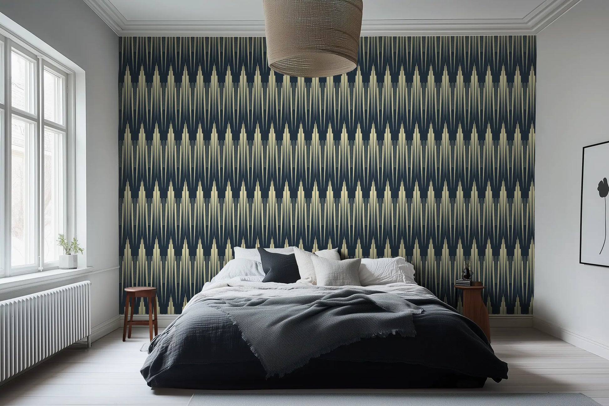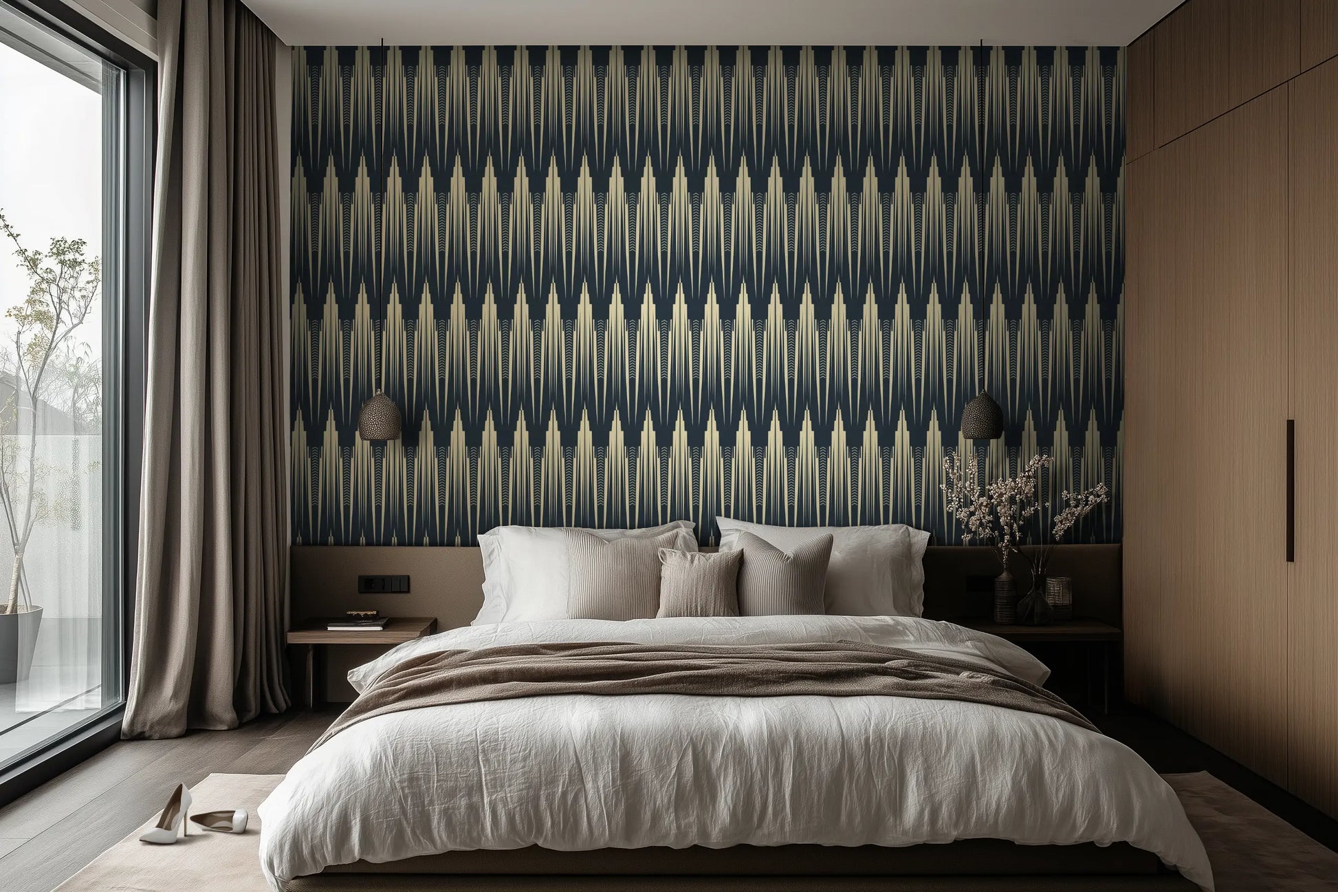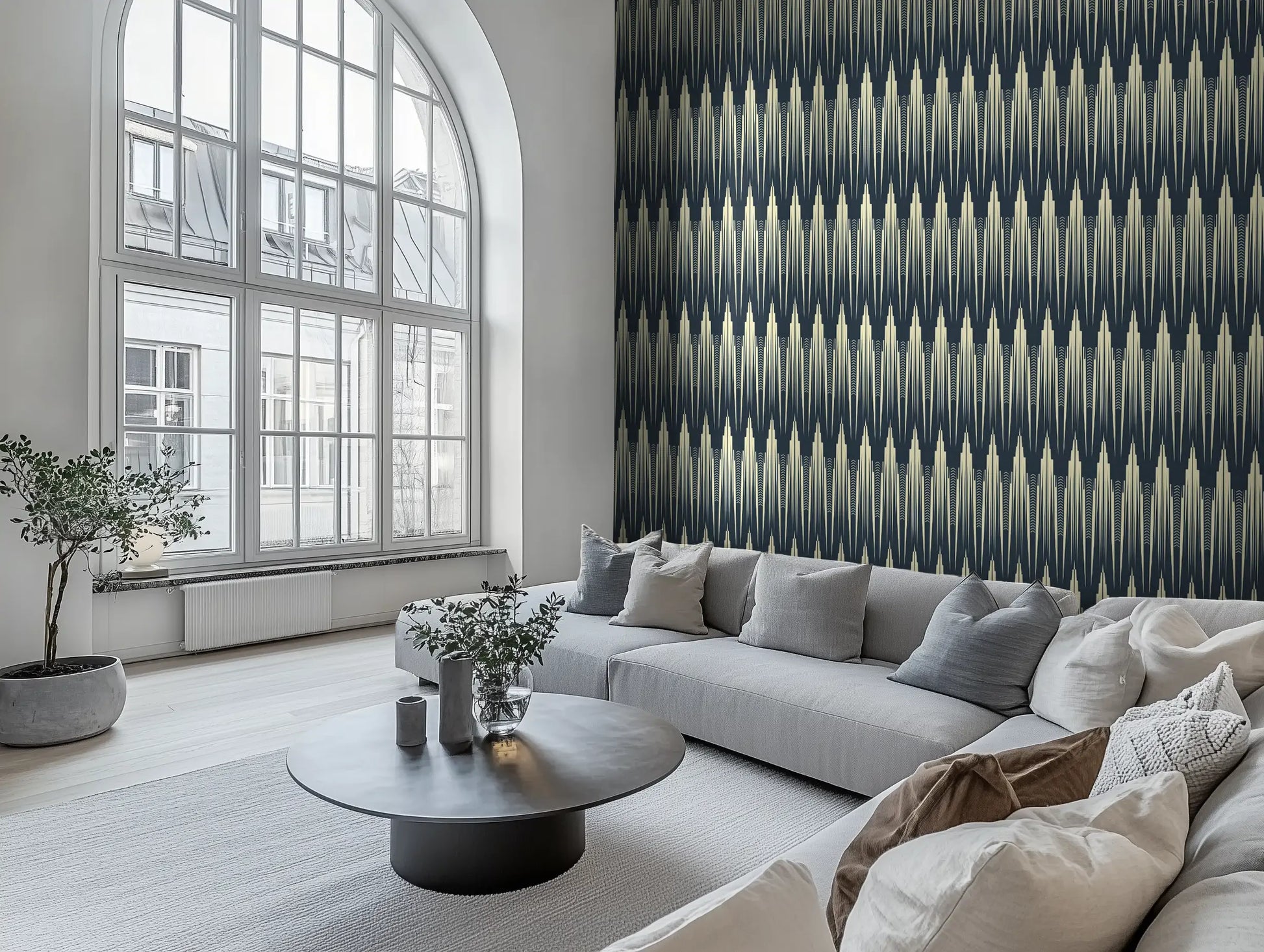 The deep ink-blue silhouettes rise from a warm ivory base, creating a sense of both height and depth, perfect for living rooms, entryways, dining spaces, or a bold, architectural bedroom feature wall. Whether paired with brass fixtures, smoked glass, or rich velvet accents, Empire Reverie brings a sense of grandeur and mystery—because some walls don’t just frame a space, they build a skyline.