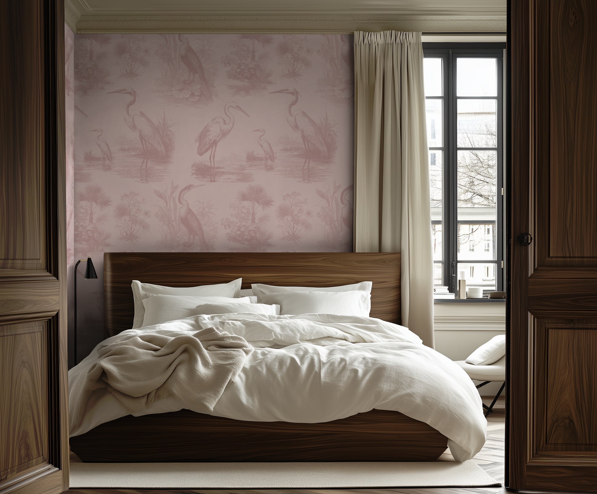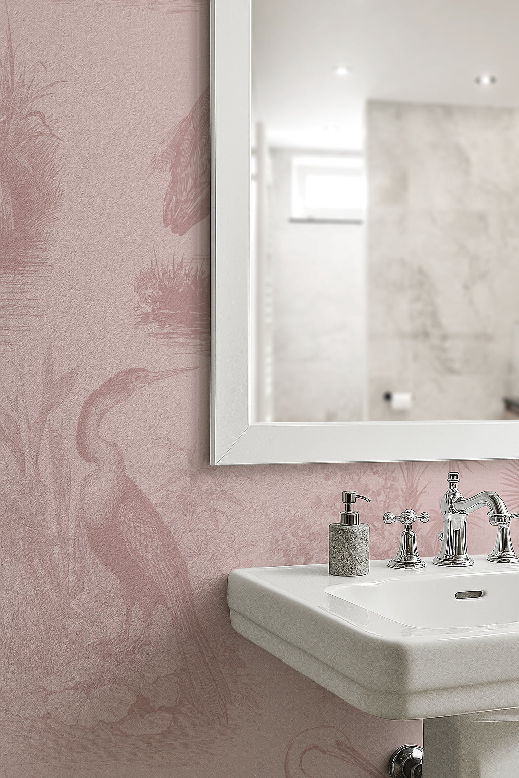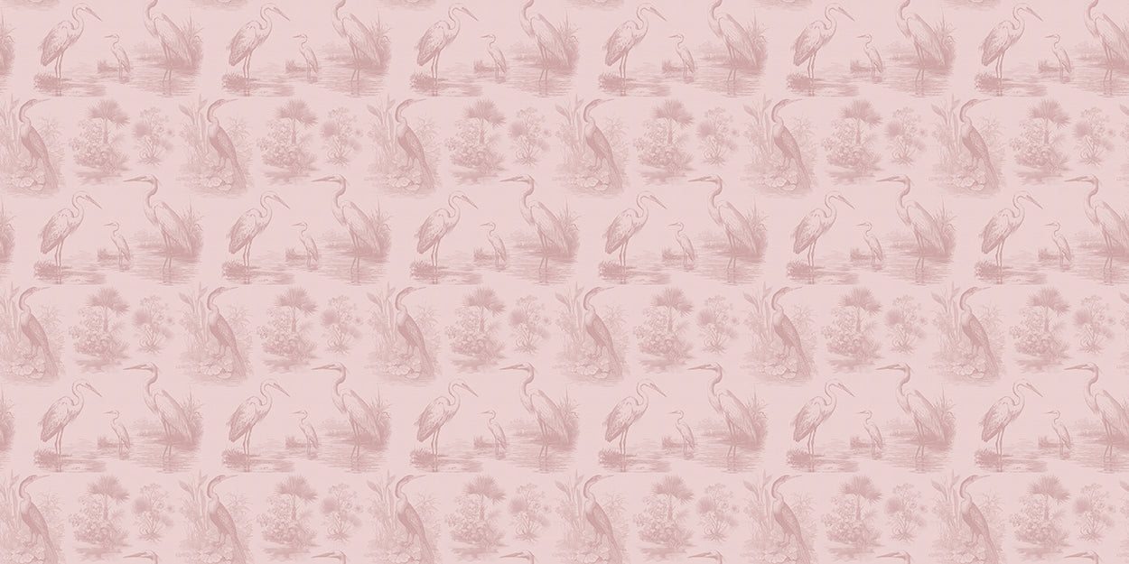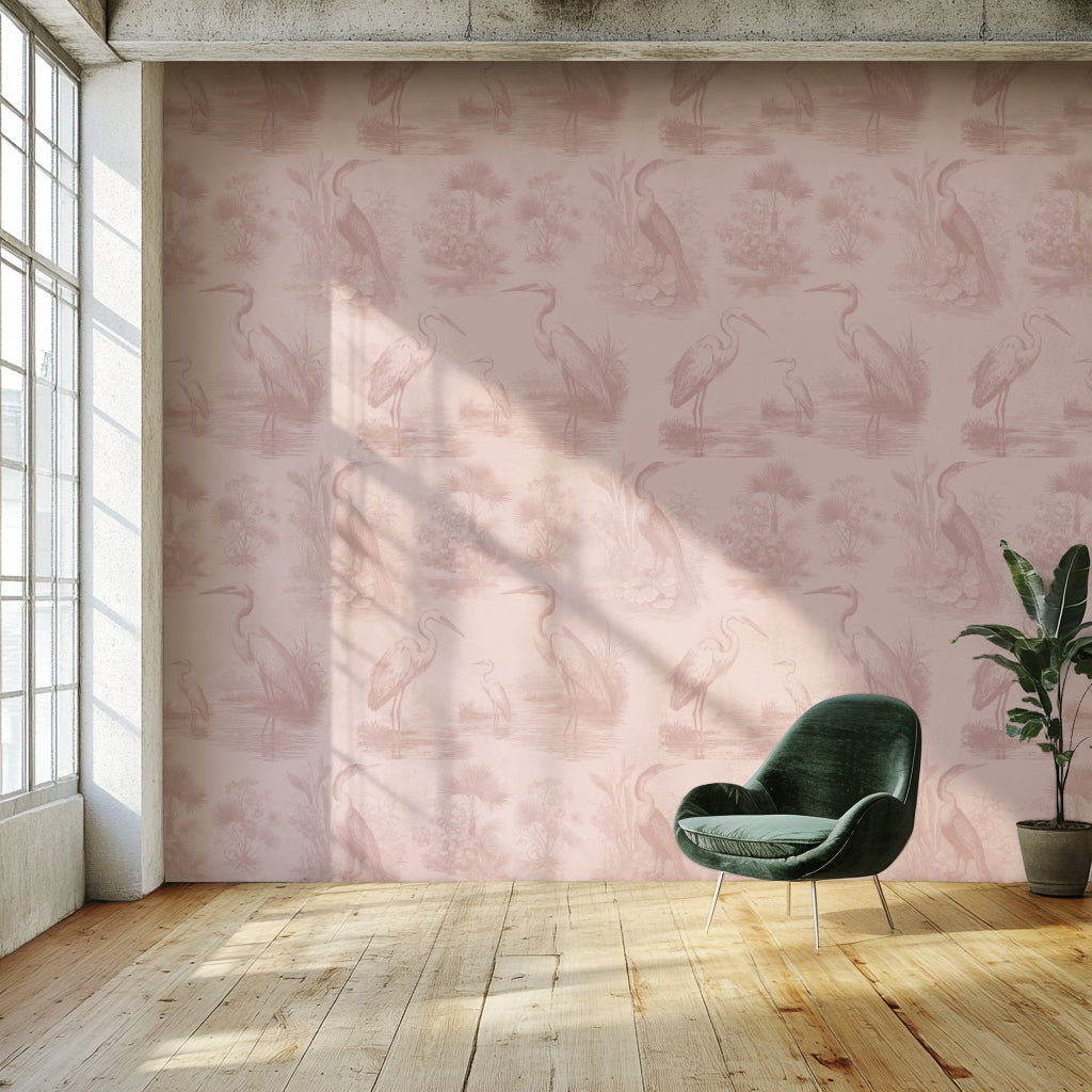 Morning Chorus – Rosewood on Soft Blush softens wetland wildlife into warm, tonal blush — herons, reeds, and rippling water drawn in muted rosewood. The result is delicate and calming, perfect for interiors seeking organic detail without bold color.