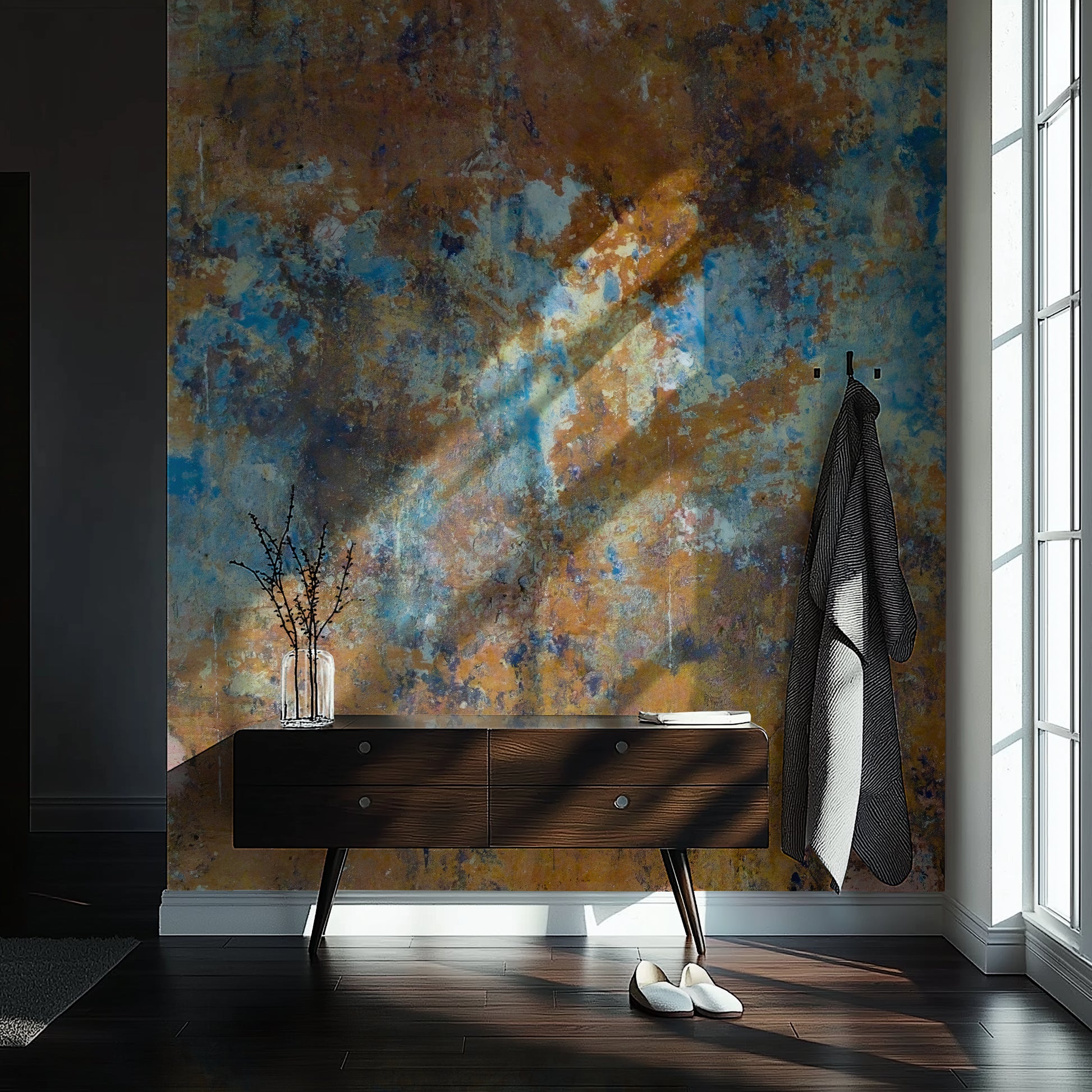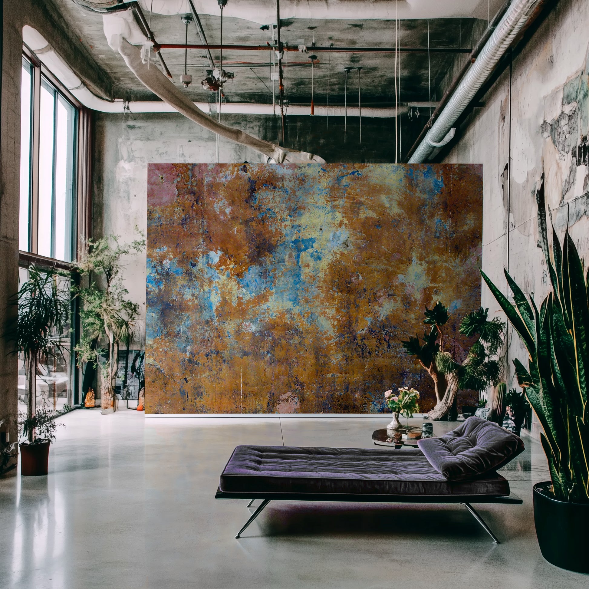 Colors collide in a swirl of bronze, teal, rust, and midnight—Oxide Bloom is decay turned art. This oxidized mural feels like found abstract expressionism, turning corrosion into visual poetry. A bold statement wall that softens through color and time.