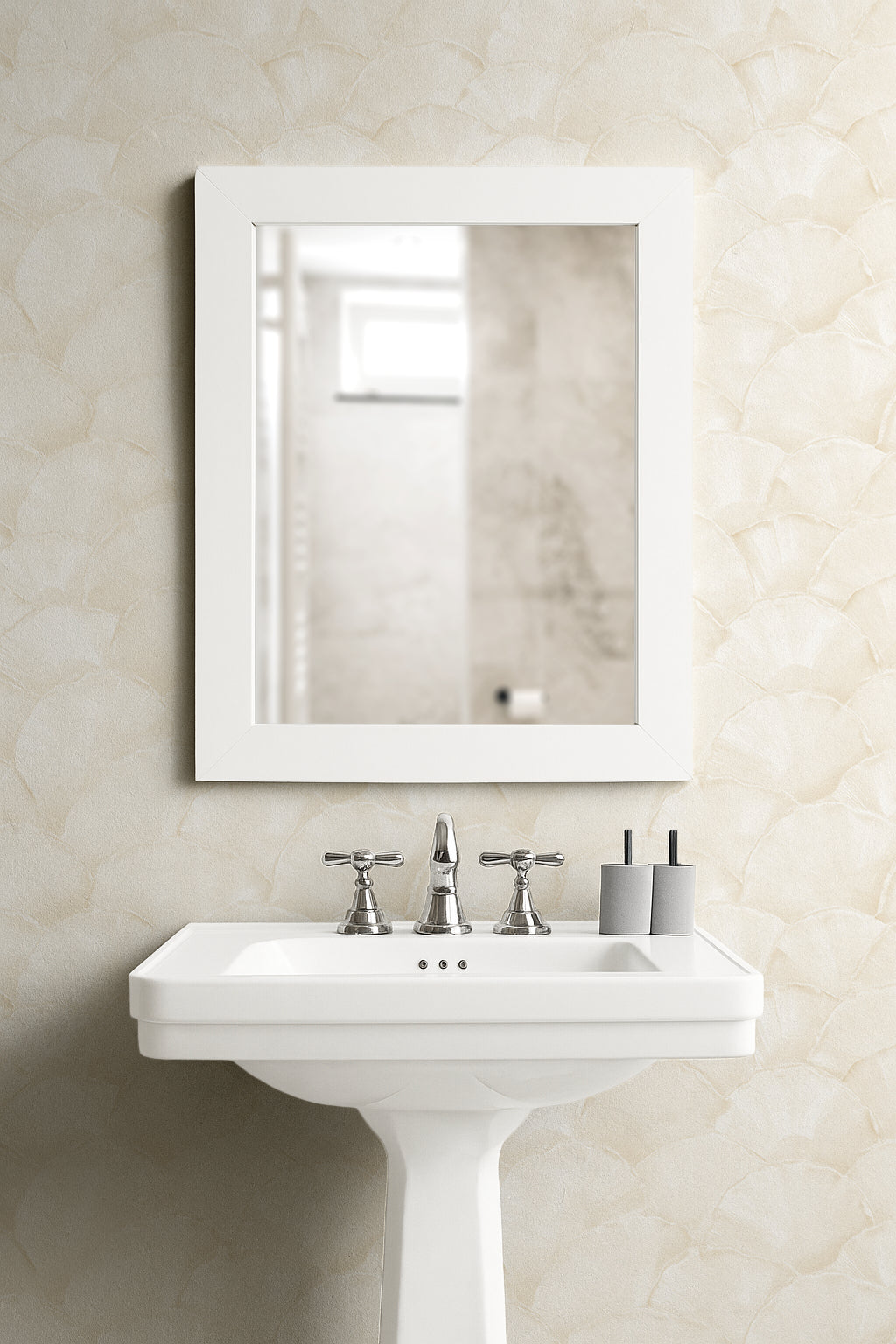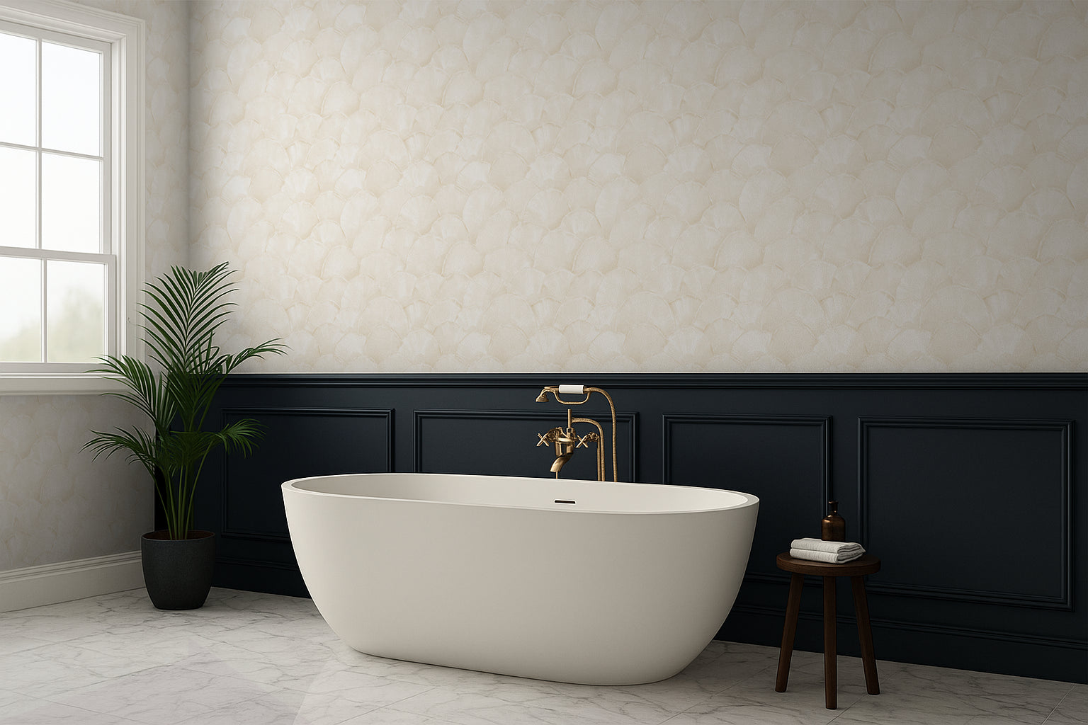 Shoreline Fan – Champagne Shell on Almond Cream softens seashell geometry into warm, tonal neutrals — creamy arcs touched with champagne warmth that feel both organic and luxurious. It’s subtle enough for serene spaces, but special enough to hold its own as a feature wall.