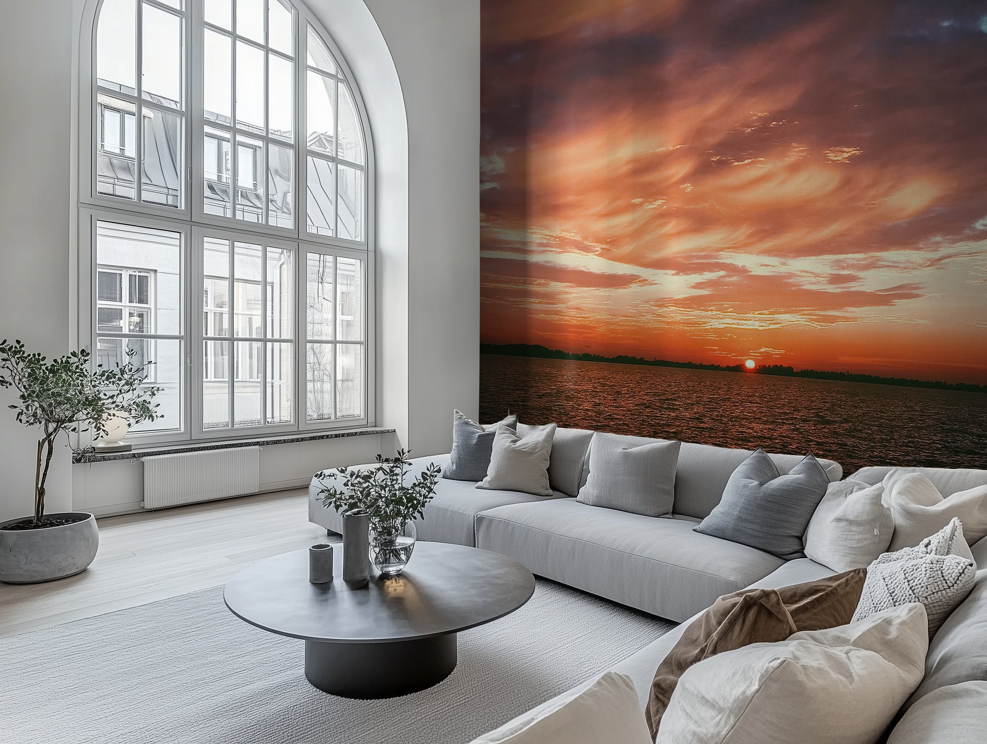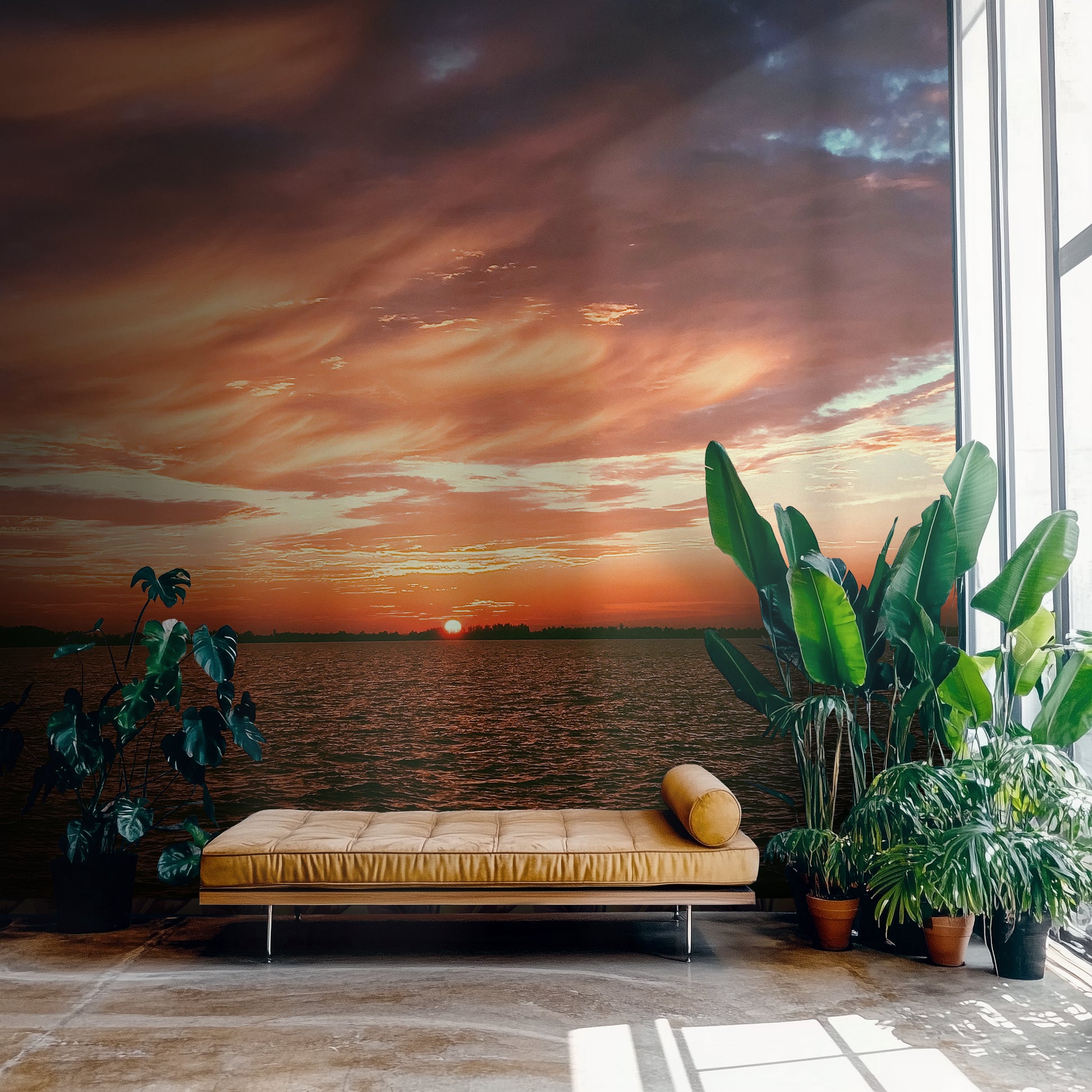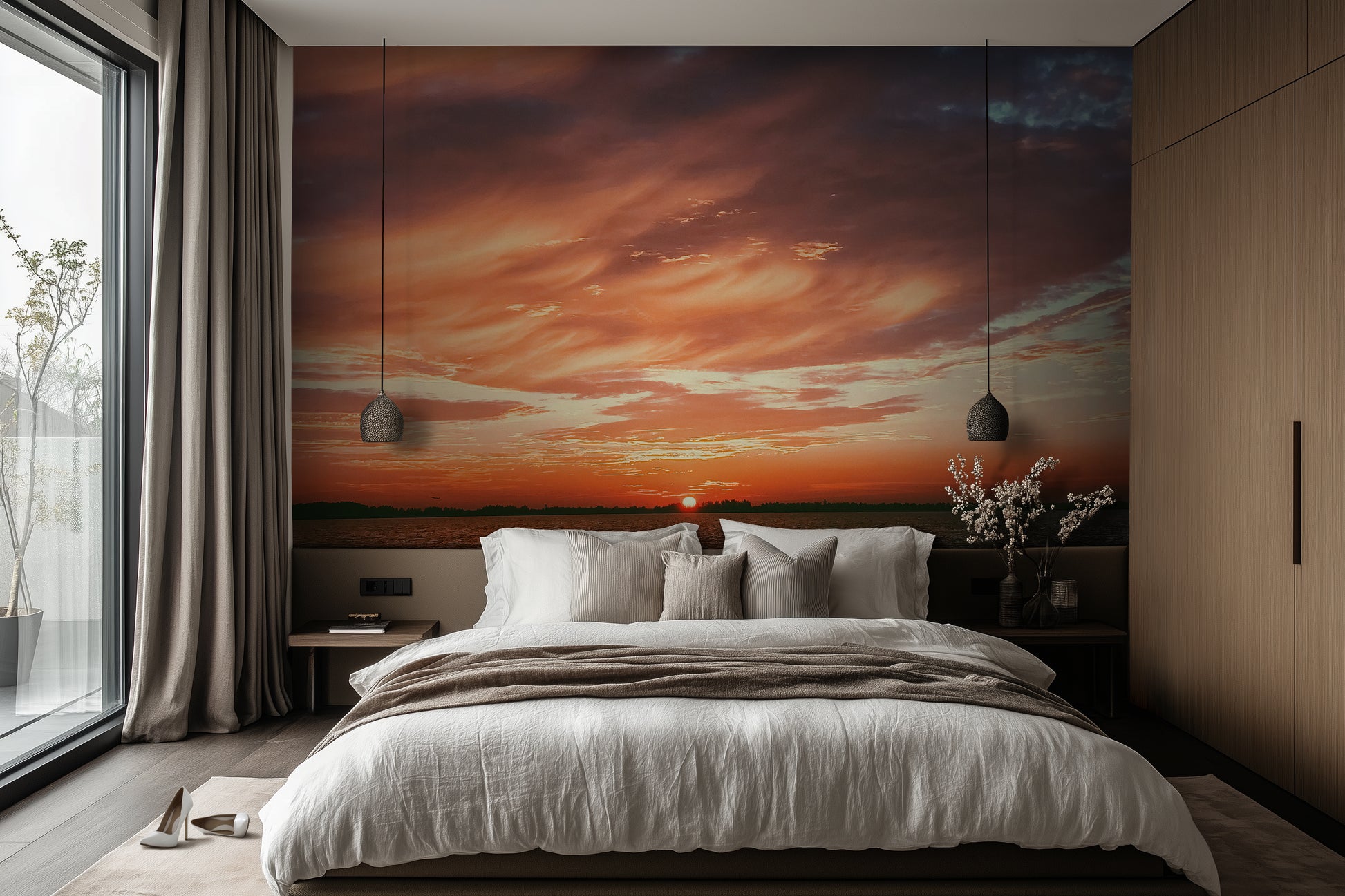 How it fits into current design trends: Fire-toned skies and expressive sunset palettes are rising in maximalist and vintage-inspired design. This wallpaper channels that beautifully.