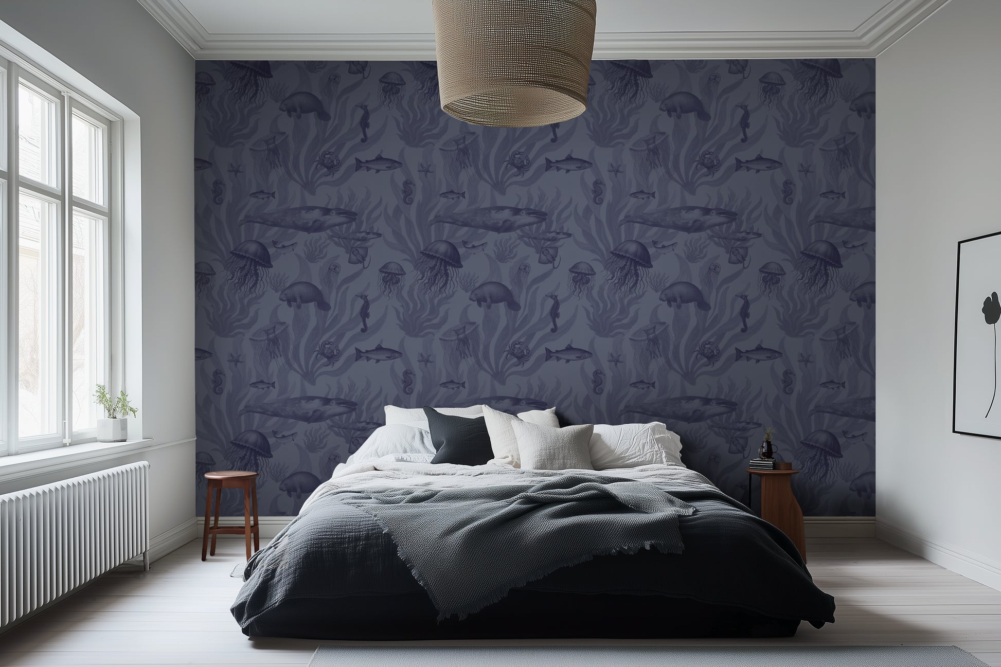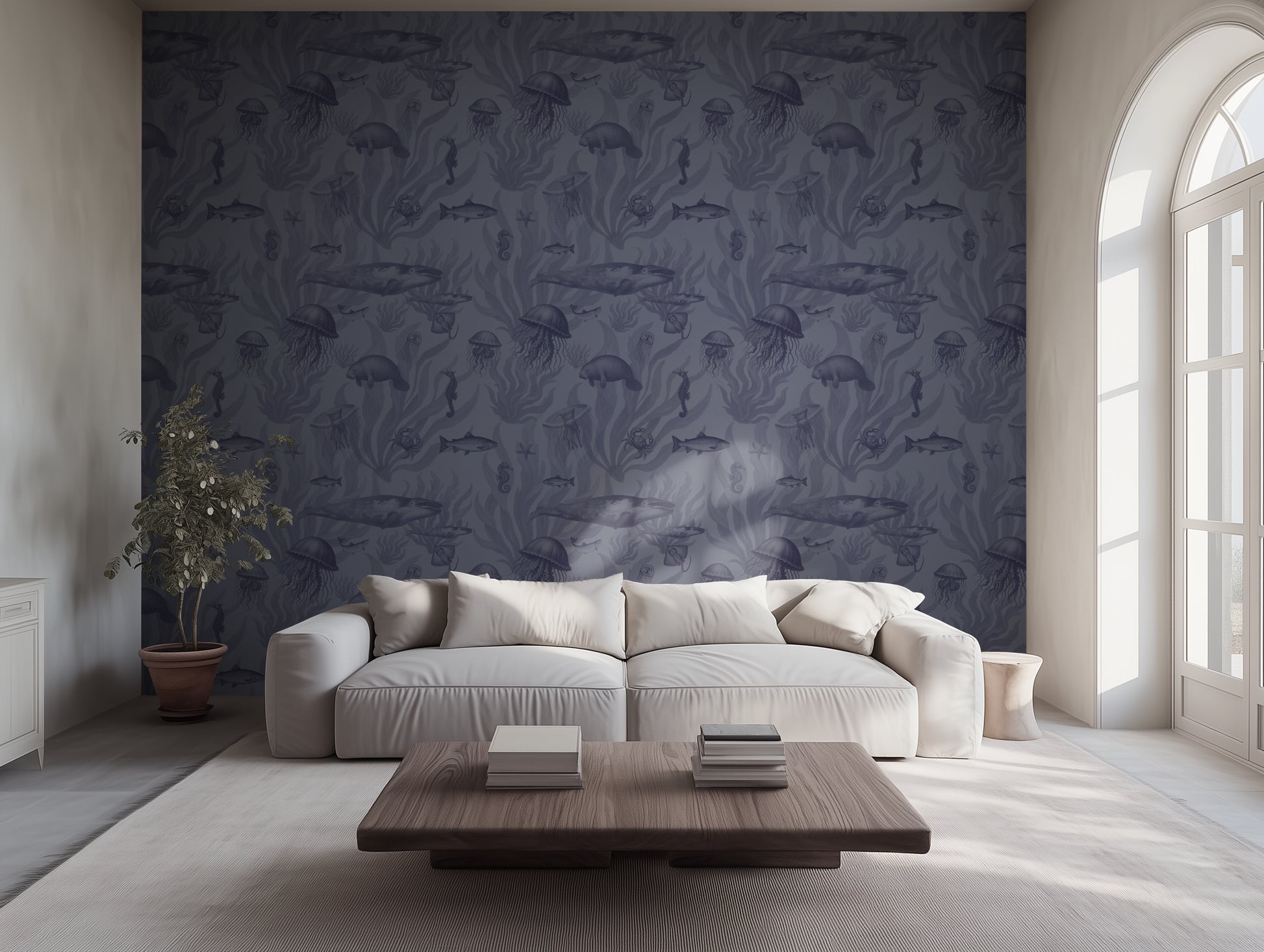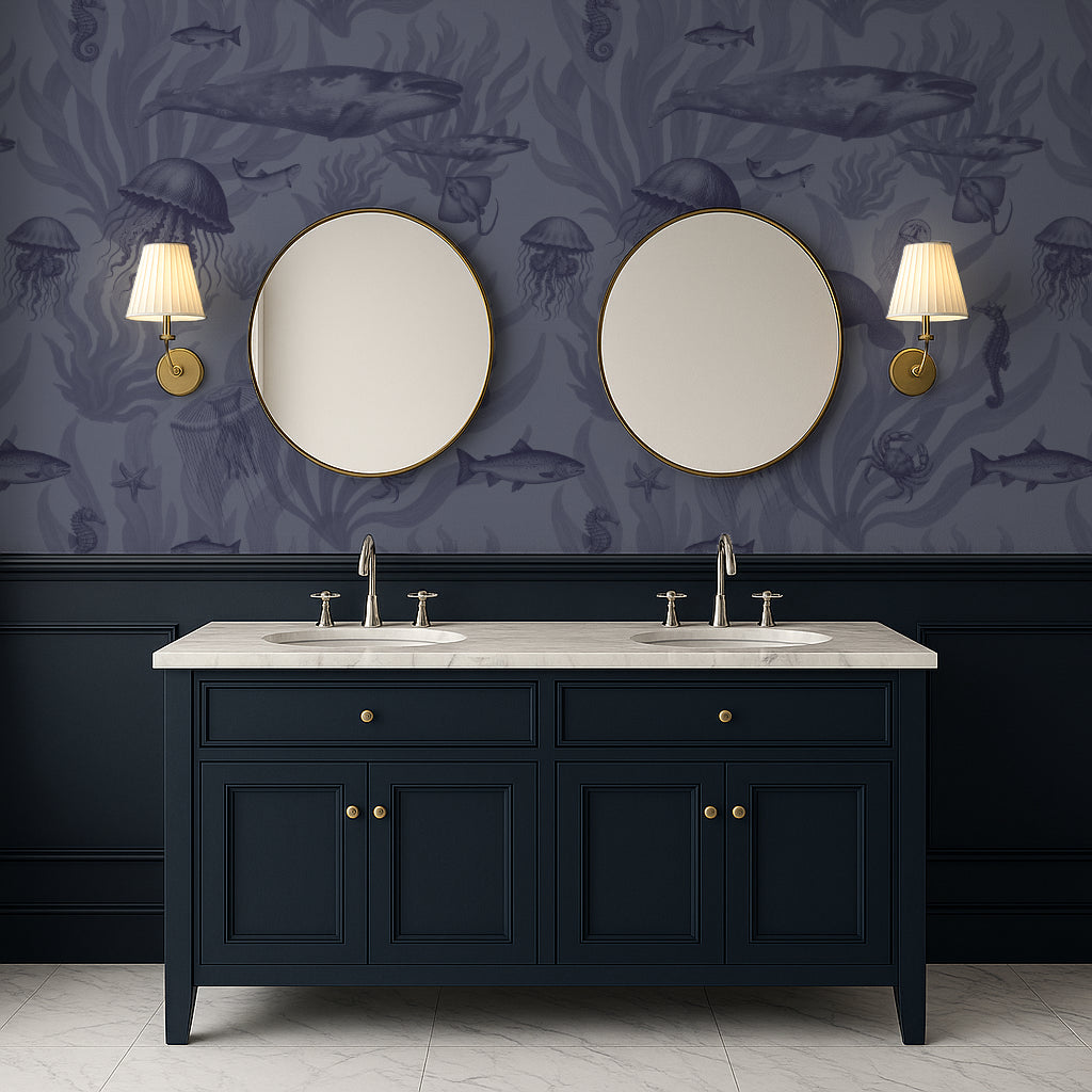 Tidepool Reverie – Deep Indigo on Periwinkle Grey dives into the ocean’s deeper hues — manatees, jellyfish, and coral rendered in indigo against soft periwinkle. The result is moody yet tranquil, perfect for creating depth in coastal-inspired rooms.
