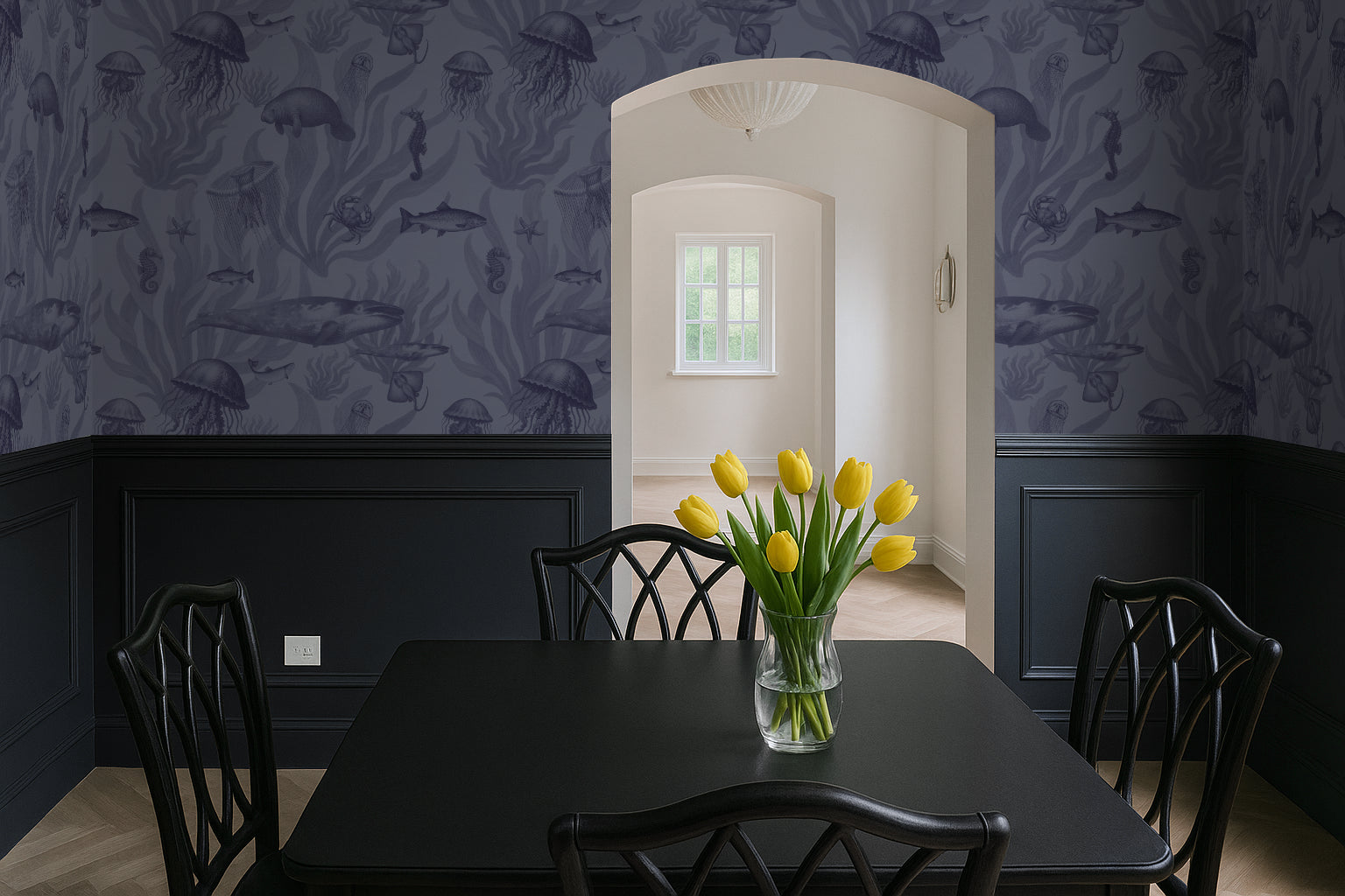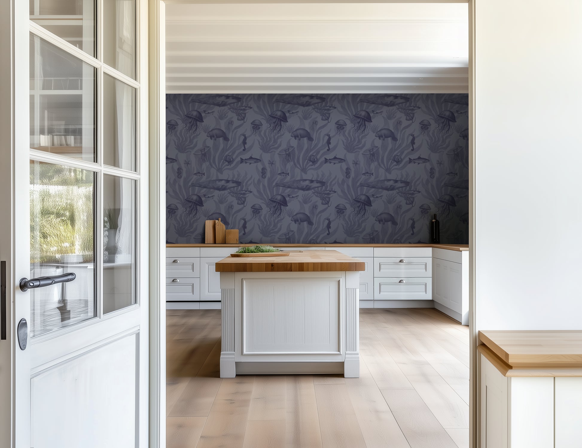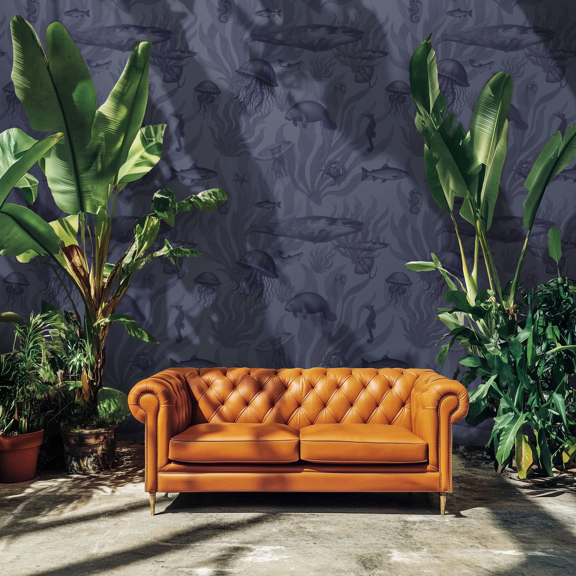 The indigo palette offers rich color with organic detail, making it ideal for bedrooms, statement hallways, or dramatic dining walls. Its marine motifs add quiet storytelling while remaining versatile enough to pair with wood, stone, or neutral textiles.