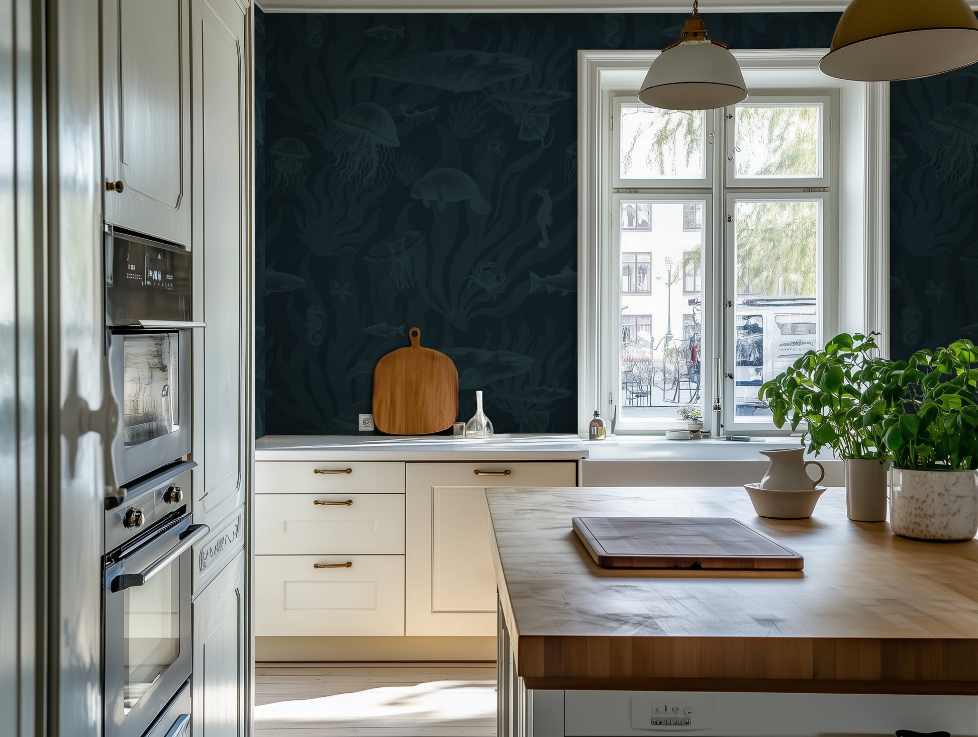 The dark navy and teal palette creates a rich, moody backdrop with intricate detail — ideal for immersive bedrooms, dramatic dining rooms, or coastal-inspired living spaces. It pairs beautifully with warm wood, sandy neutrals, and soft metallics.