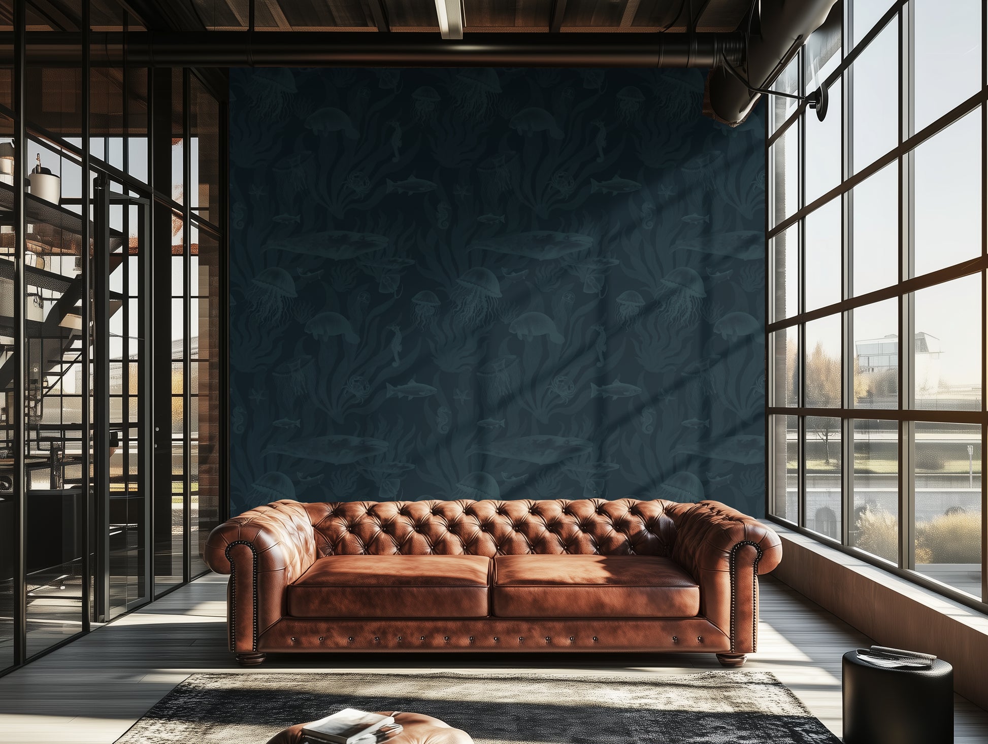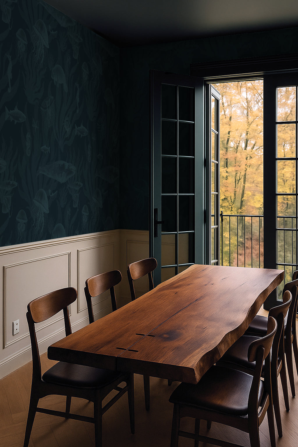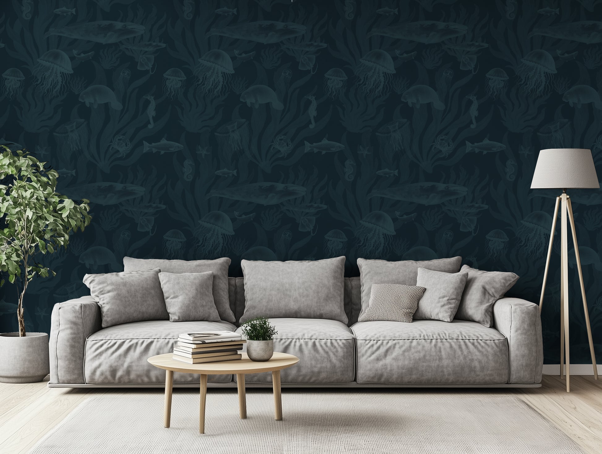 Wildlife murals and biophilic designs are surging in interiors — from tropical jungles to ocean ecosystems. Teal Coral on Deep Ocean Navy delivers that trend with a moody, oceanic twist, perfect for homes craving depth and quiet storytelling.