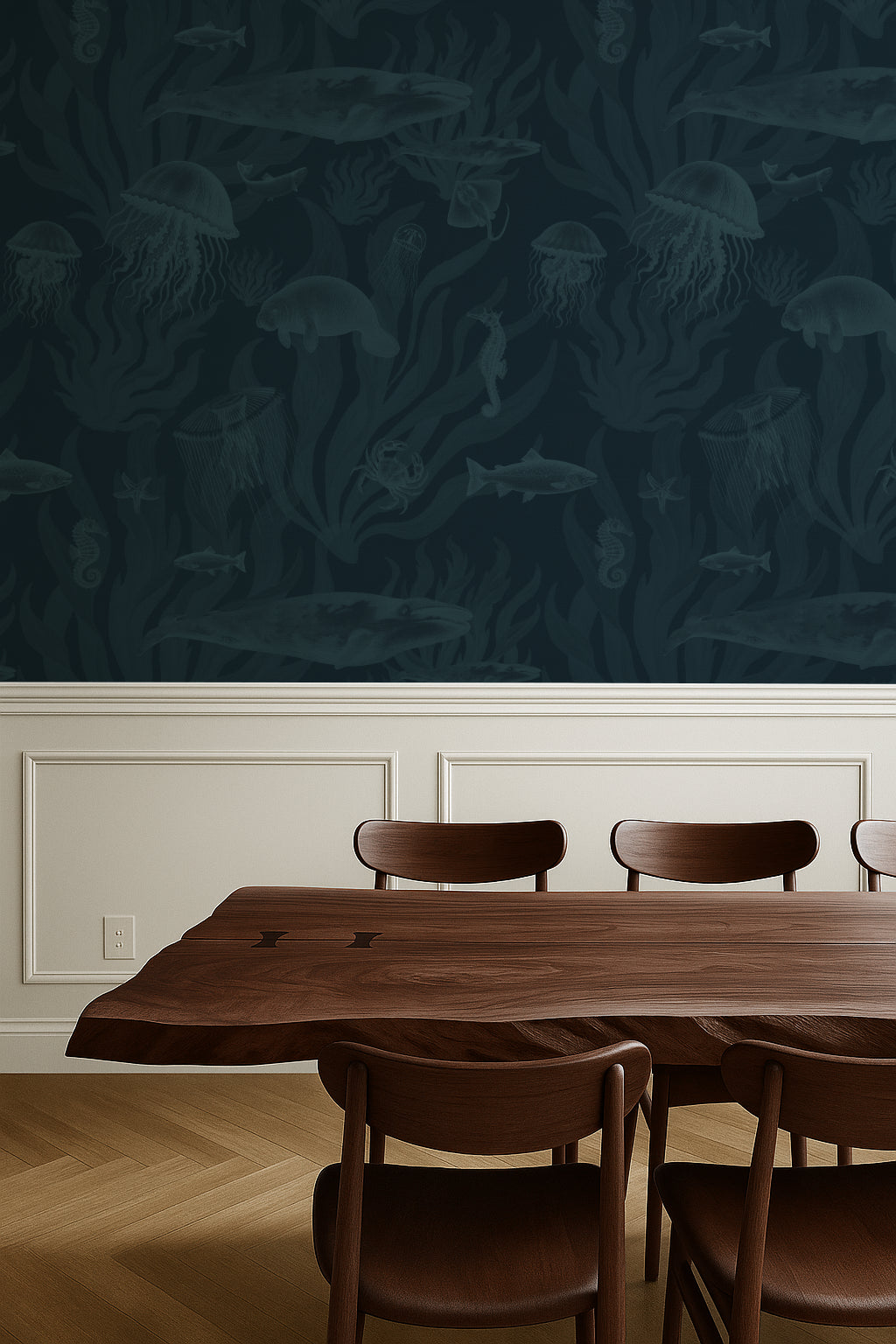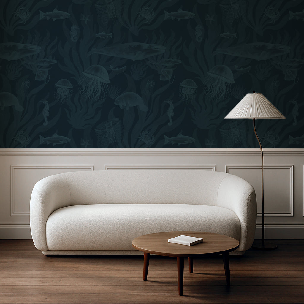 Tidepool Reverie – Teal Coral on Deep Ocean Navy plunges into an underwater world teeming with life — jellyfish drifting, whales gliding, seahorses curled into coral, and manatees floating in the current. Set in deep navy with teal detailing, it captures the quiet magic of tidepools and coastal shallows, bringing an entire ecosystem to your walls.